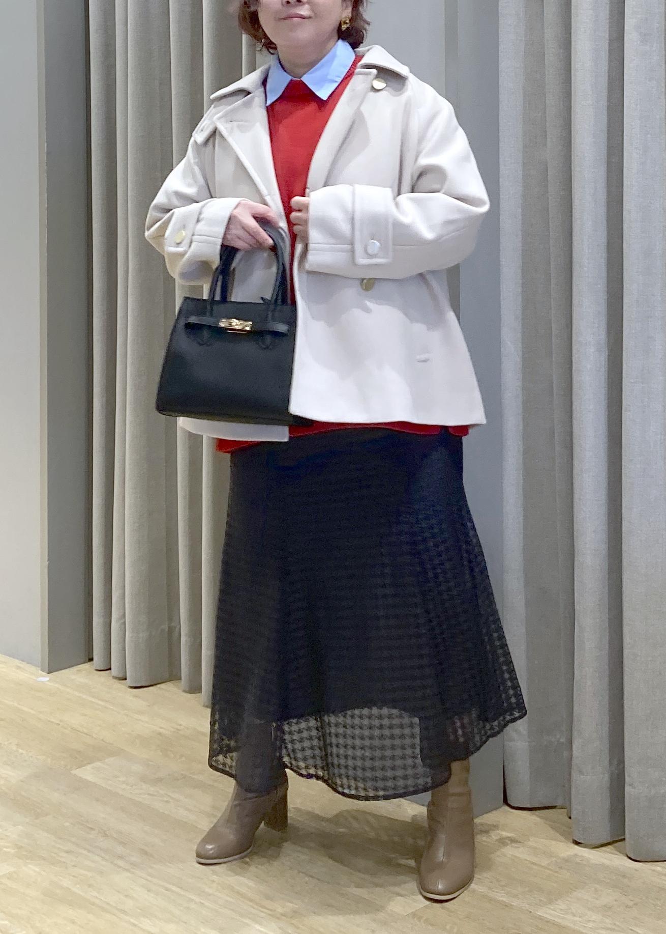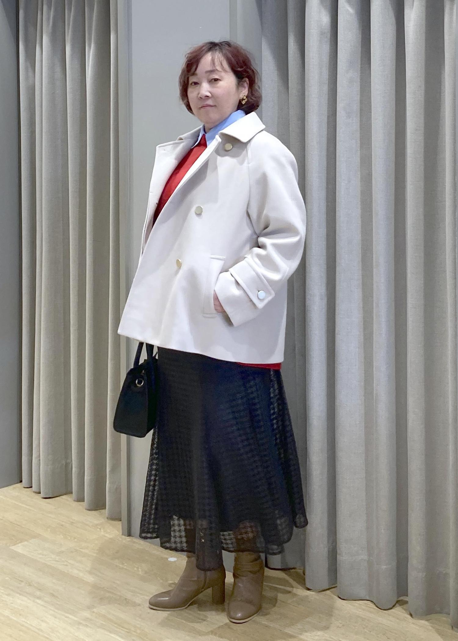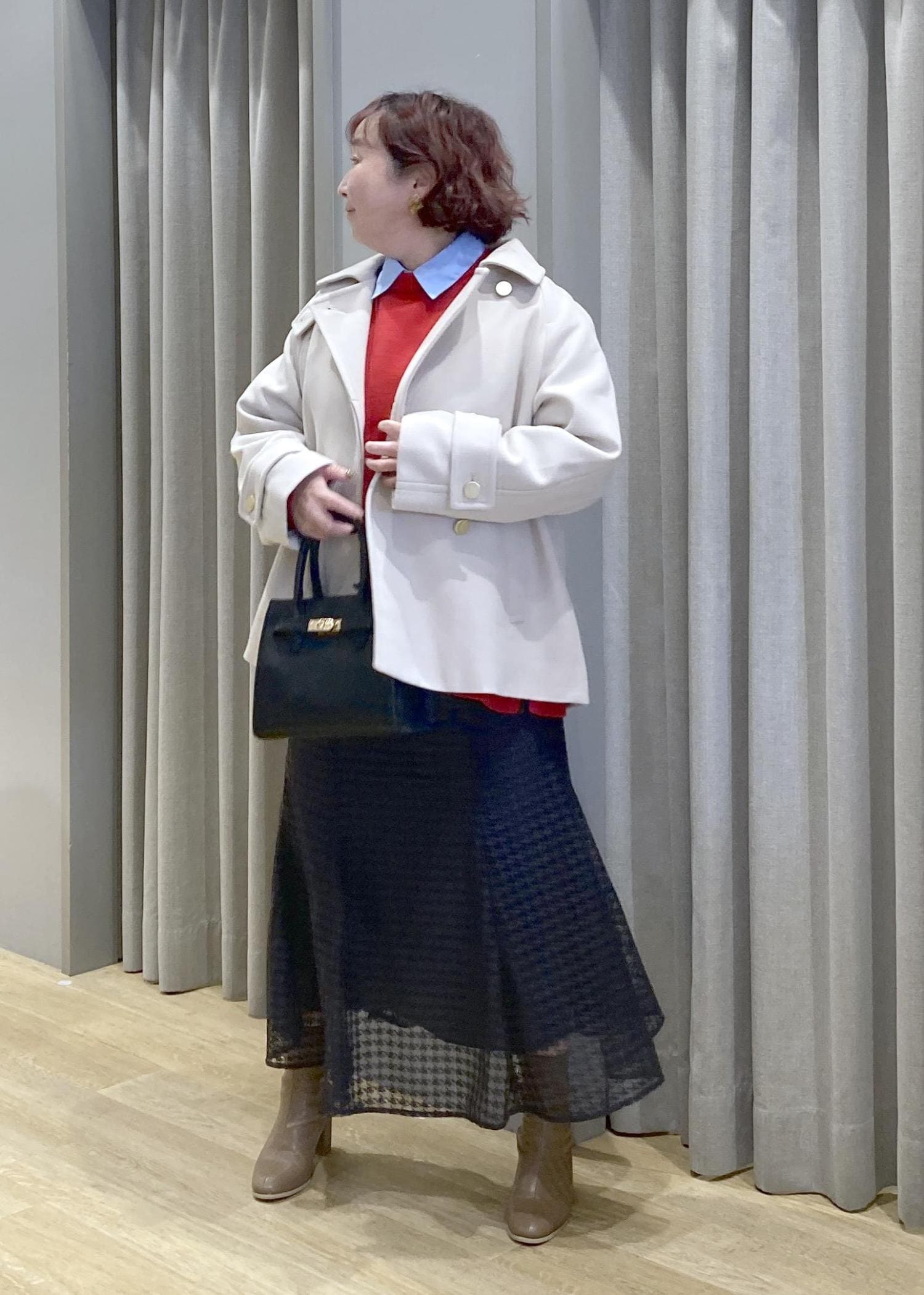 赤ニット×シャツのレイヤードで顔まわりを明るくして、ショート丈のコートでバランスアップさせてみました。