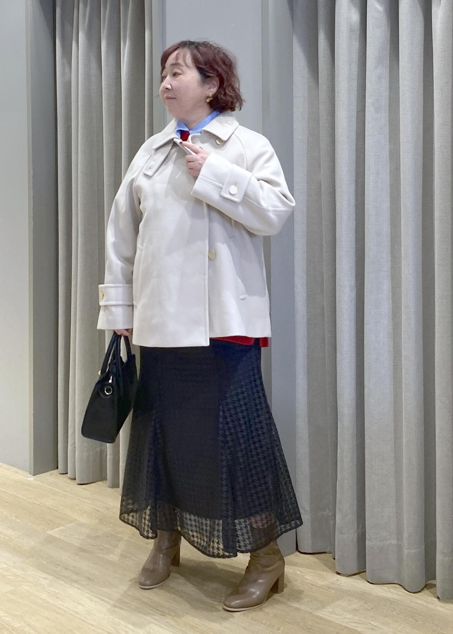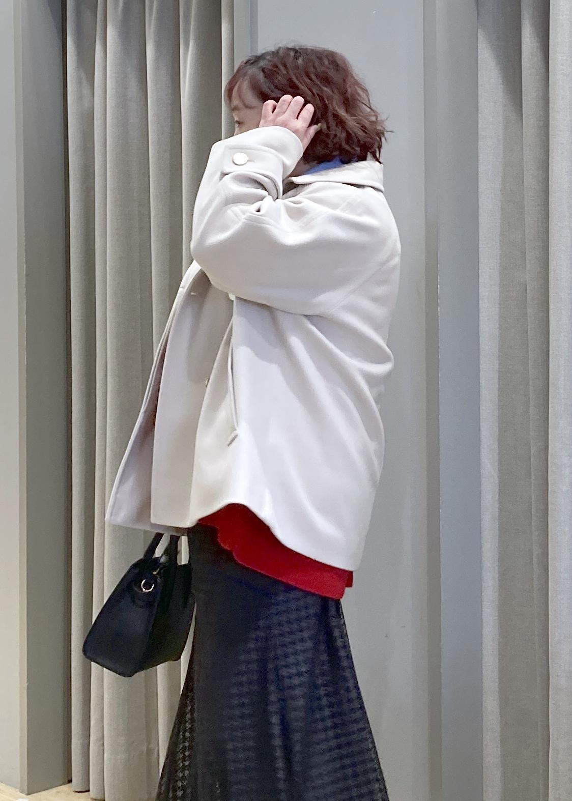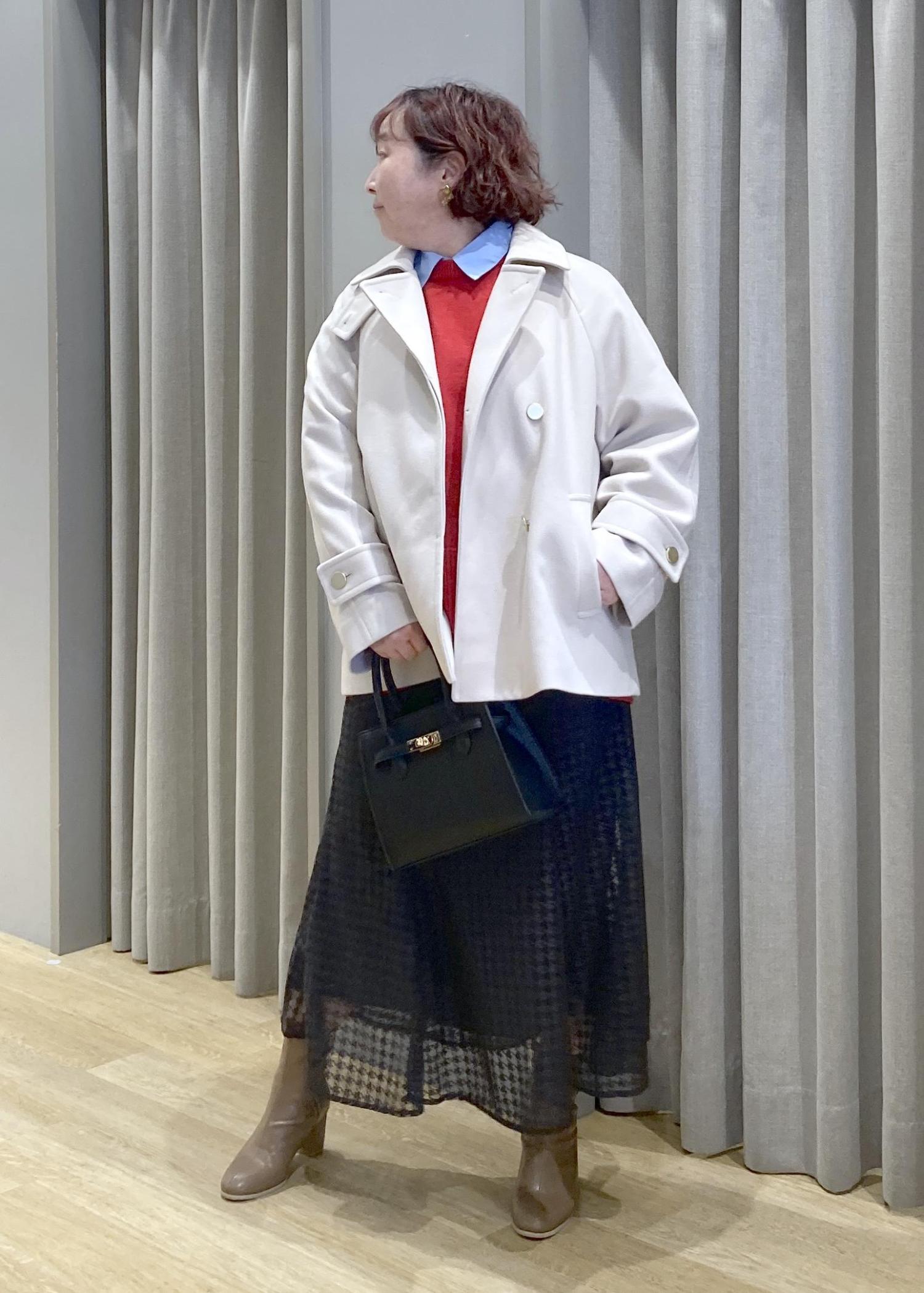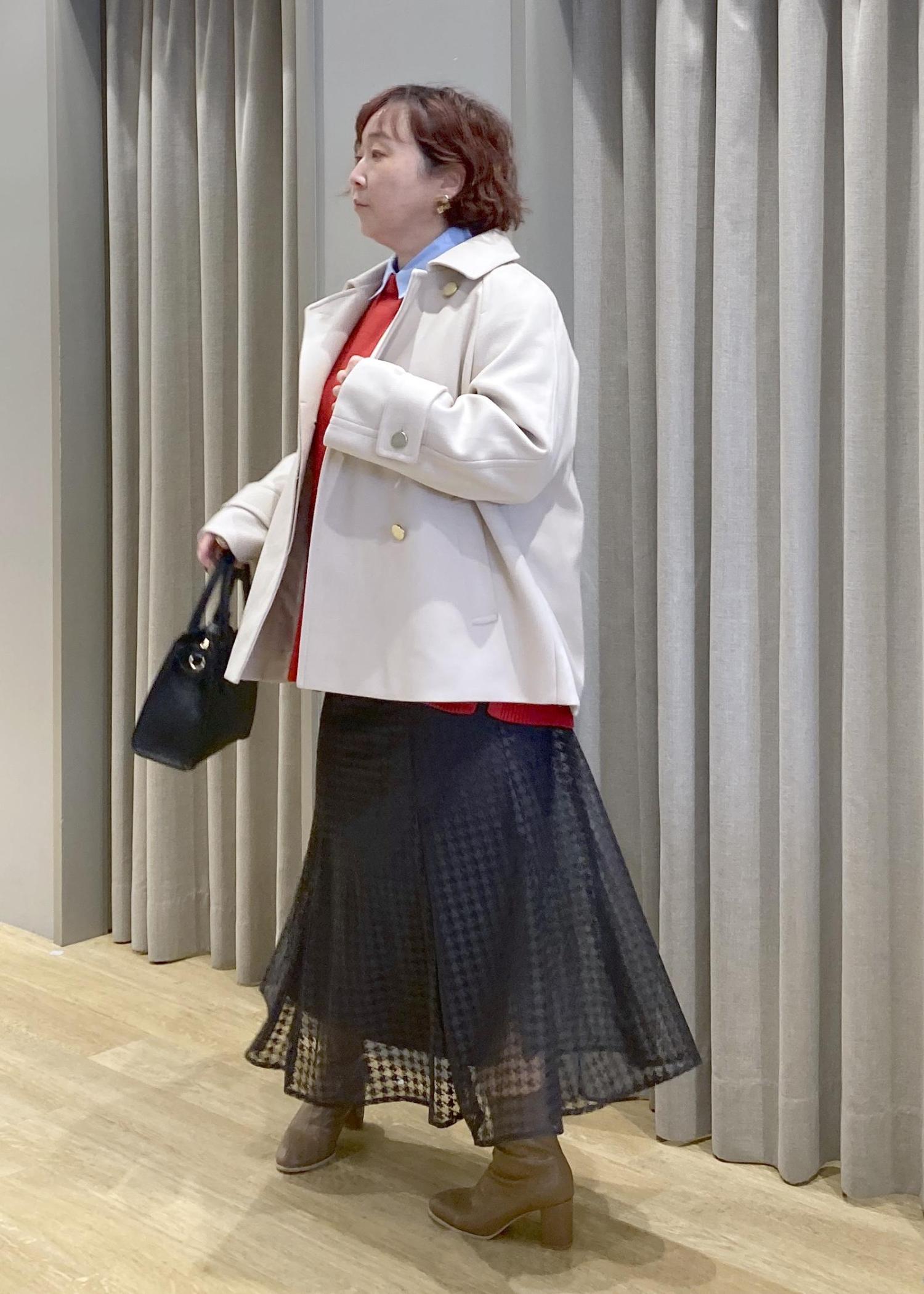 赤ニット×シャツのレイヤードで顔まわりを明るくして、ショート丈のコートでバランスアップさせてみました。
