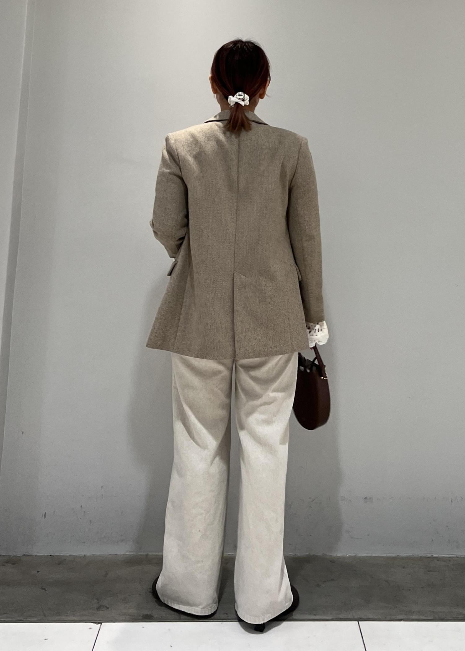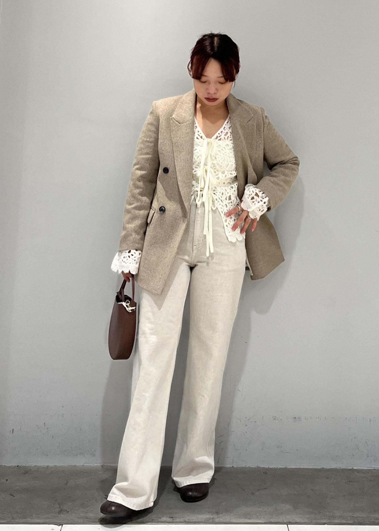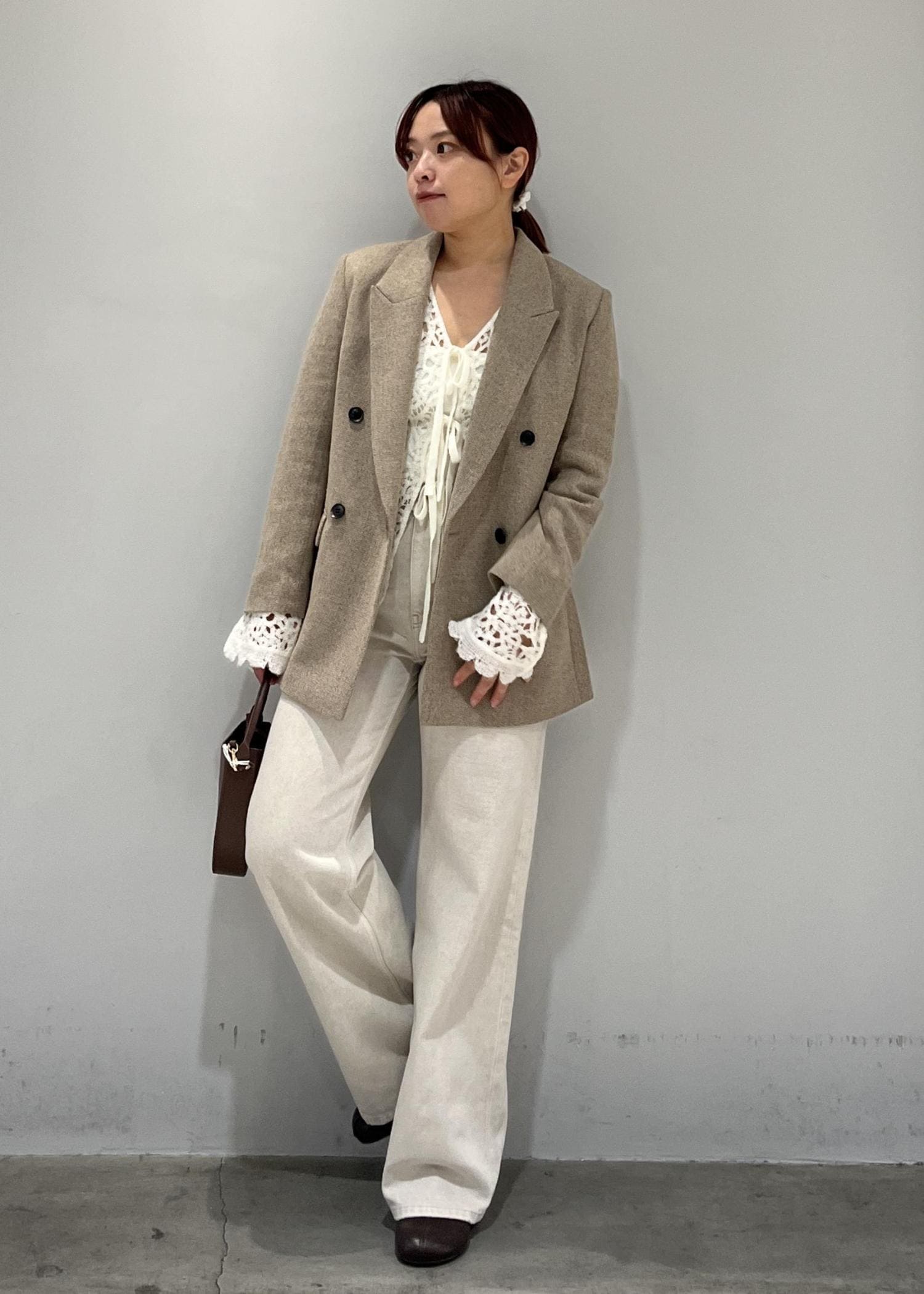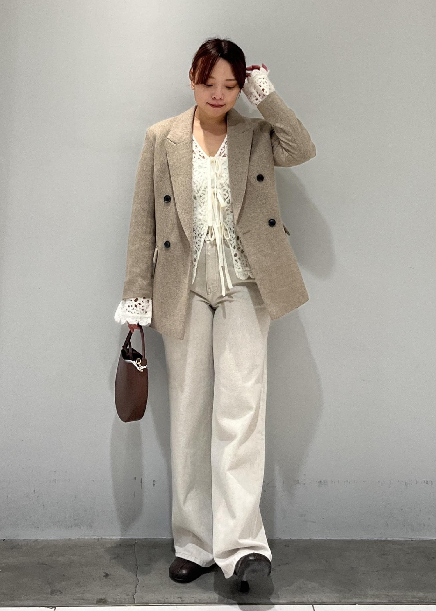 ラインの綺麗なパンツとカチッとシルエットのジャケットでハンサムに、でもトップスはレースとリボンという女性ならではのアイテムでポイントにしてみました☺︎
