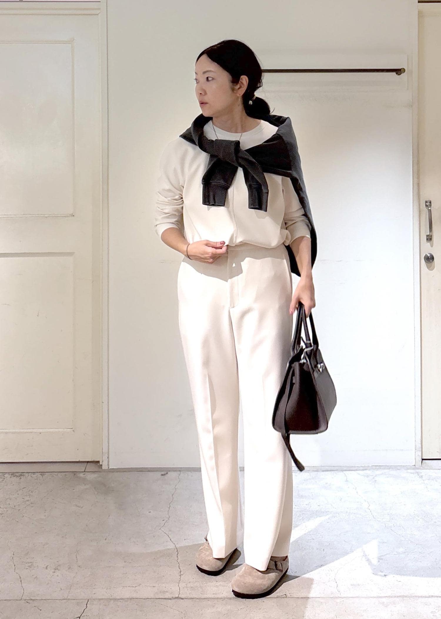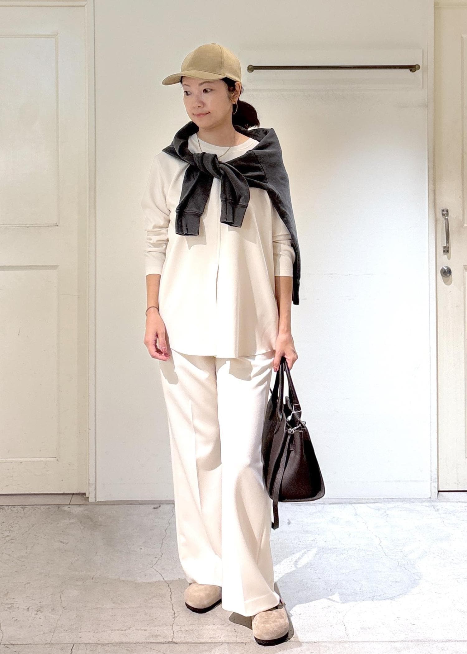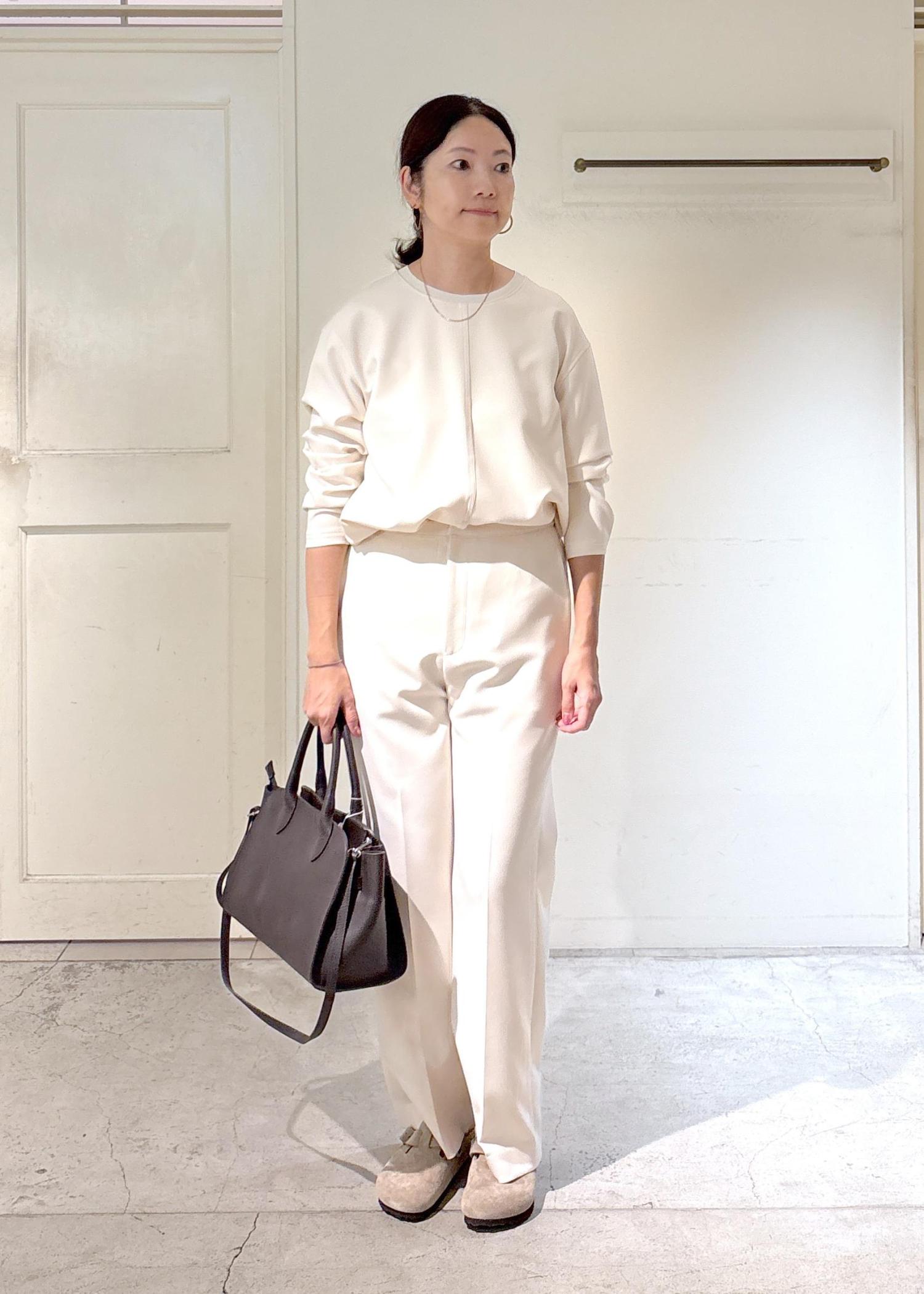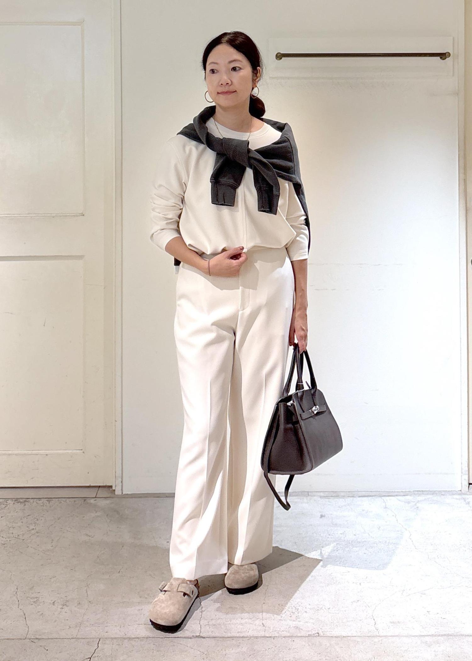 SALON adam et ropéストレッチセミフレアスタイルアップパンツ / セットアップ対応オフホワイト / M¥19,800レビュー163cmでくるぶし下。バレエシューズでも裾が地面につきません。少しだけ凹凸がある素材なので、オフィスでもカジュアルでもいける万能パンツです。