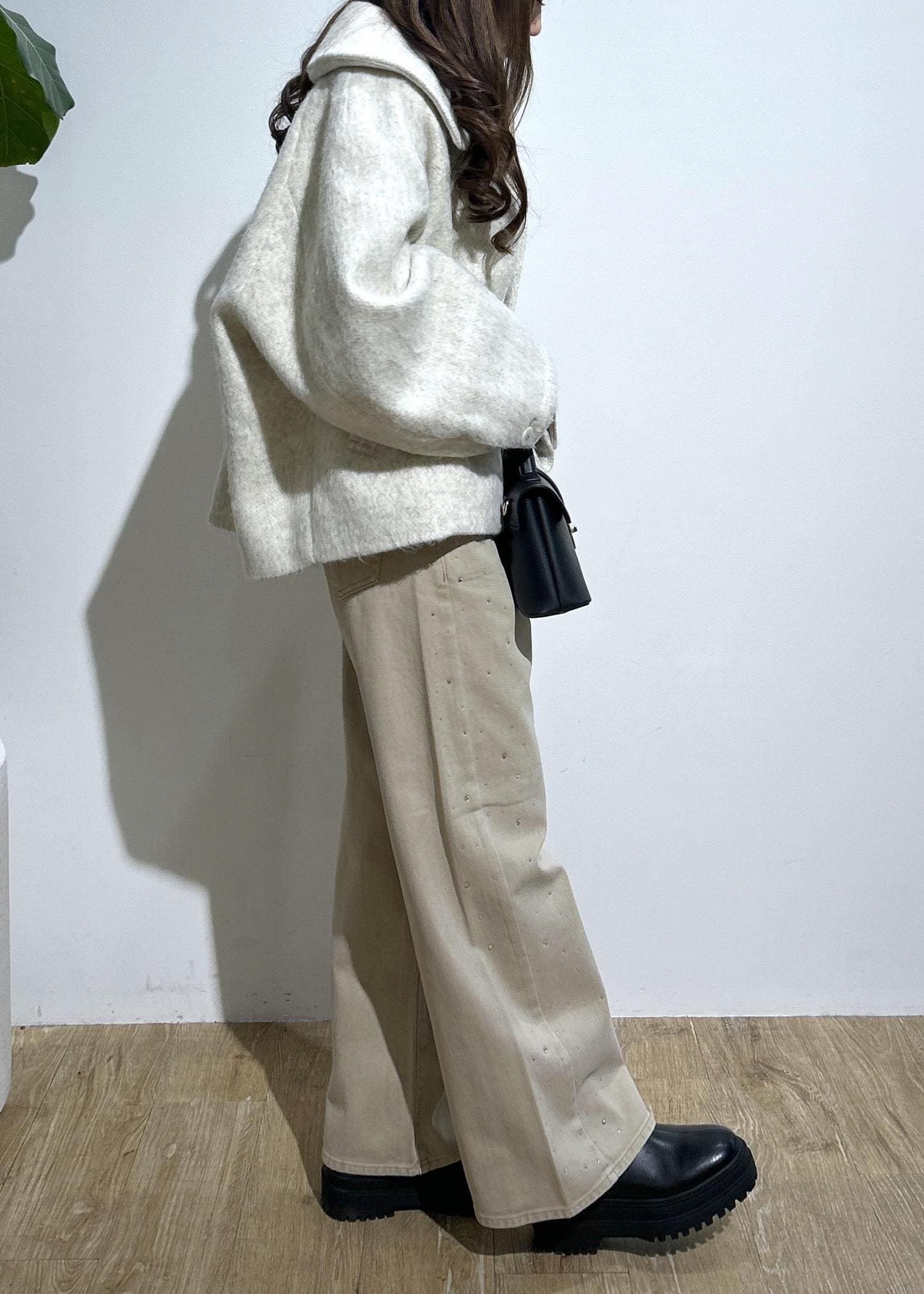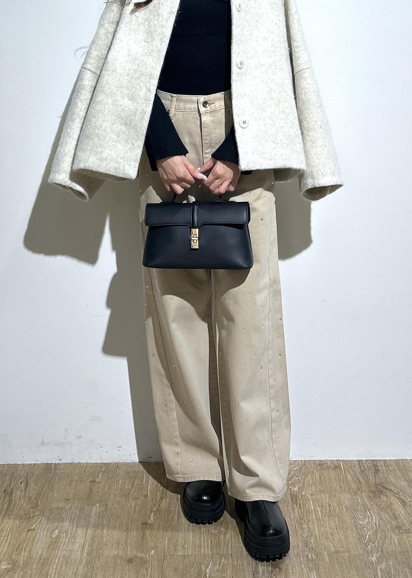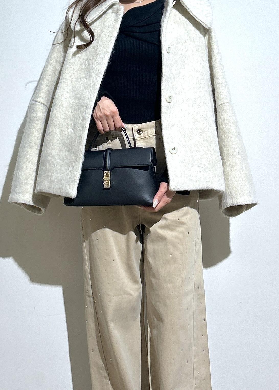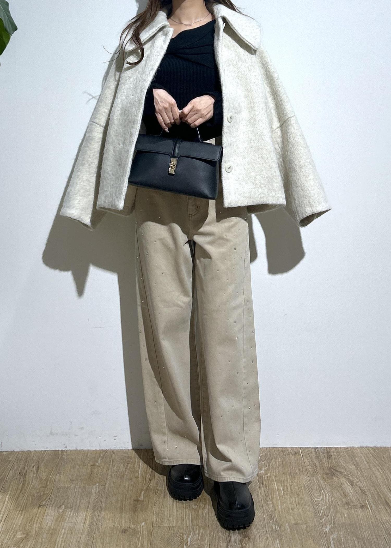 白のアウター、ベージュのボトムにアクセントとしてブラックのトップス、バッグ、ブーツを取り入れたシンプルかつキレイめカジュアルコーデにしてみました◎