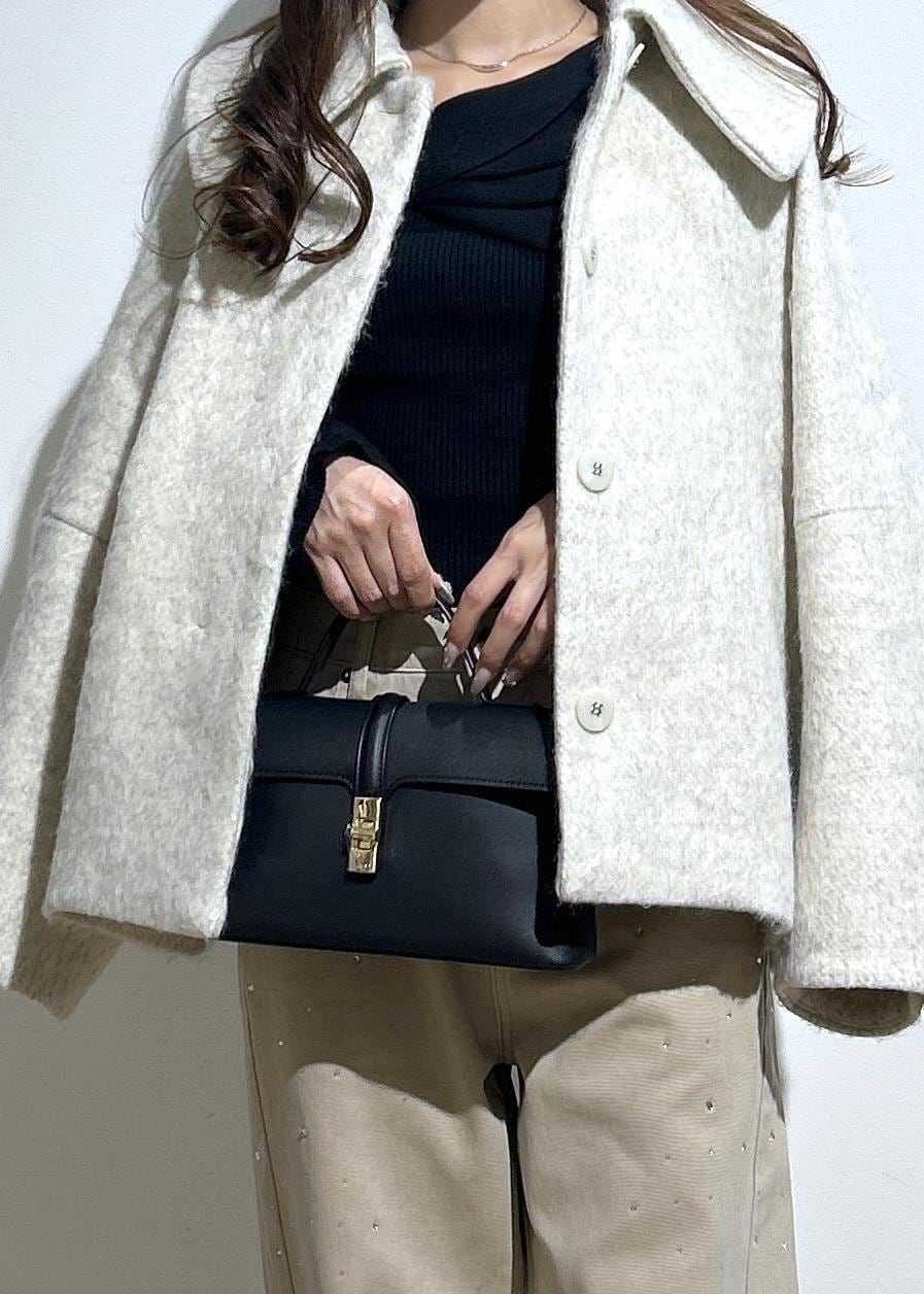 予約VIS【アウター総選挙1位】ビッグカラーモモンガシャギーショートコートオフホワイト / M¥10,989レビュービックカラーとゆったりとしたサイズ感が大人可愛いアウター。全体的にゆとりがあってインナーが分厚めでも着用しやすいです。たぽ袖がなんともいえない可愛さ!身長158㎝でMサイズ着用でヒップが隠れます。