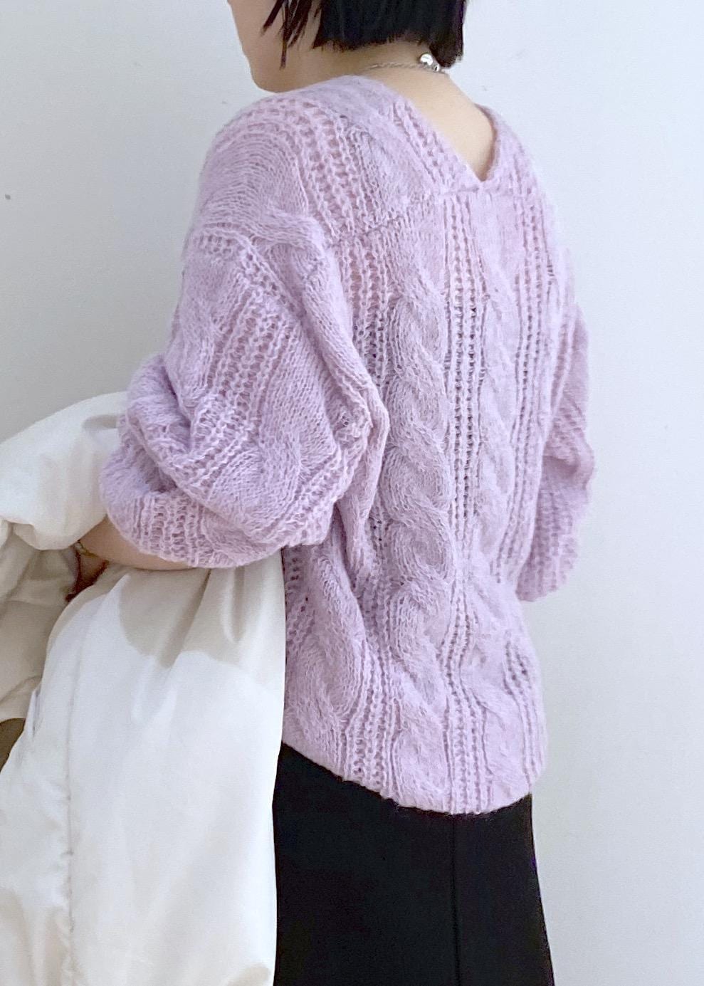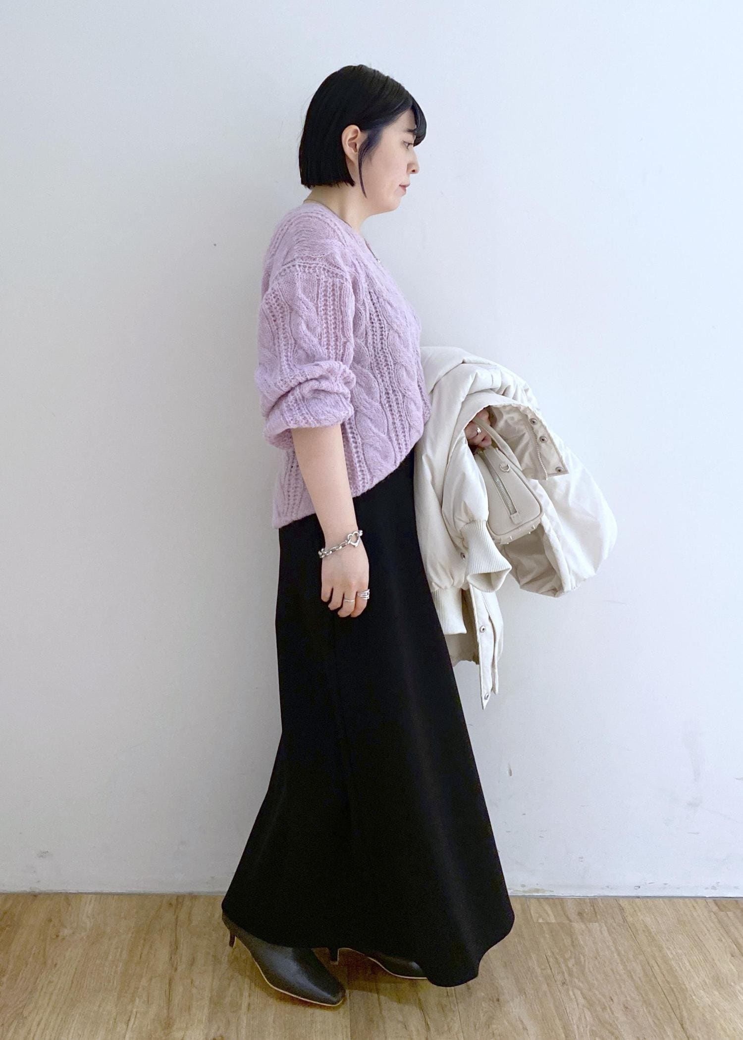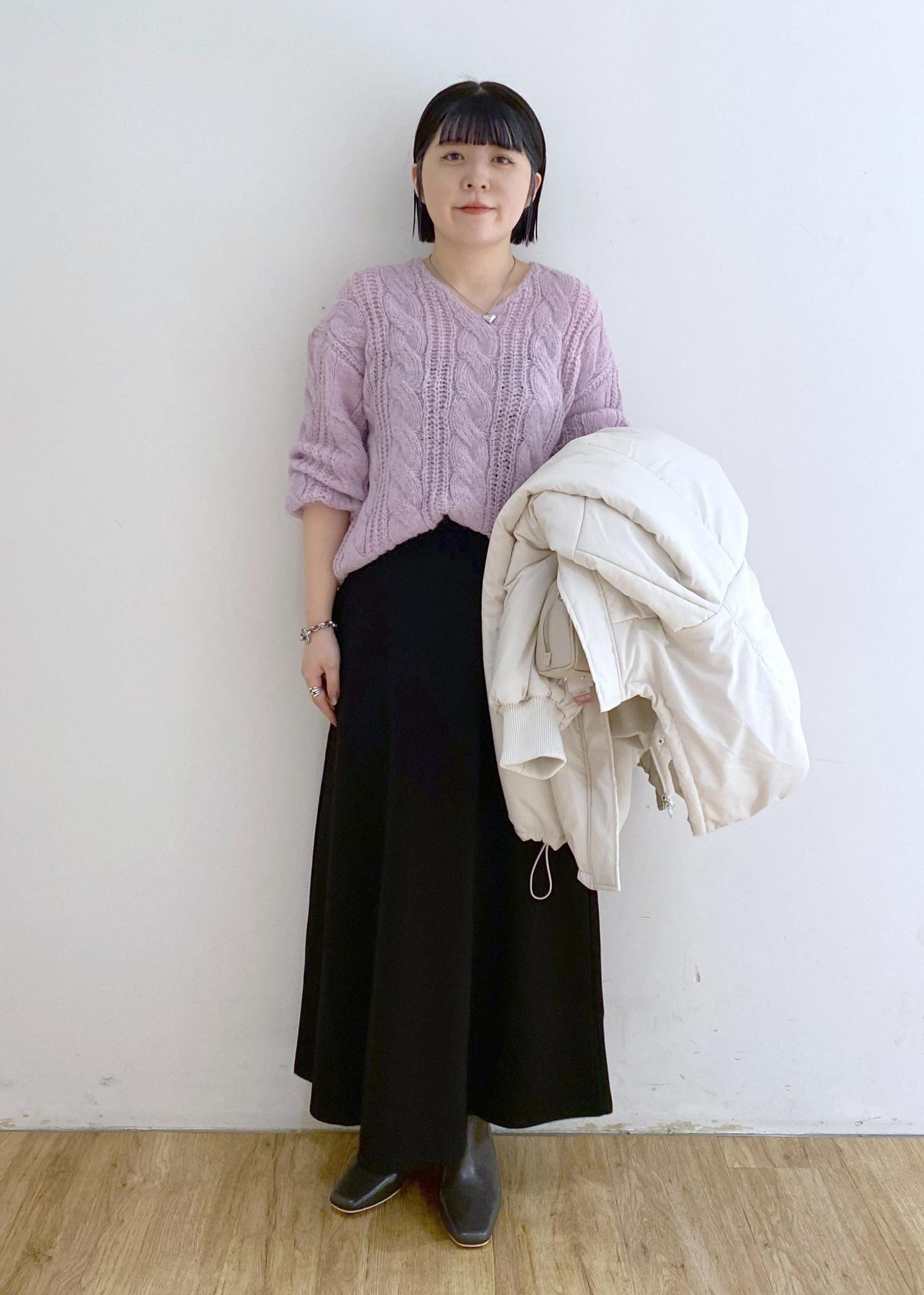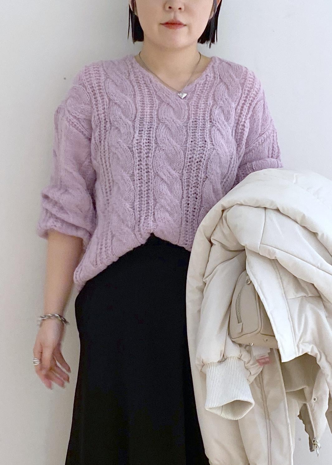 ROPÉ PICNICゆるケーブル編みVネックニットラベンダー / F¥4,391レビューこちらのキナリをリアルバイしました☺︎Vネックデザインで骨ストさんが得意なシルエット◎着丈は長めなので前だけ少しインしています。ゆとりもあるのでロンT合わせも着膨れすることなく合わせられそうです。