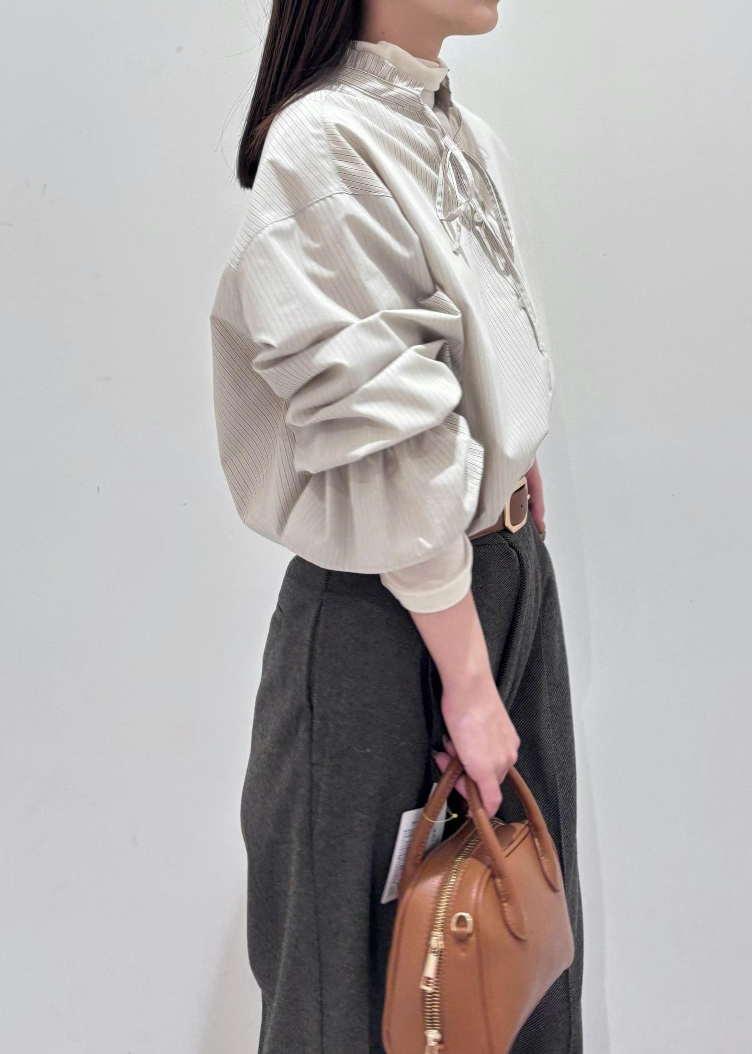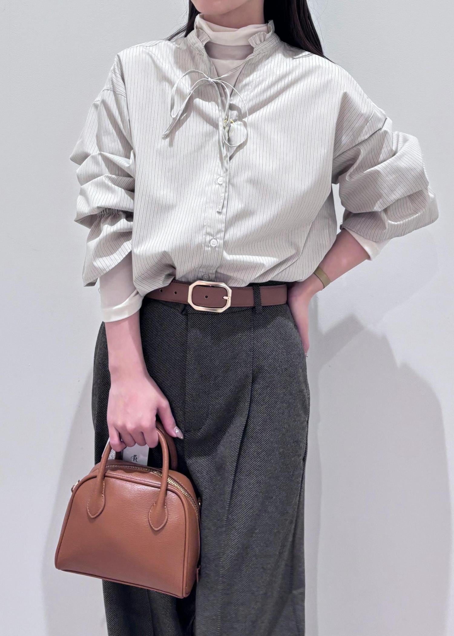 シャツにベロアのタートルネックをレイヤードする事で、シンプルながらも、どこか小洒落た印象に♪