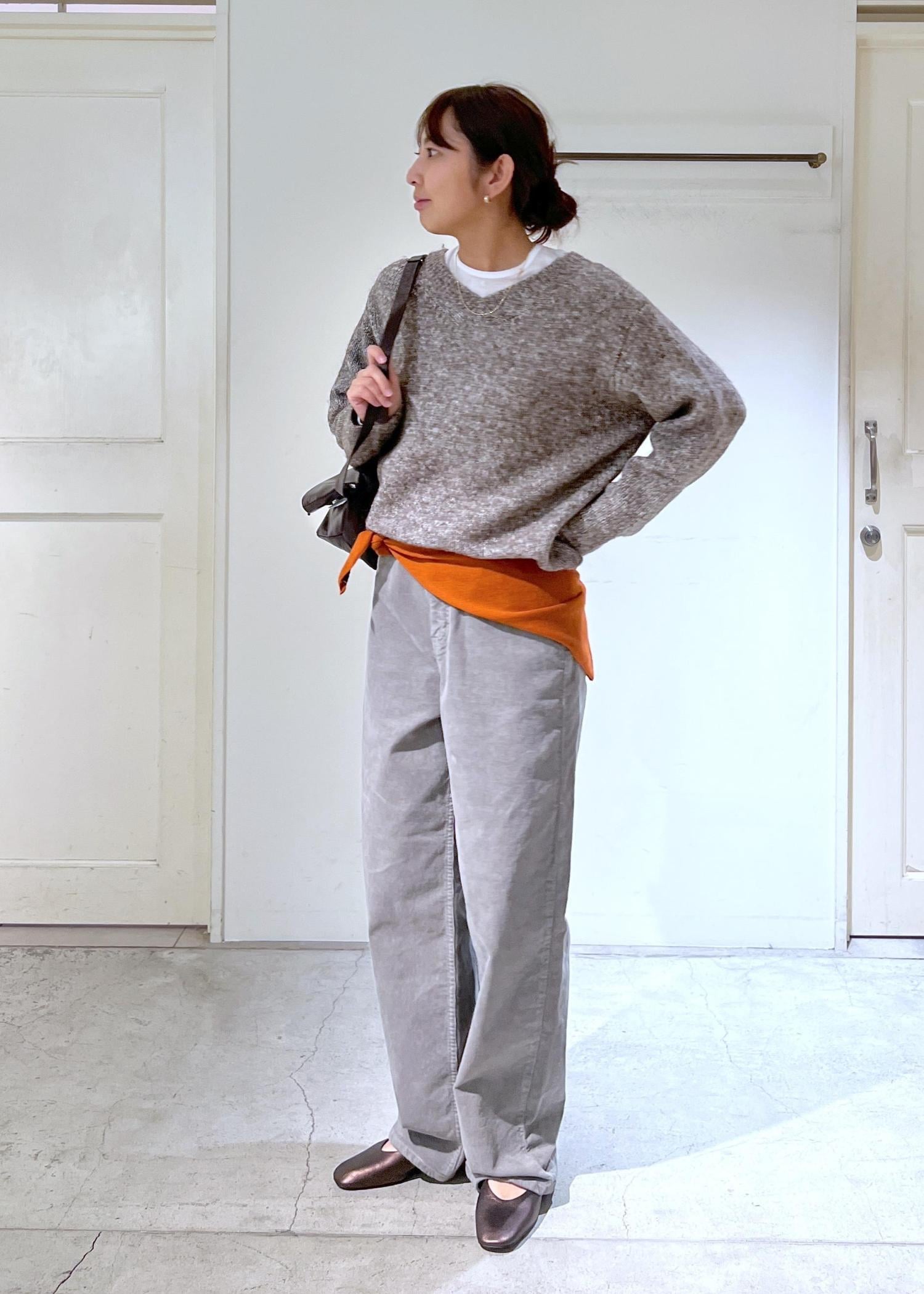 トーンを合わせたパンツとニットに、オレンジのストールを合わせてポイントを。