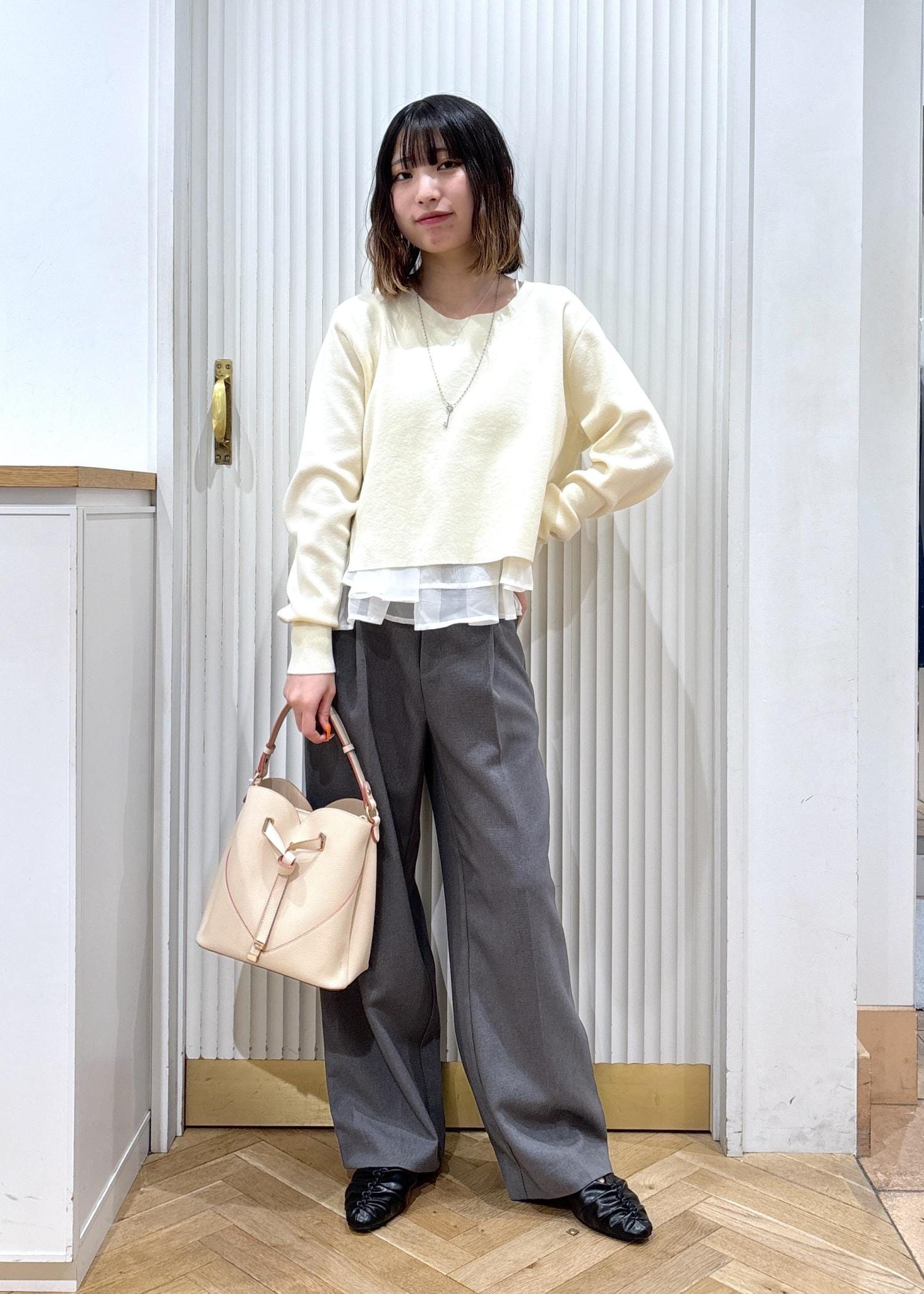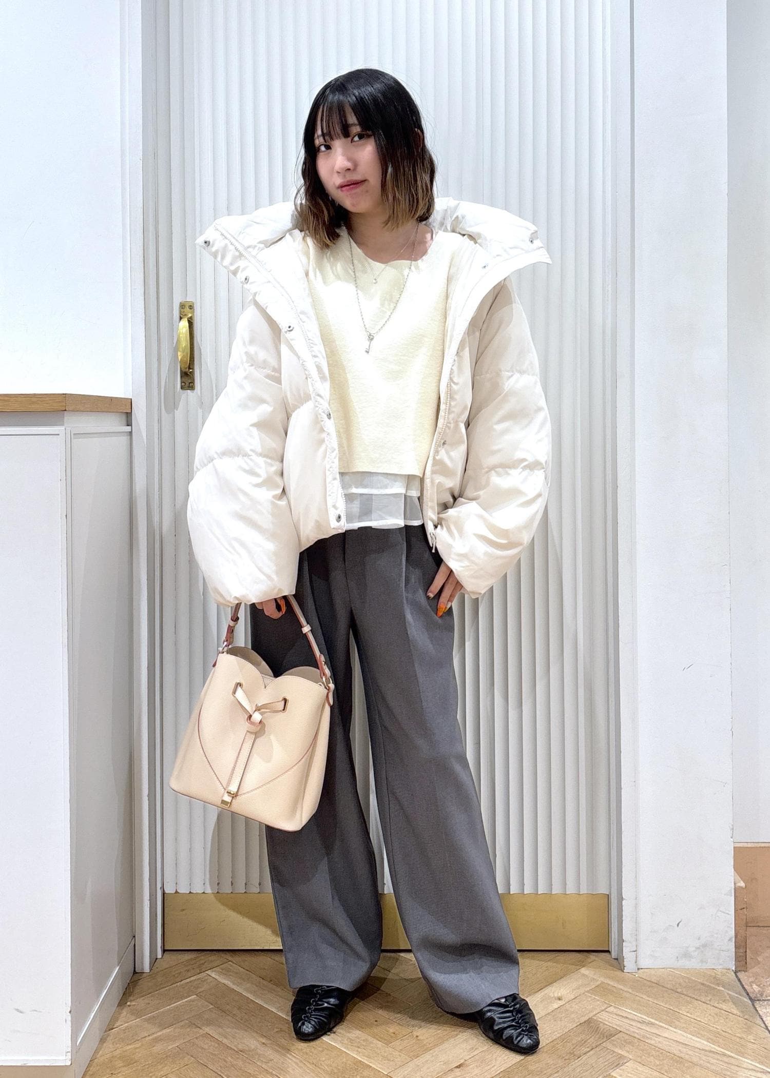 全体を淡めの色味にする事で華やかさがアップします!上から白、グレー、黒とグラデーションにする事で色味のバランスが良く見えます!バッグにベージュを入れる事で差し色になり色味が寂しくなりません!