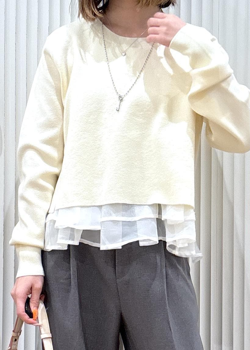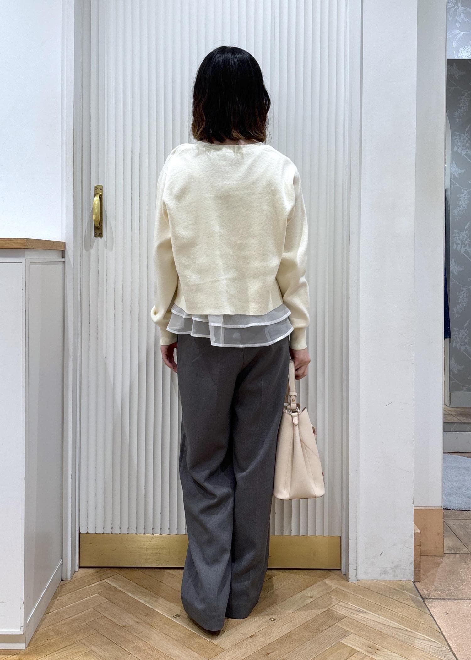 VISペプラムオーガンジードッキングニットプルオーバーキナリ / F¥6,589レビュー153センチ着用で後ろはヒップにかかるくらいの着丈で前の方はお腹がギリギリ隠れるくらいの着丈でした。サイズ感もコンパクトなので低身長さんでも着やすいです!チクチク感もないので着心地◎