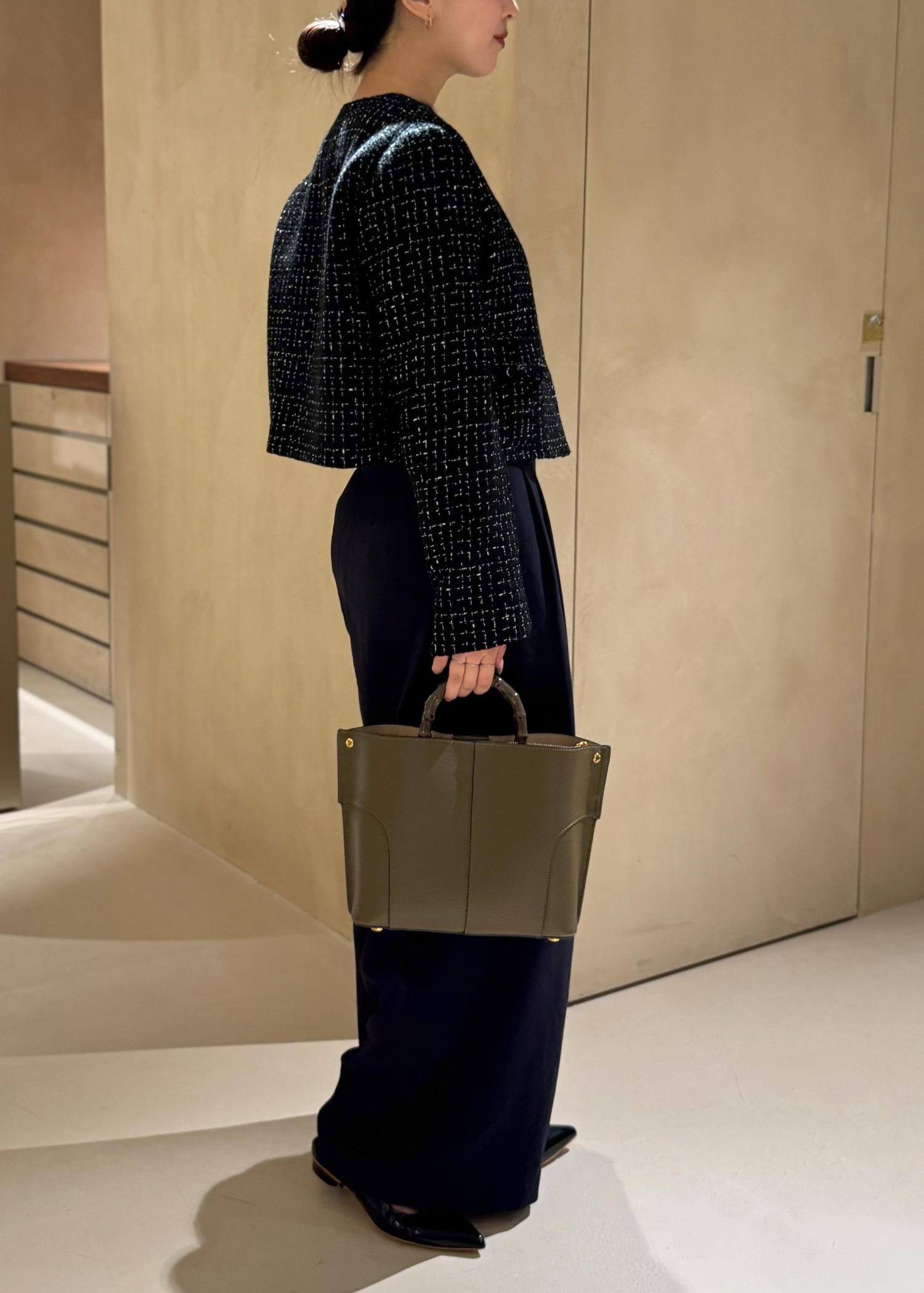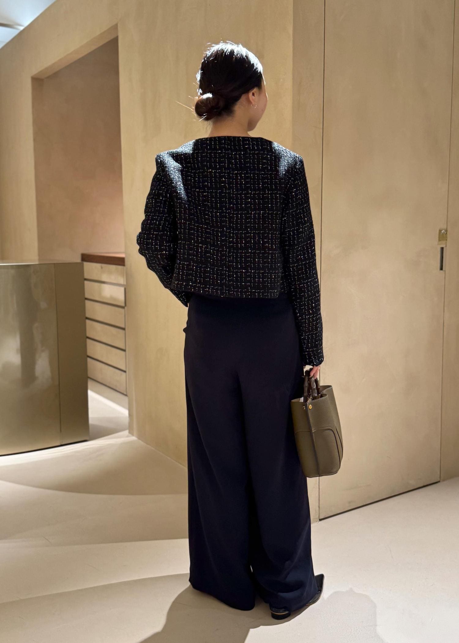ブラックですが、ツィードデザインなので華やかさもあるので、ホリデー時期のお出かけにもおすすめの1着。