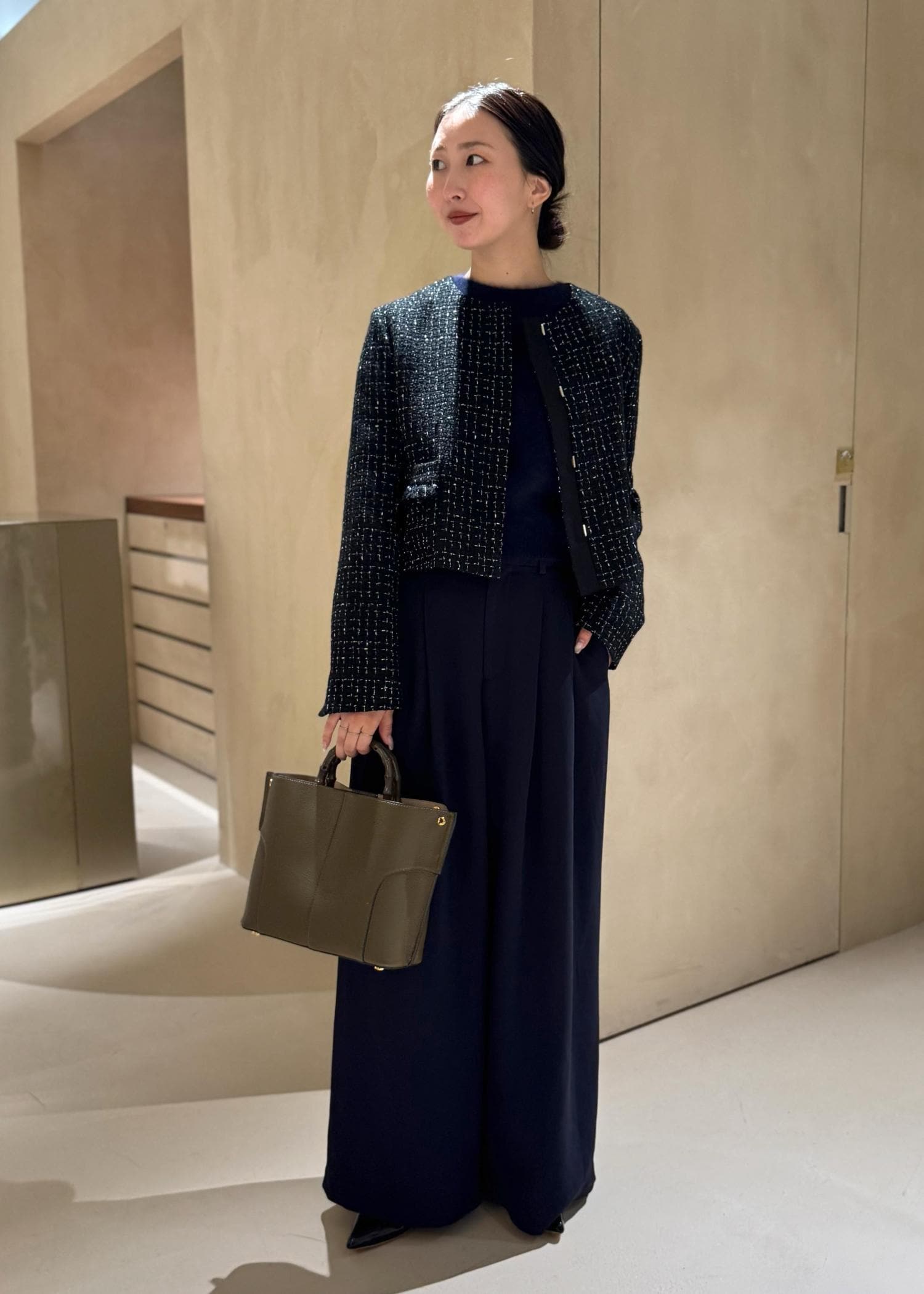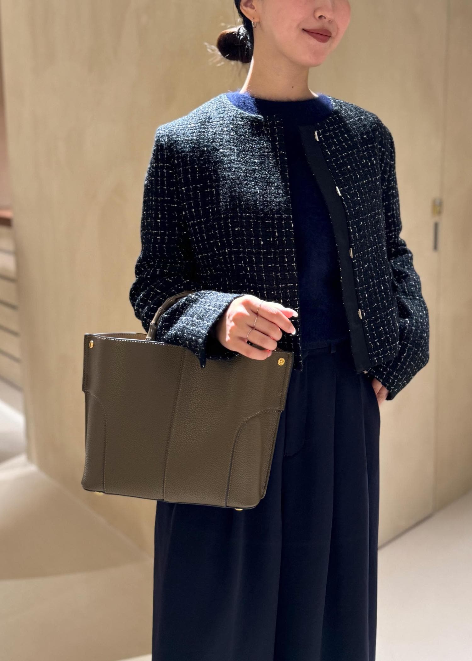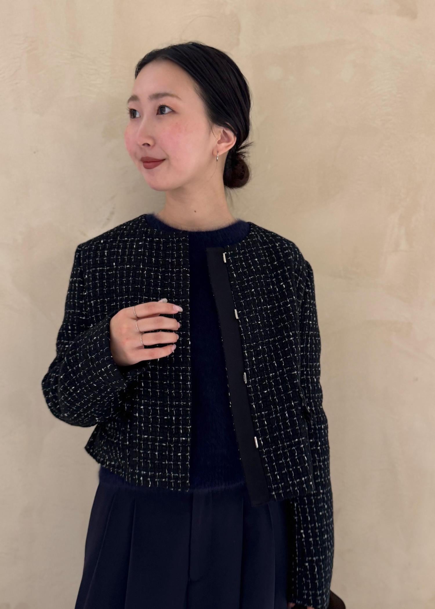デイリー使いしやすいツィードジャケットが冬のお出かけシーンにもおすすめ。