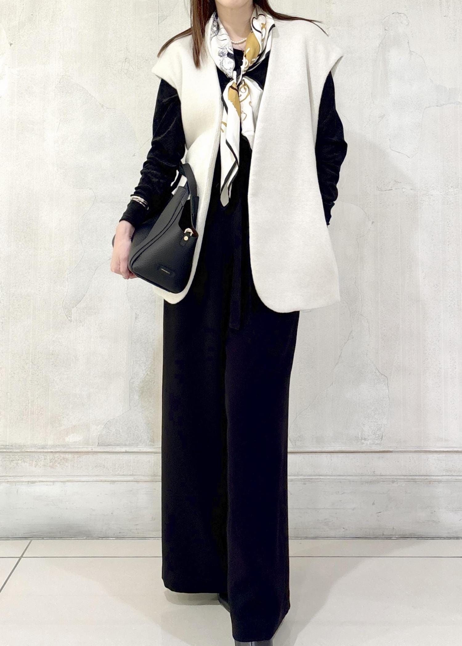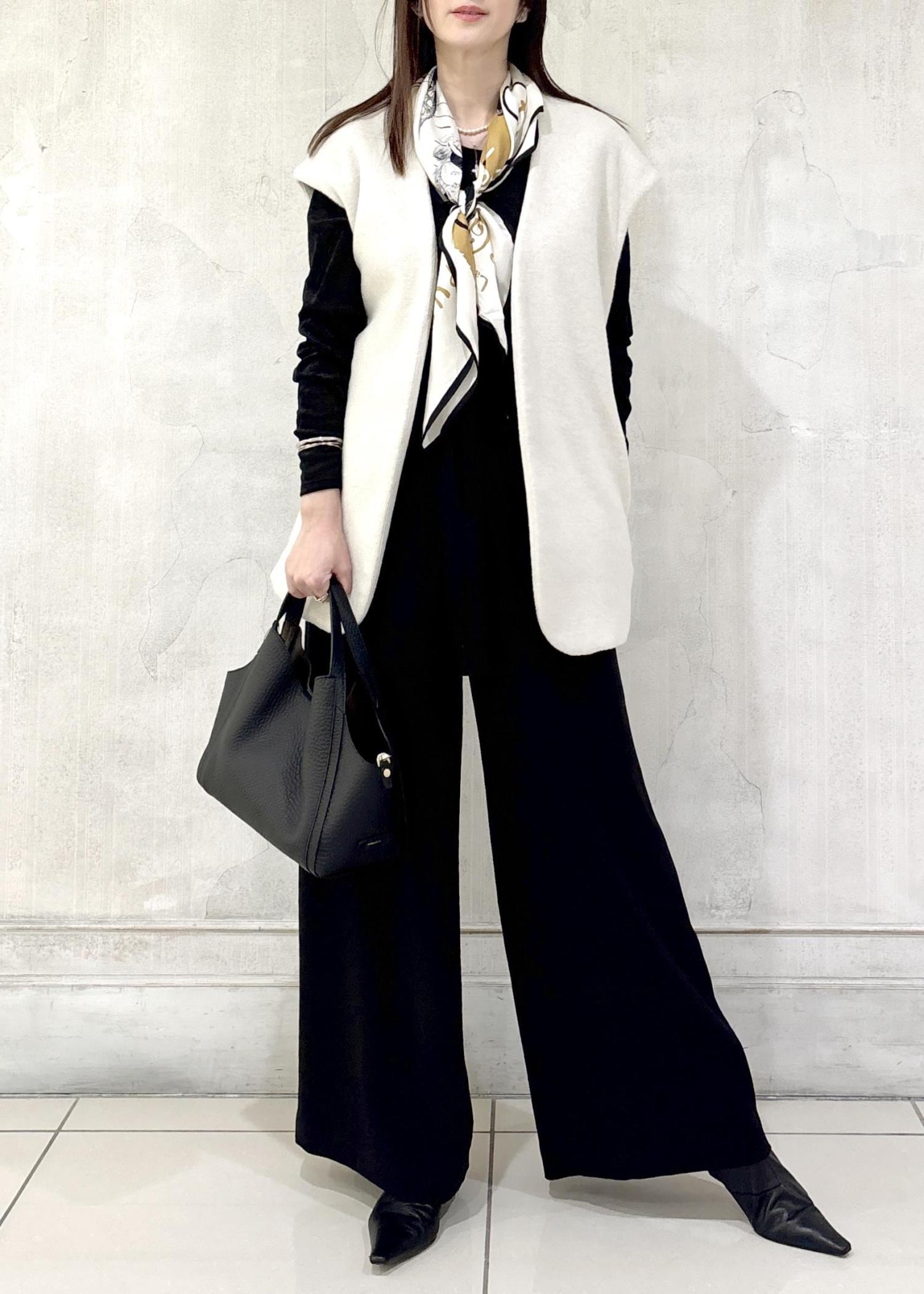 シンプルですがオシャレ見え、お持ちのスカーフやストールをアクセントにstylingするのも◎