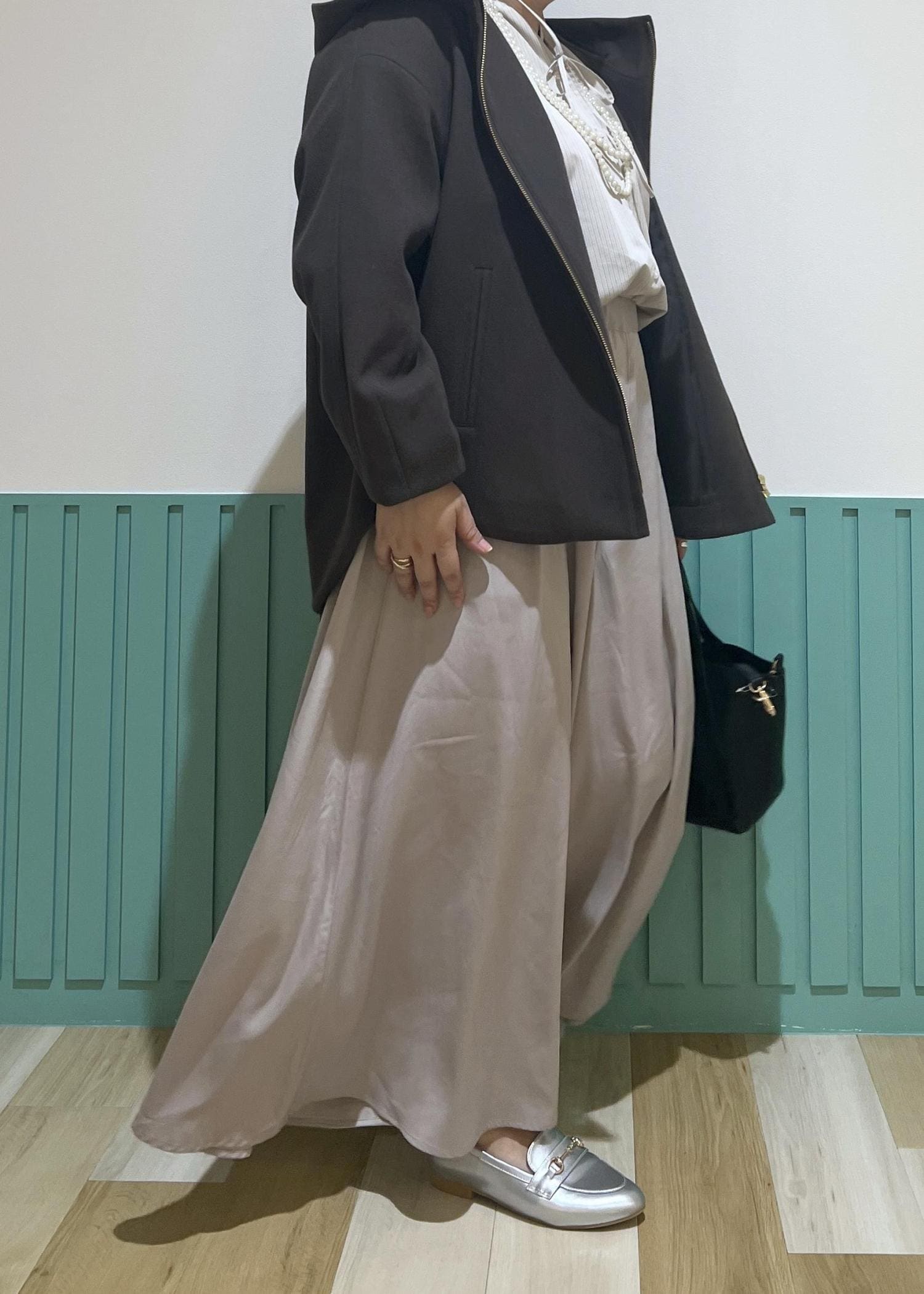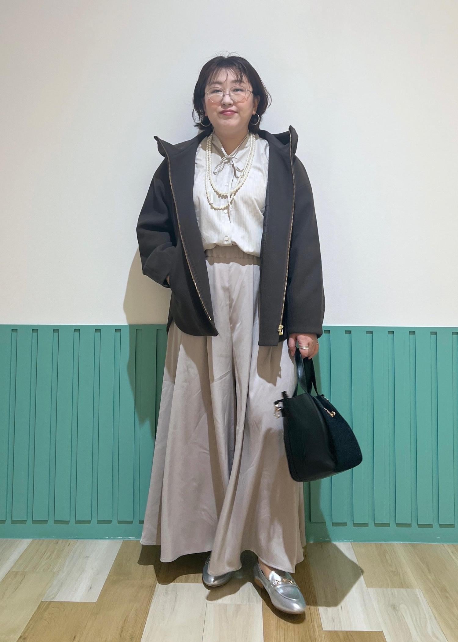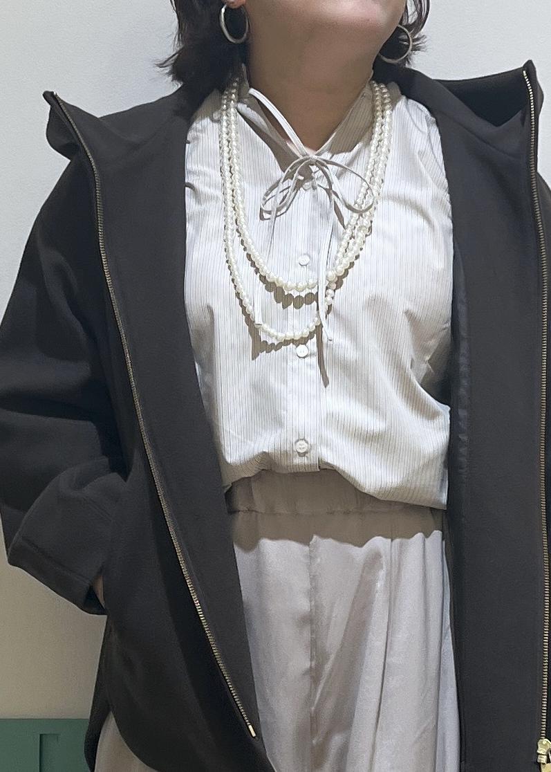 フリルのブラウスにパールというフェミニンスタイリングに、フード付きのアウターをプラスして程よくカジュアルダウン♡