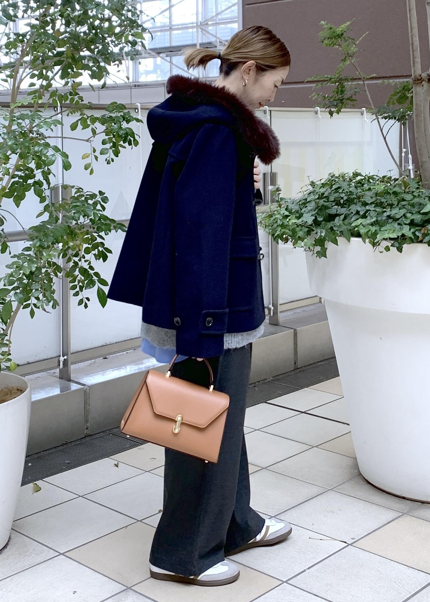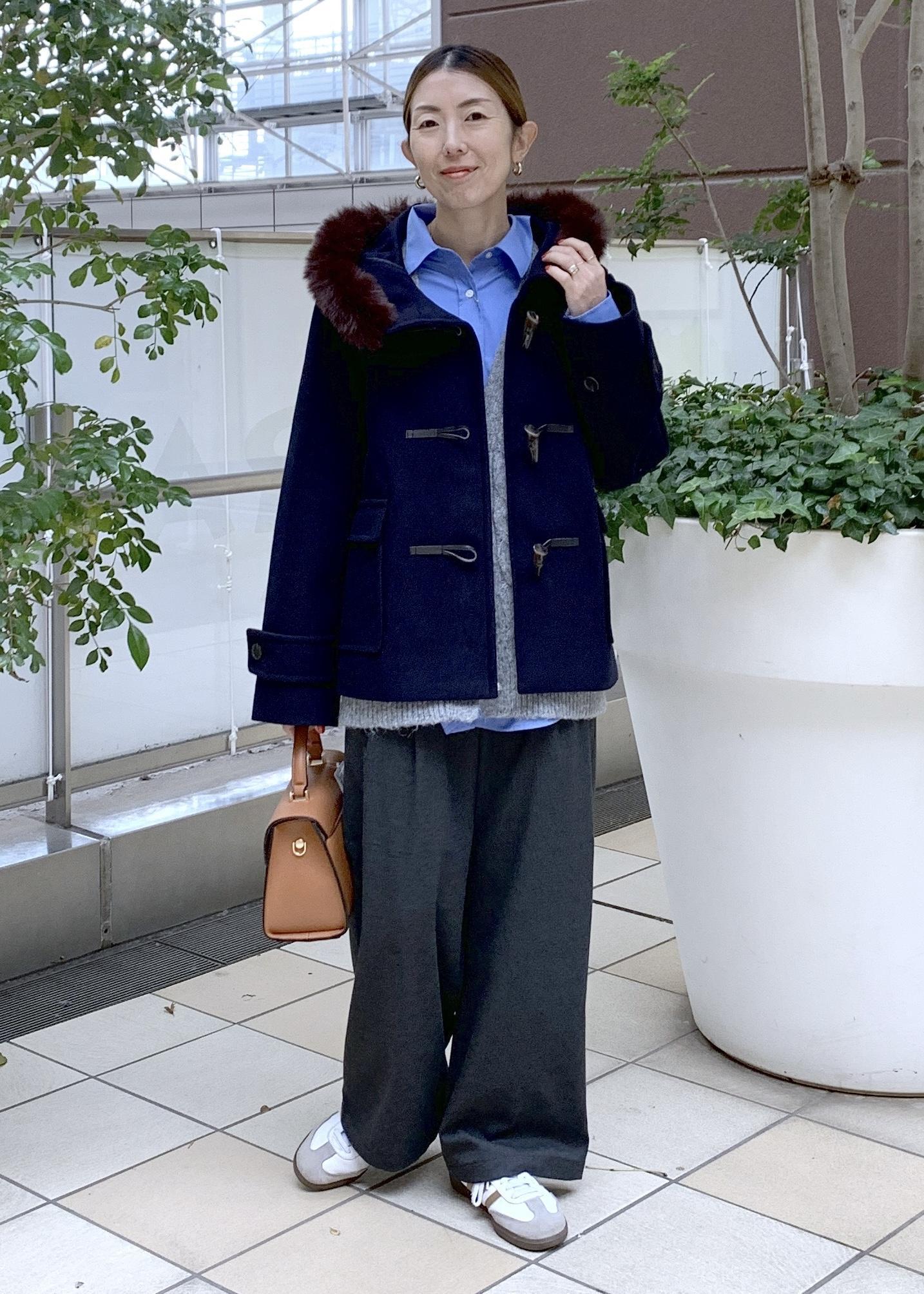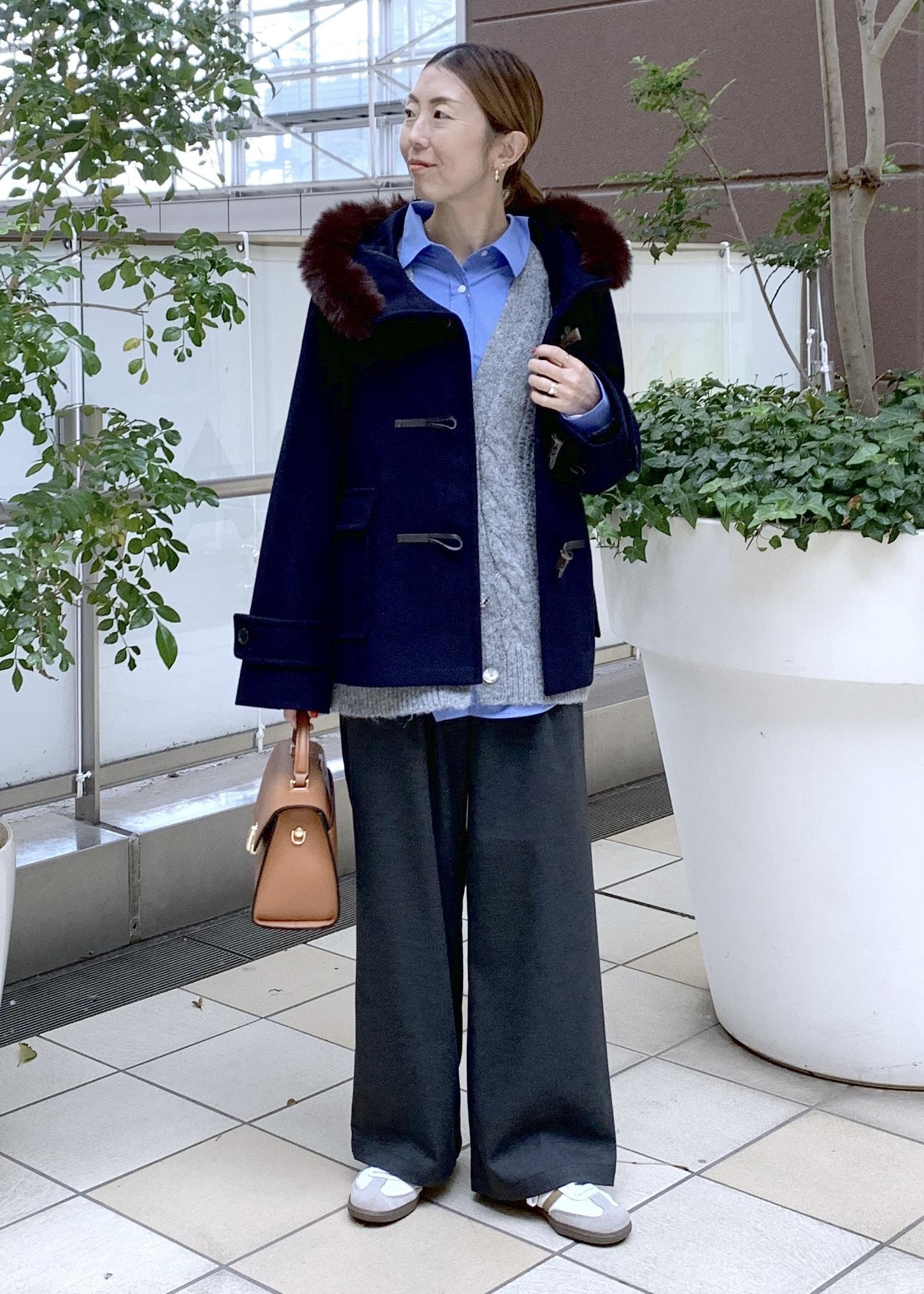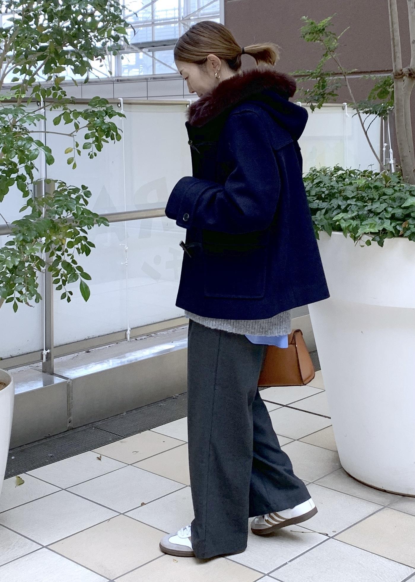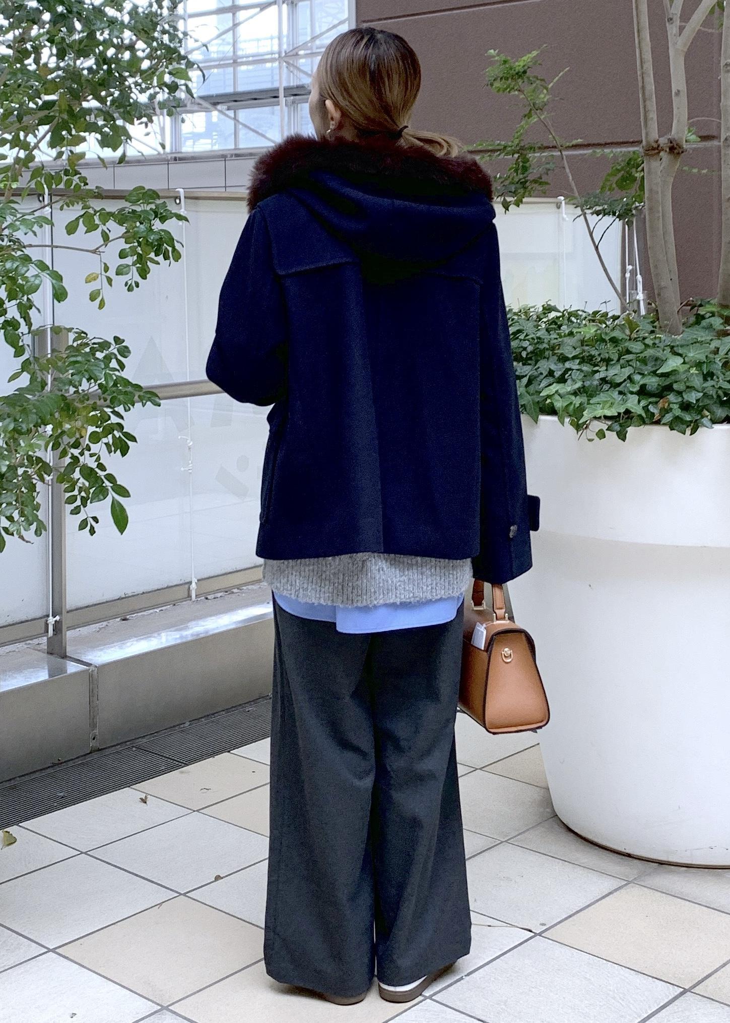 フードのファーが華やかな印象のショートダッフルの大人カジュアルなお出かけスタイリング