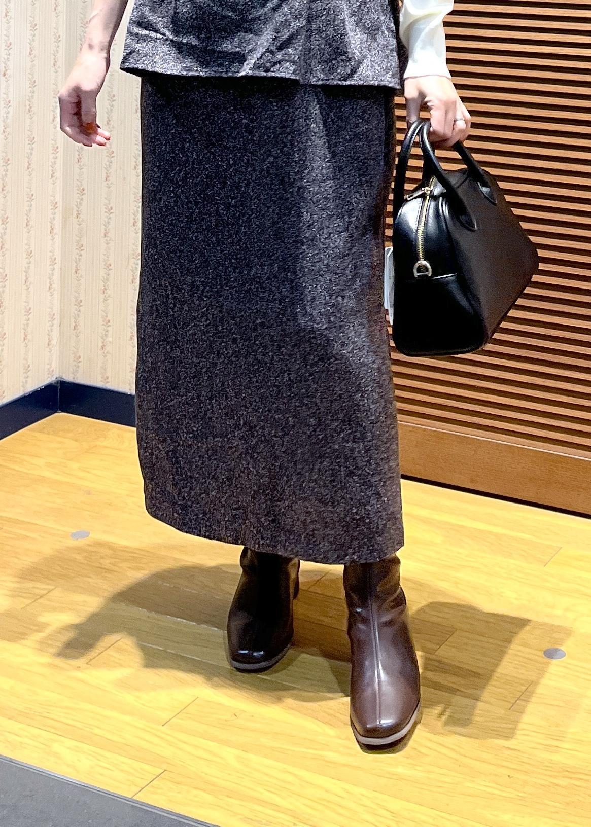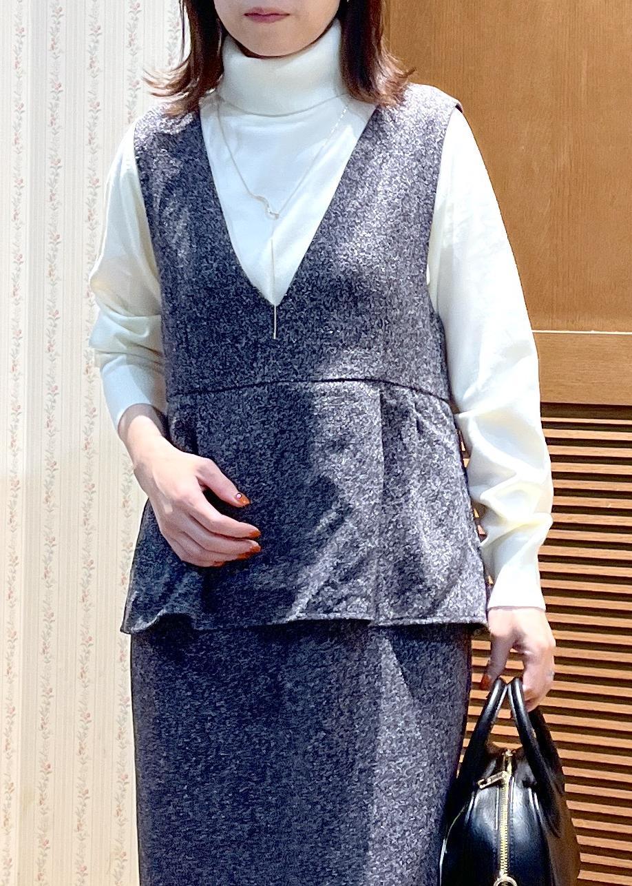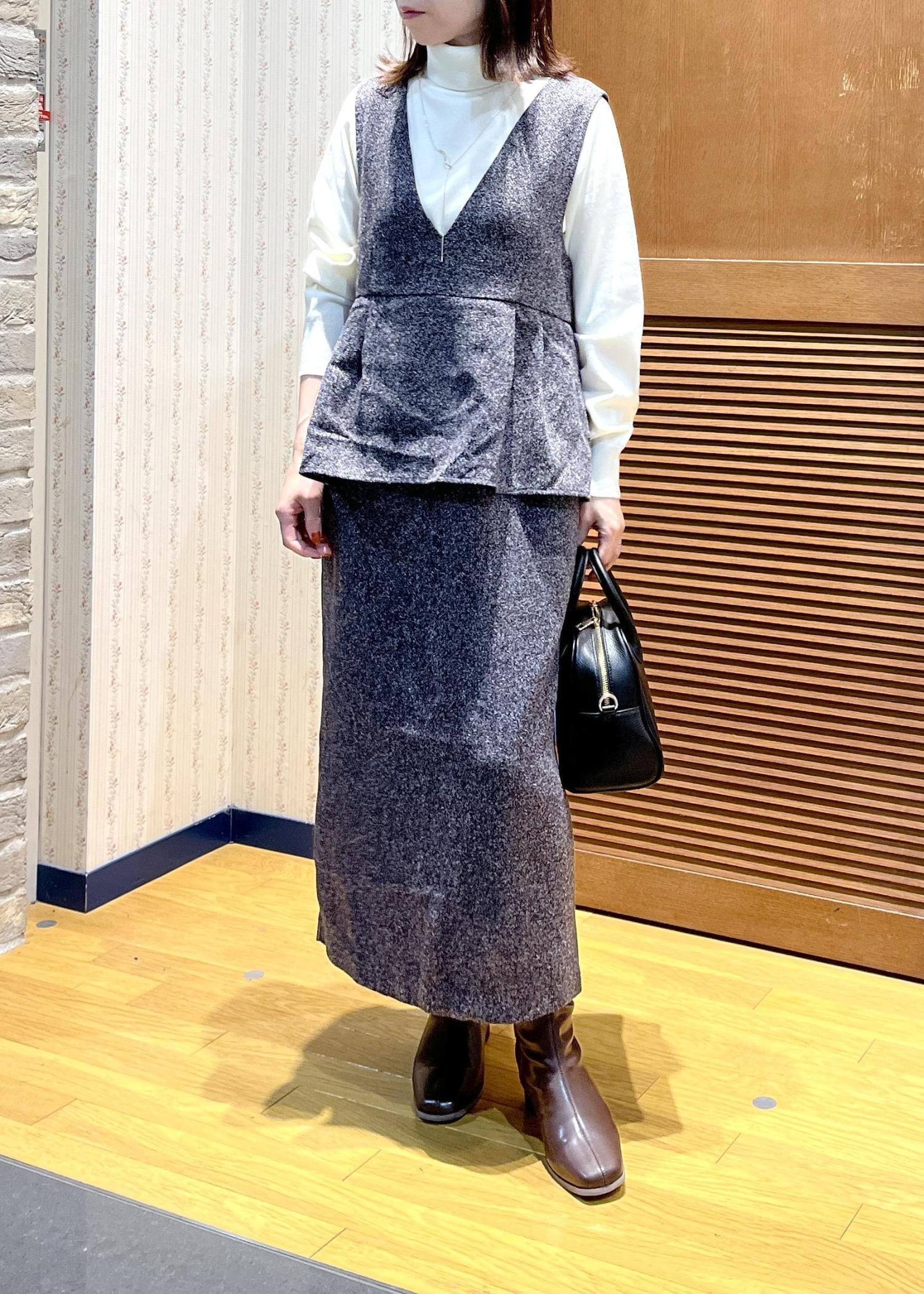タートルニットにジャンスカを合わせたきれいめコーデです。
