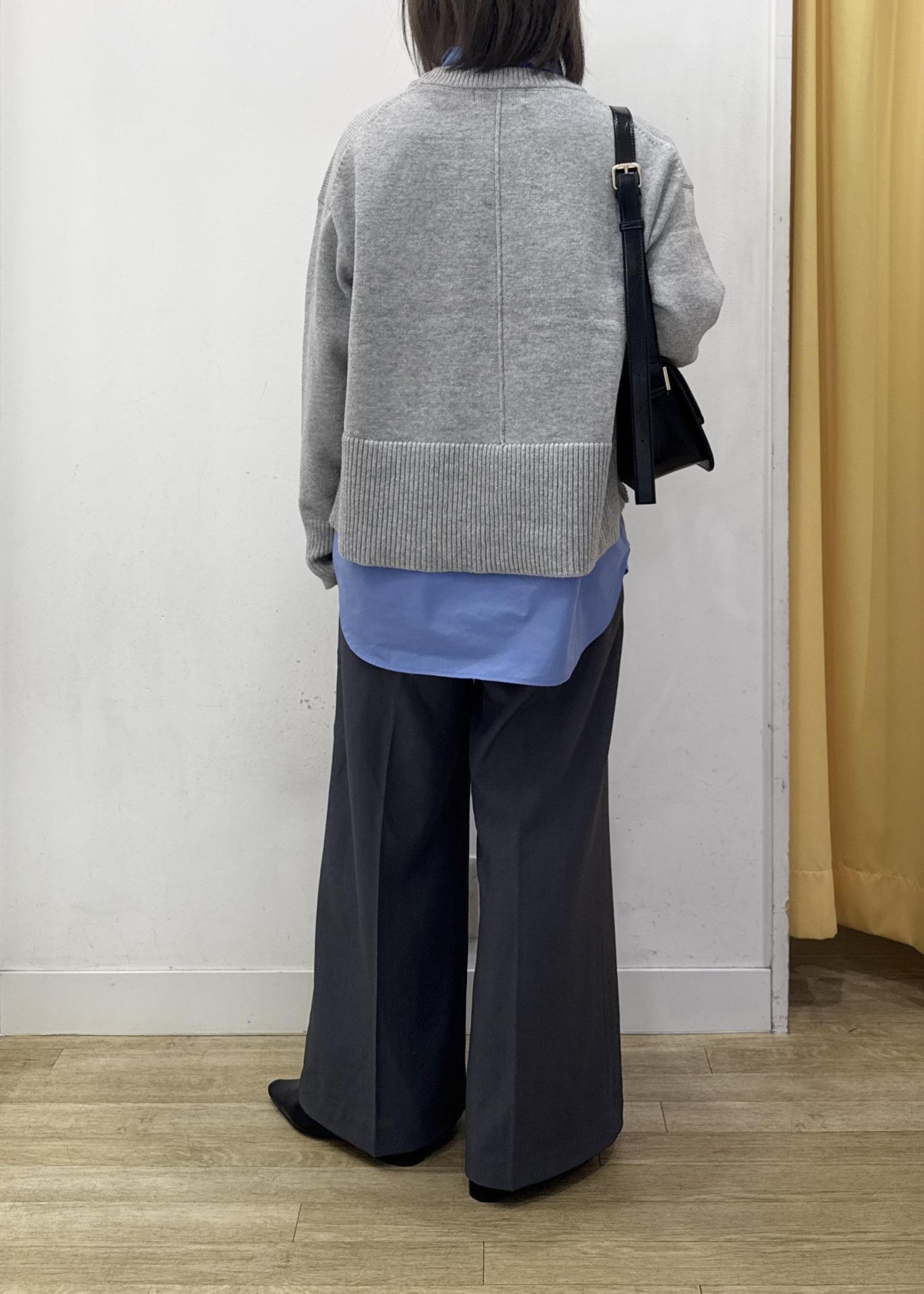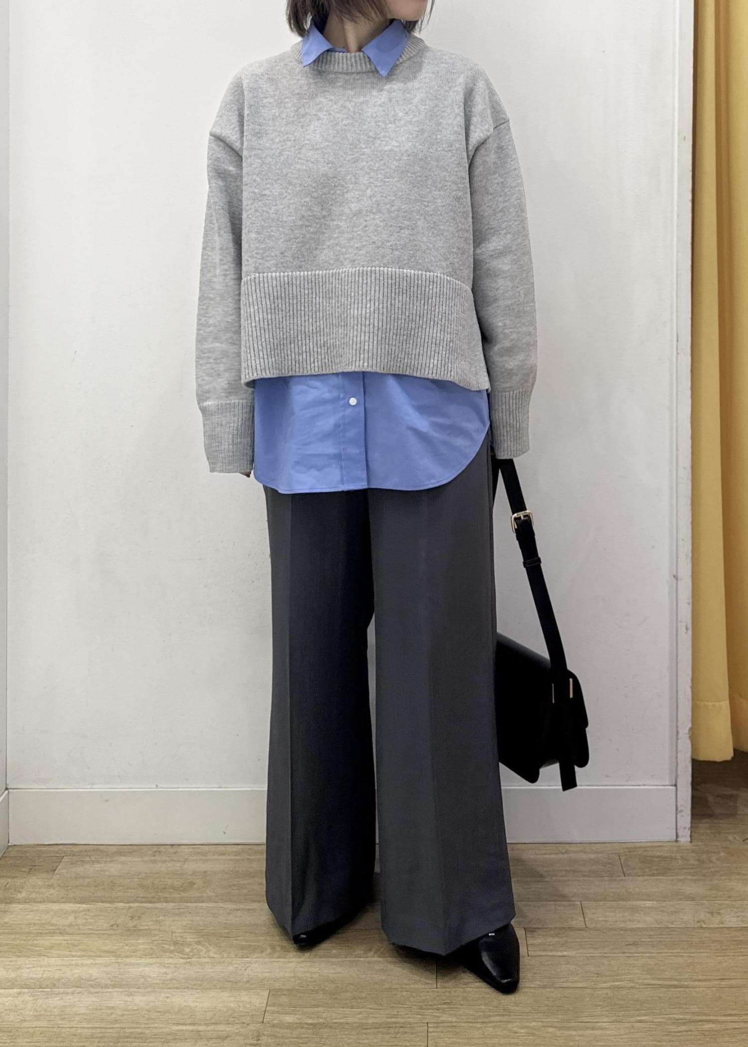 ブラックとグレーのシックなカラー合わせのコーディネートに、ブルーシャツを合わせて軽さも入れるのがポイント☺︎