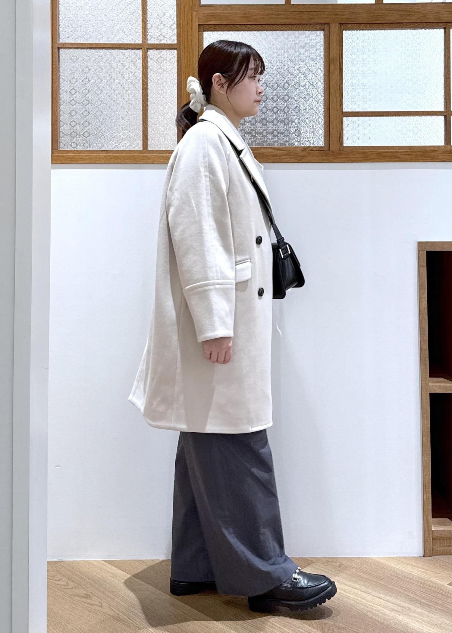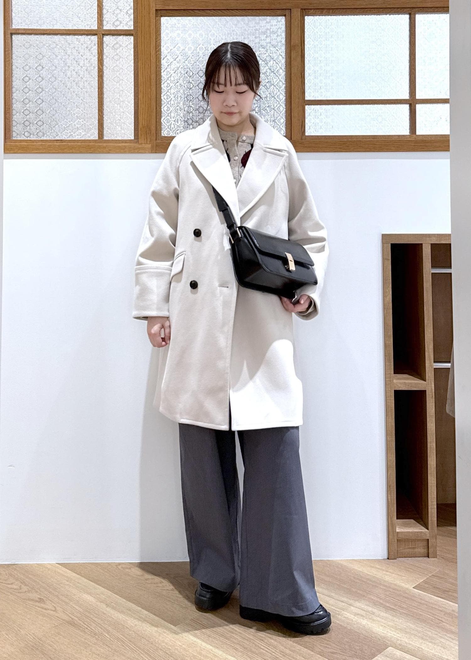 ホワイトのPコートを主役に、カーディガンとワイドパンツを合わせたシンプルできれい見えするコーディネートです。