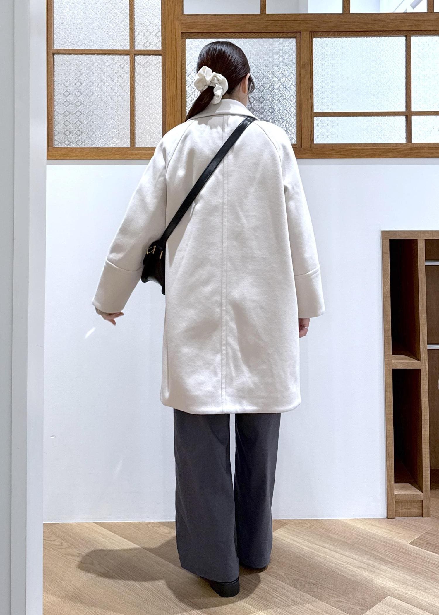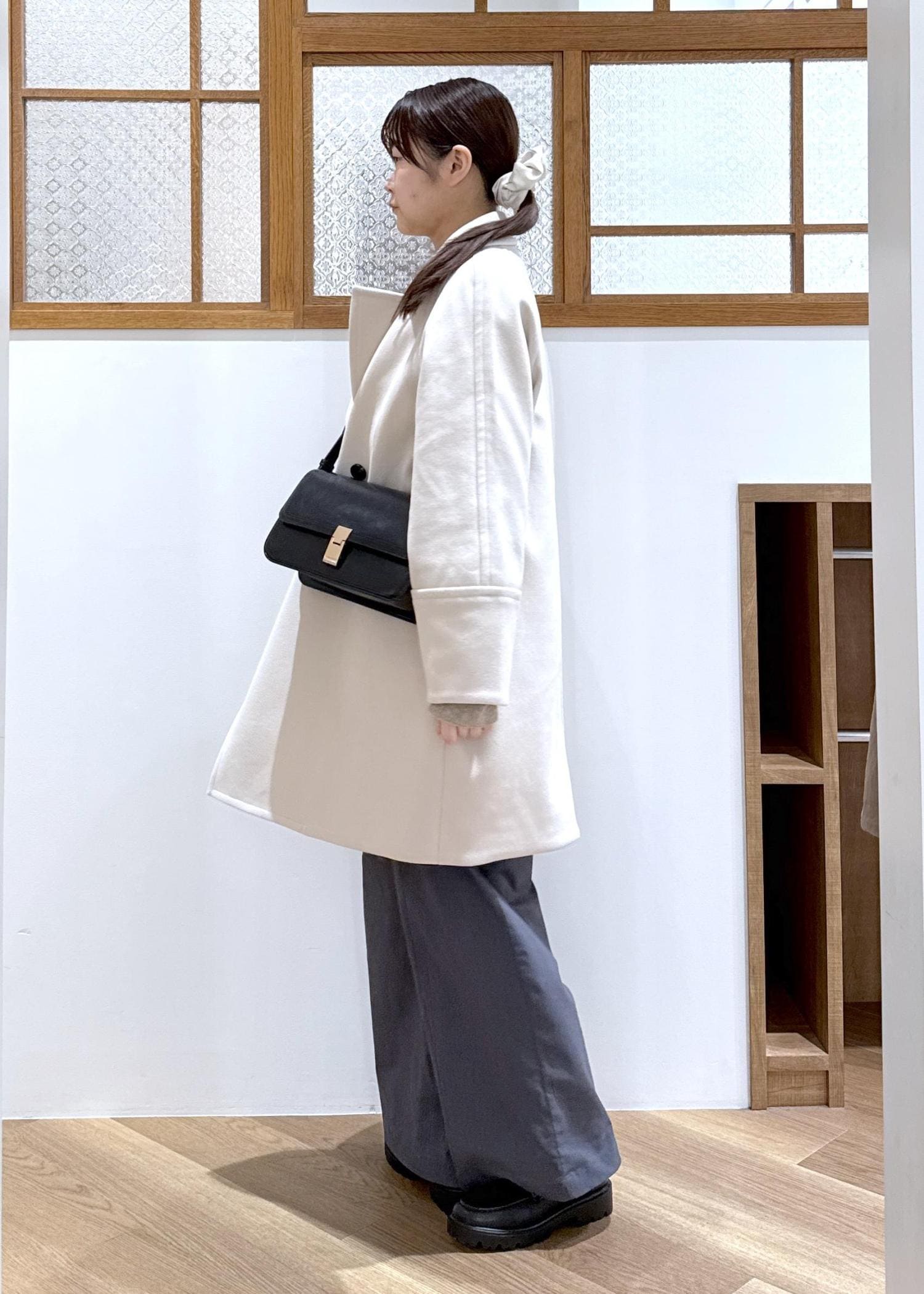 コートと同じ色味のシュシュを着け、フェミニンな要素もプラスしているのがポイントです。