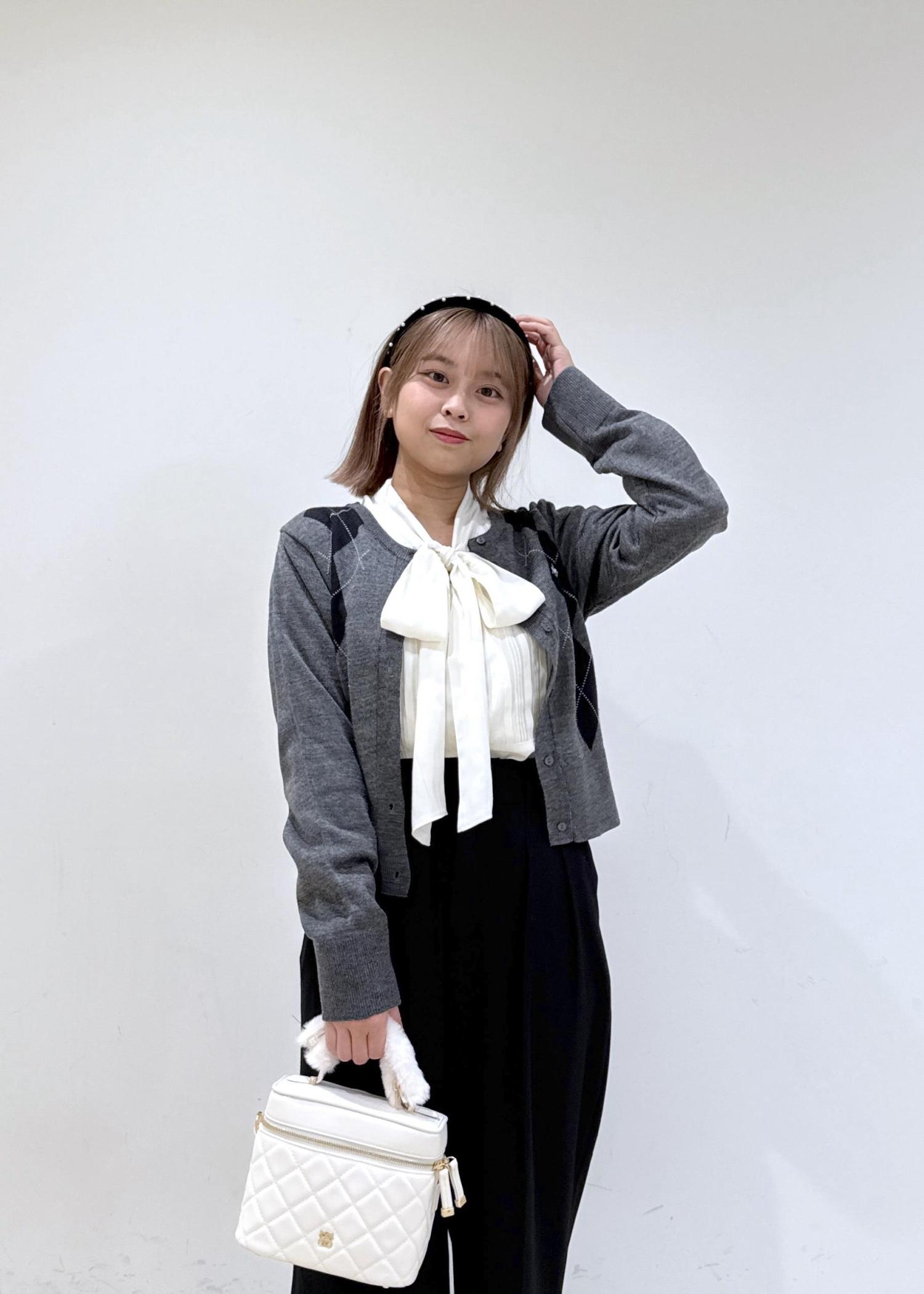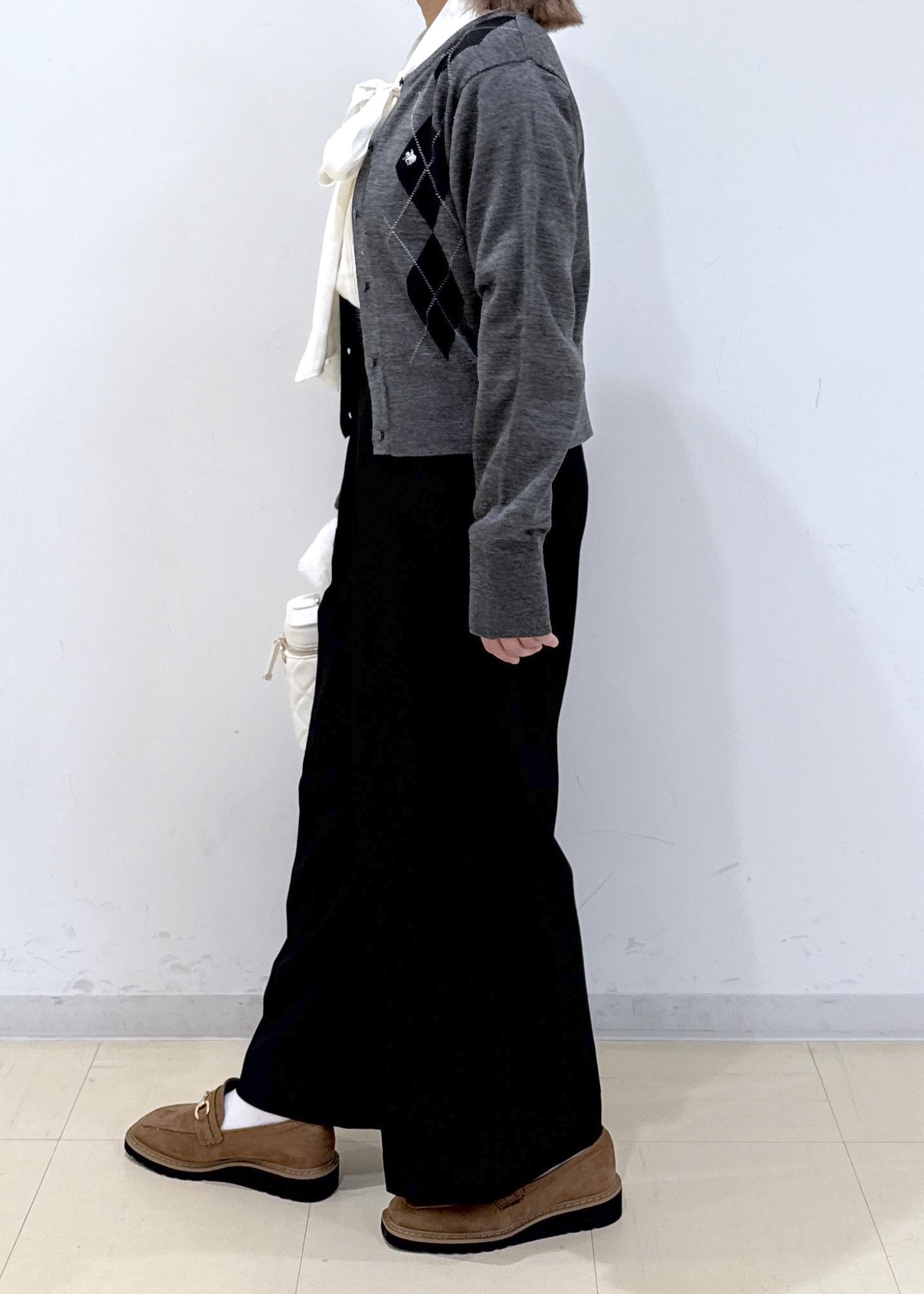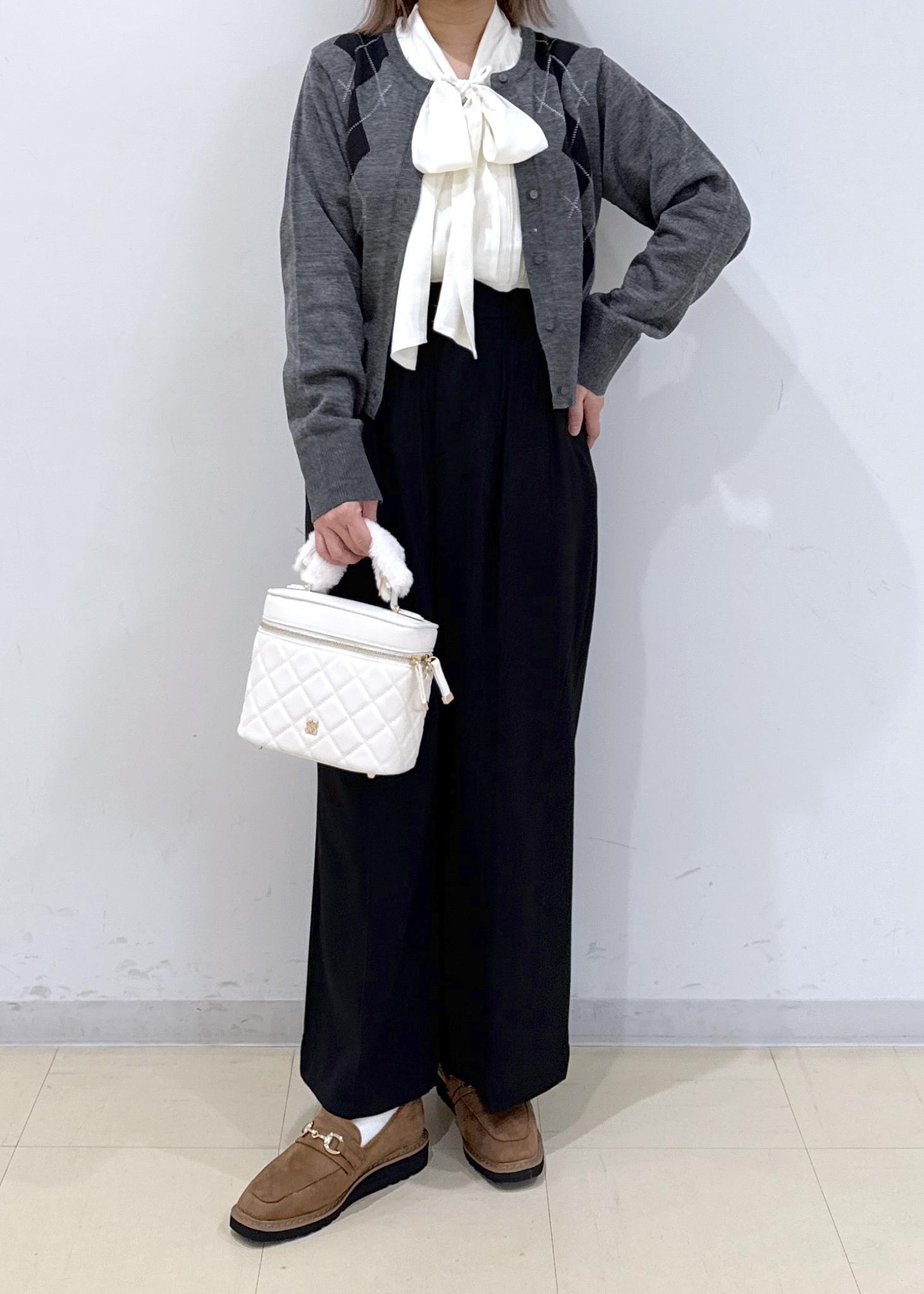 黒のウーリッシュパンツはお仕事にはもちろんおすすめですが、トップスをボウタイブラウスとアーガイルのカーディガンに合わせることで甘さをプラスし、普段使いにもおすすめのコーディネートにしました!