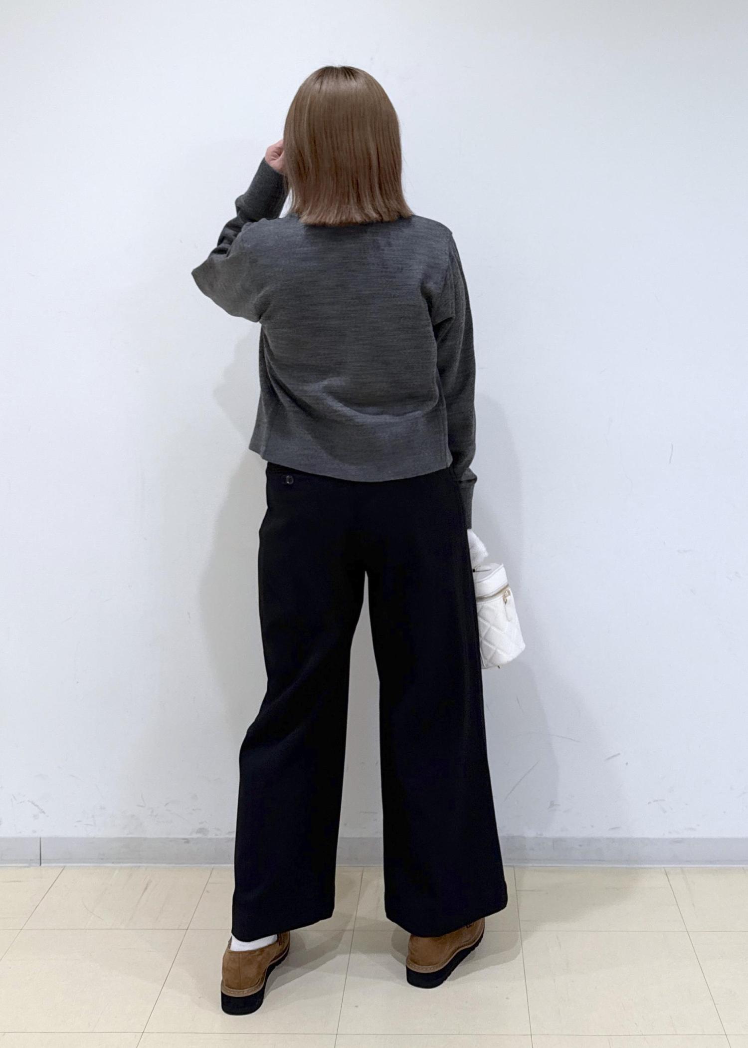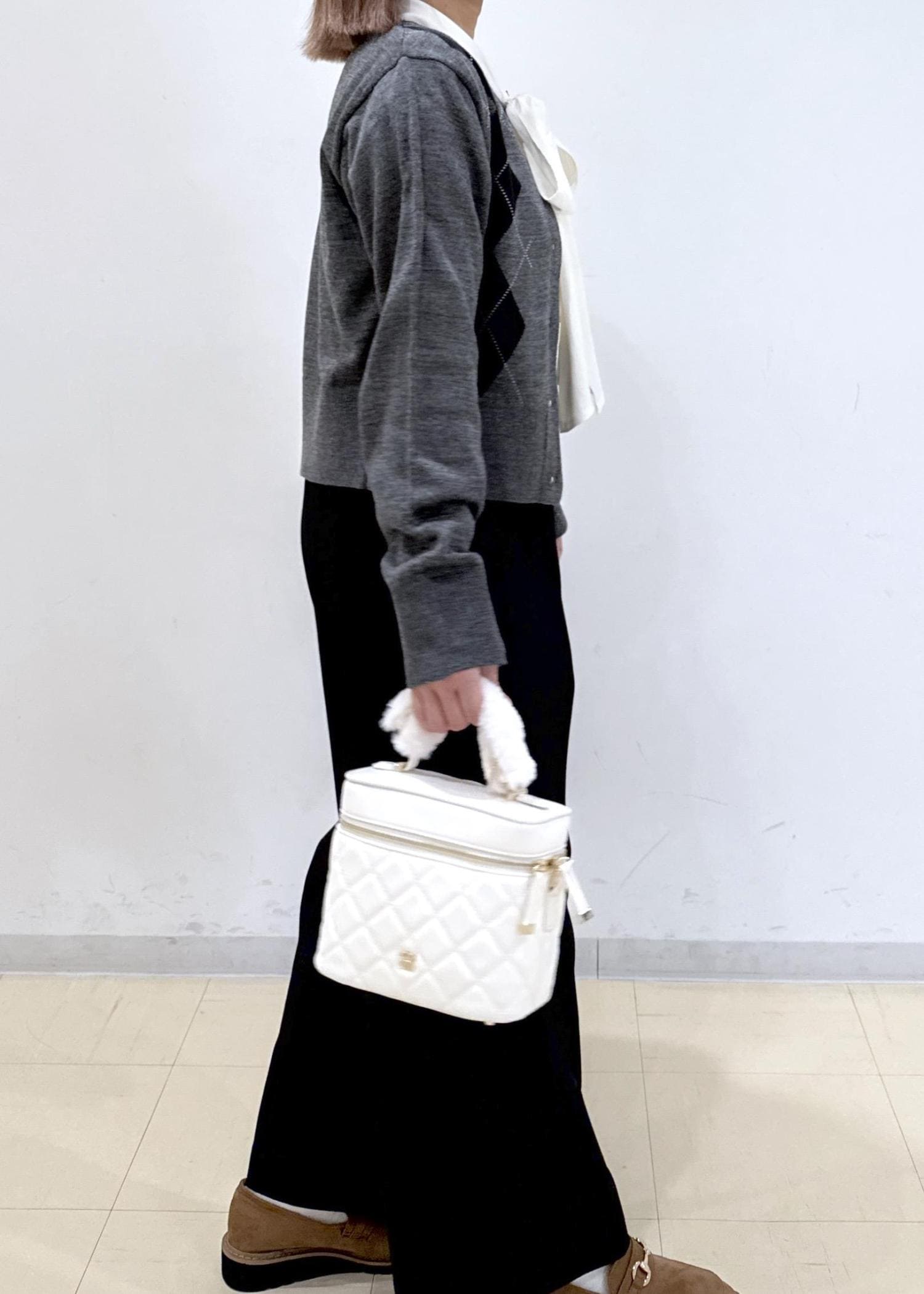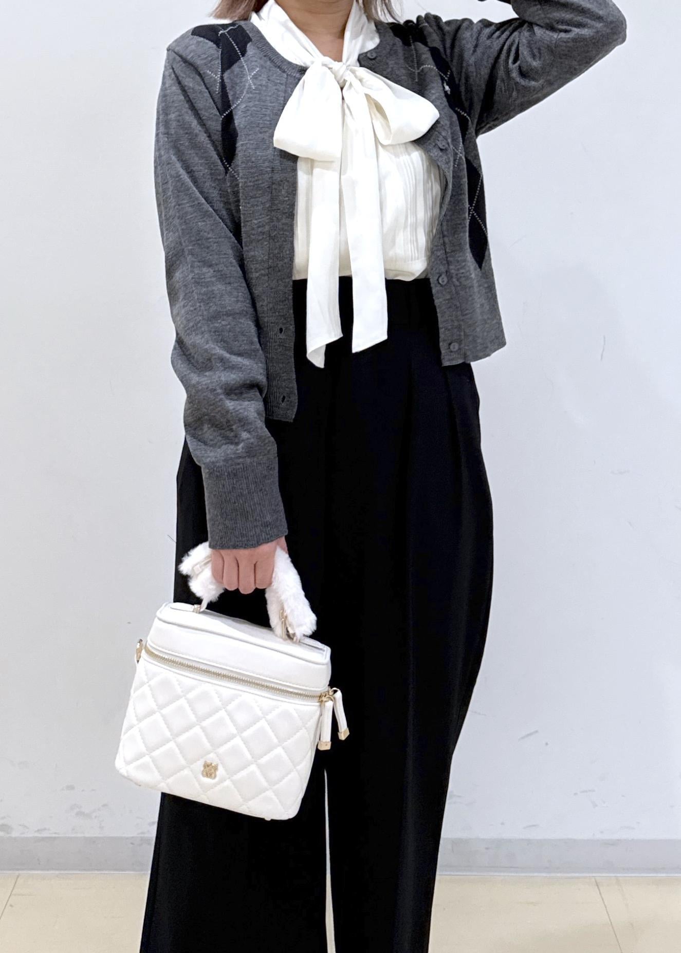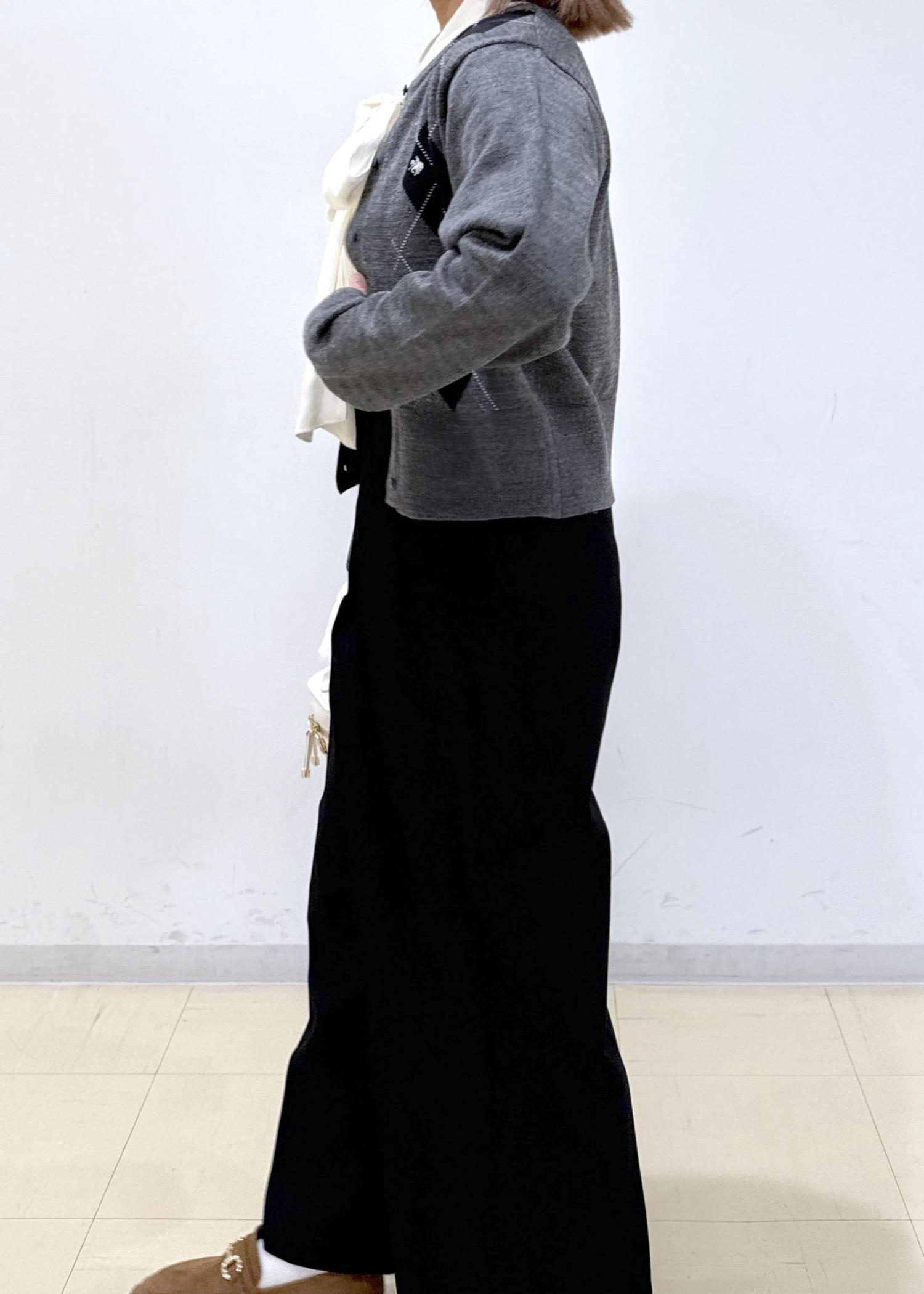黒のウーリッシュパンツはお仕事にはもちろんおすすめですが、トップスをボウタイブラウスとアーガイルのカーディガンに合わせることで甘さをプラスし、普段使いにもおすすめのコーディネートにしました!