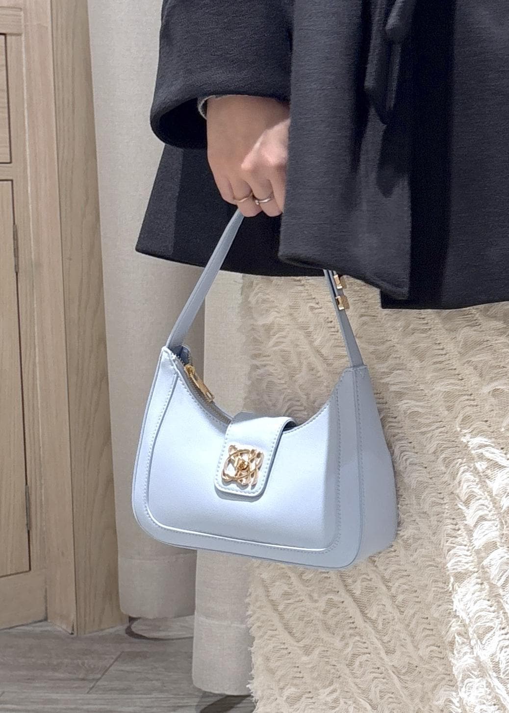 袖のフレアスリーブが手首を細見えしてくれます。