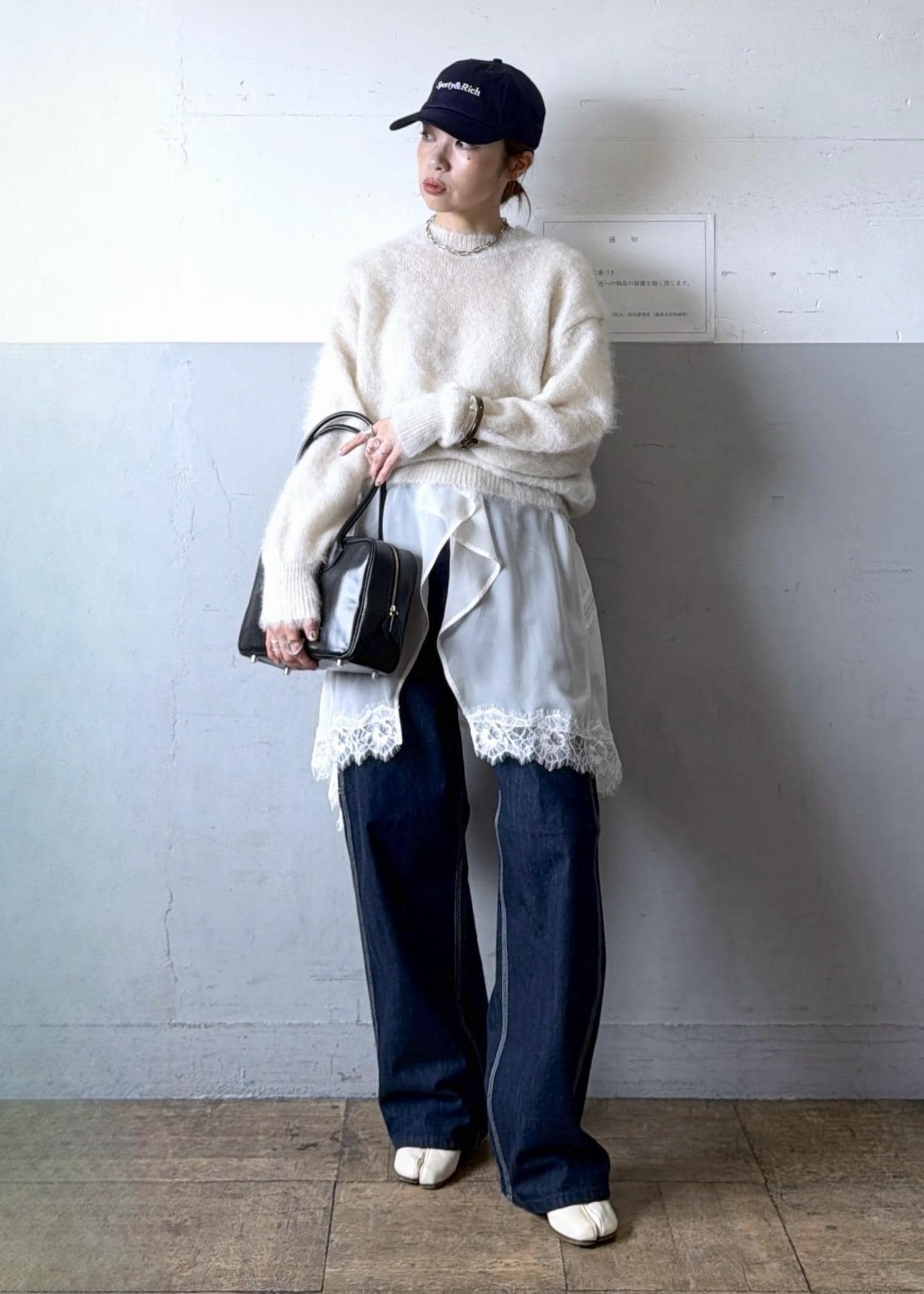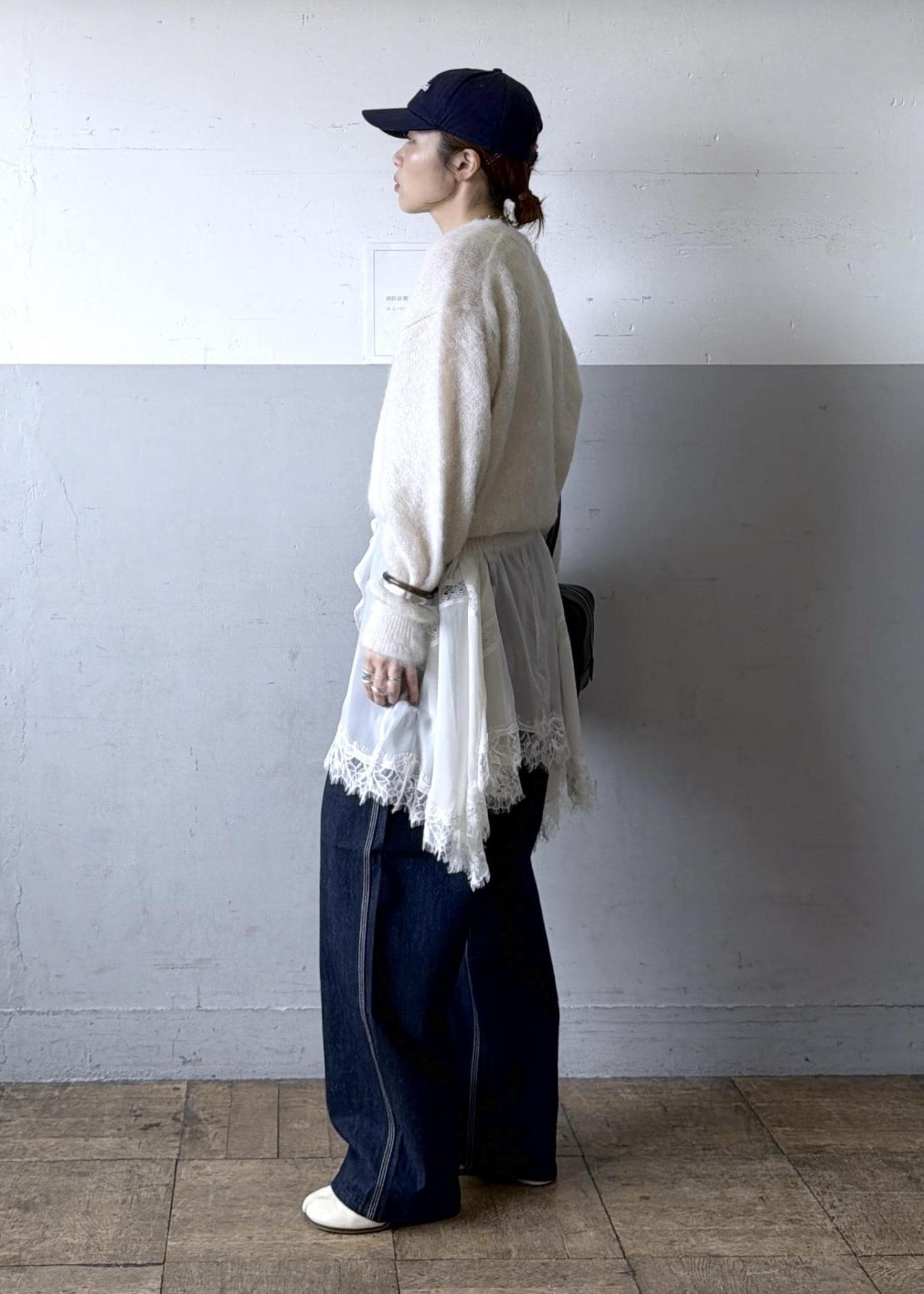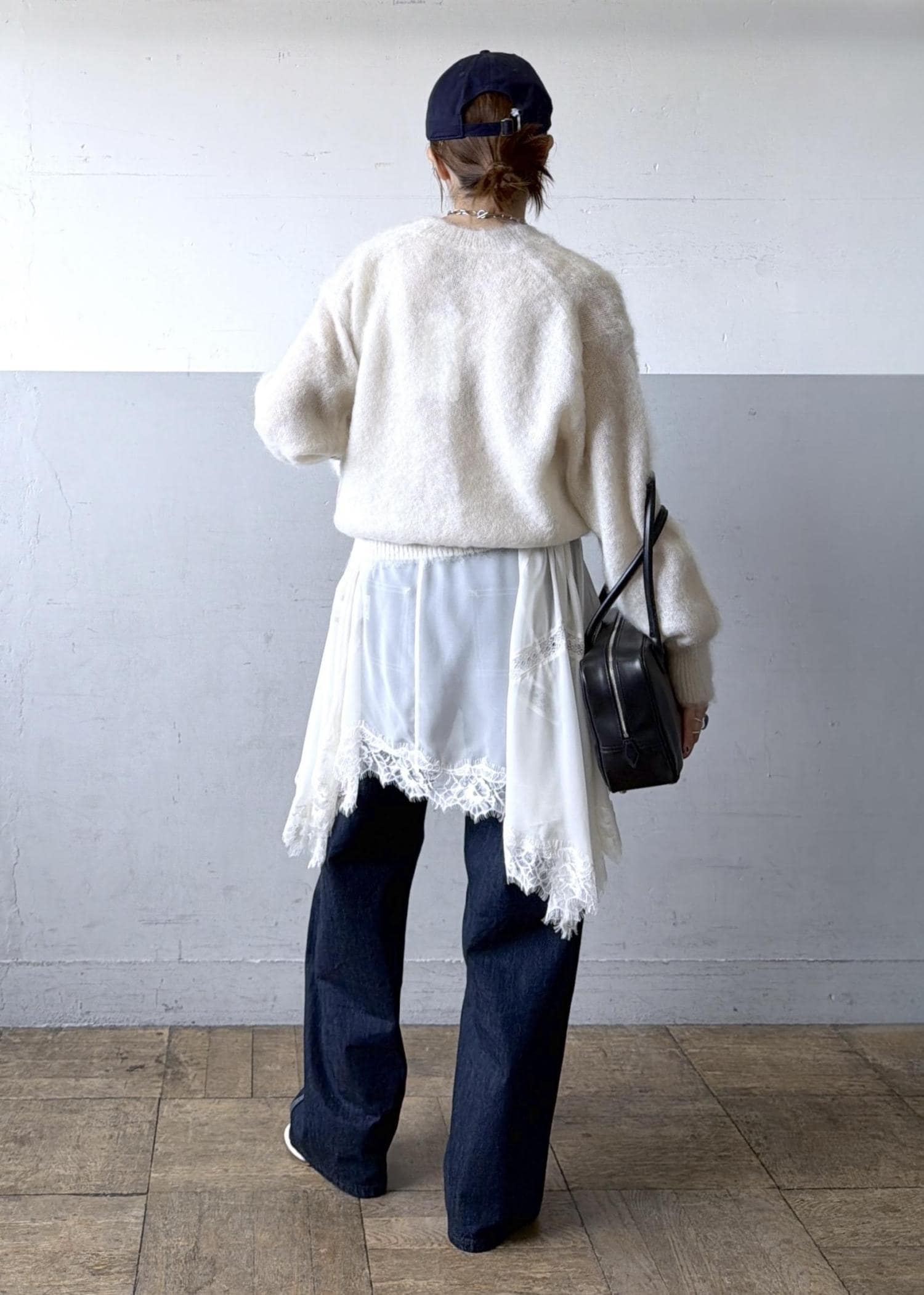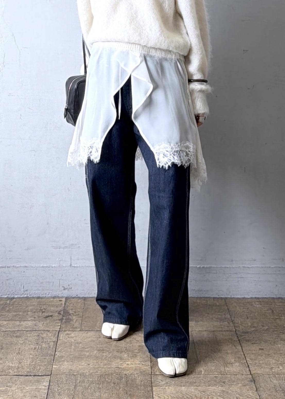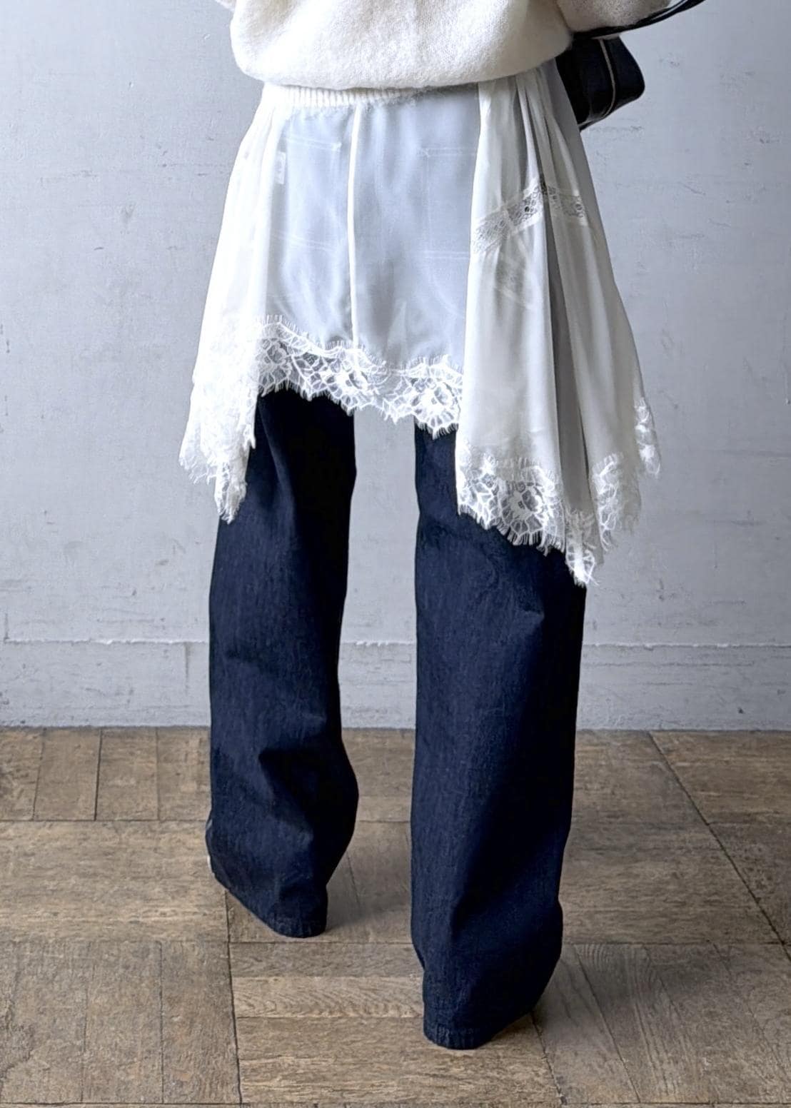 ニット×デニムの普遍的な合わせにレースジレをレイヤード。