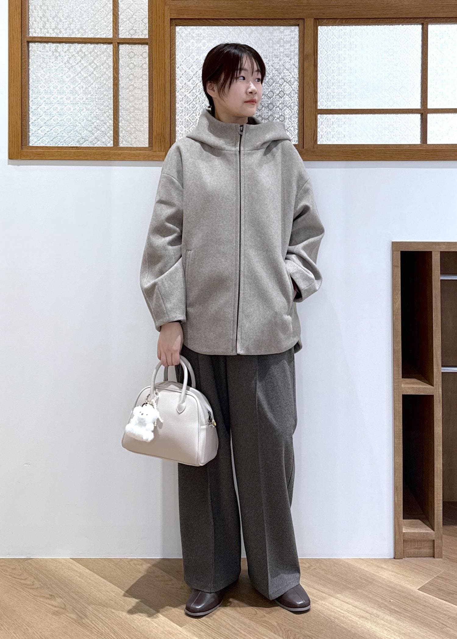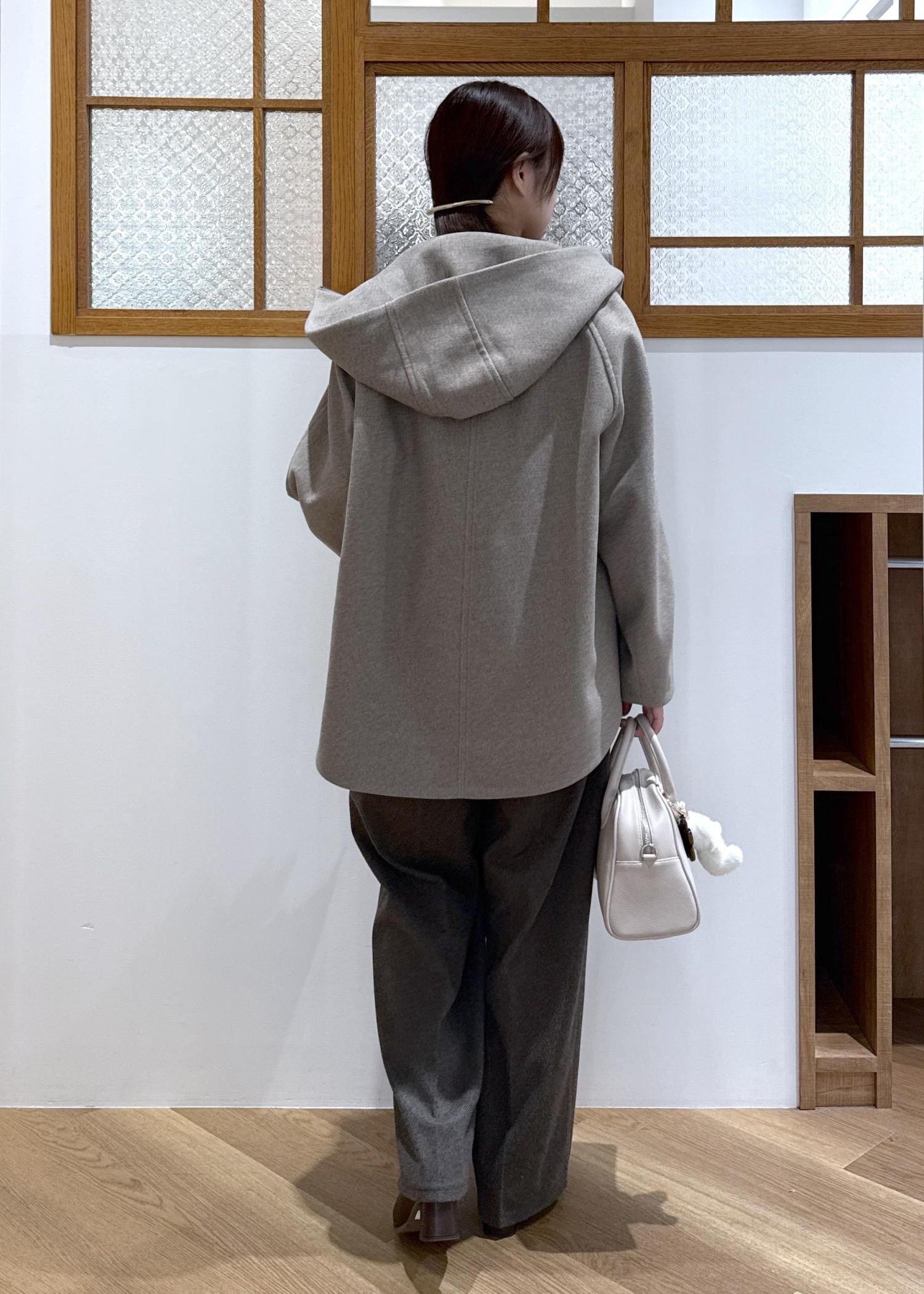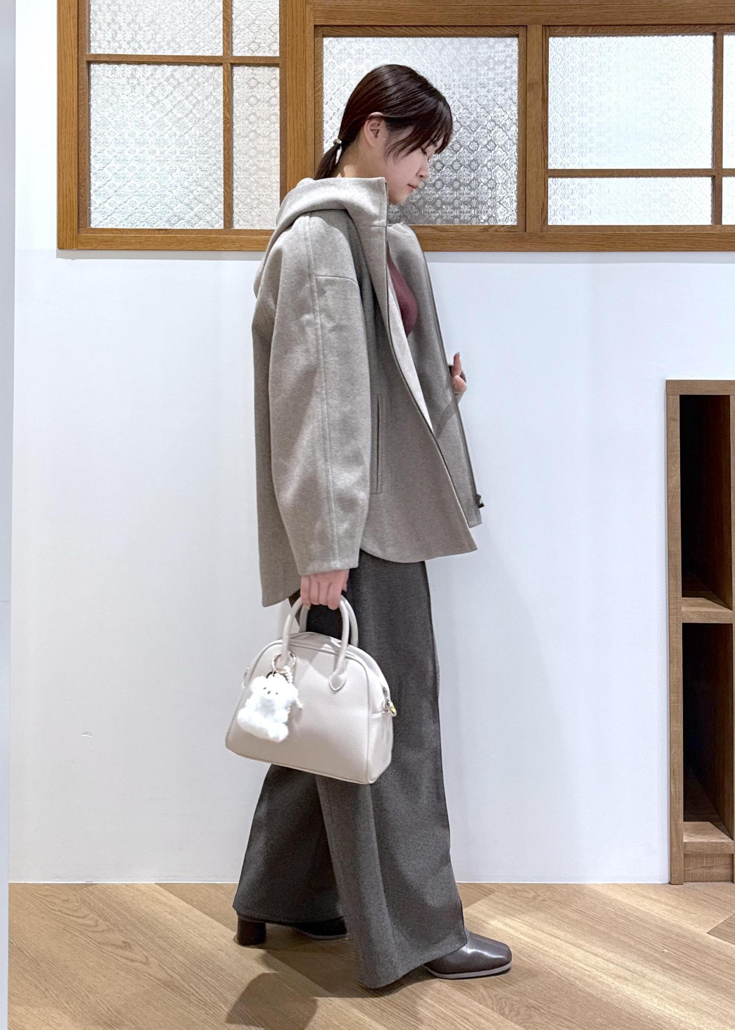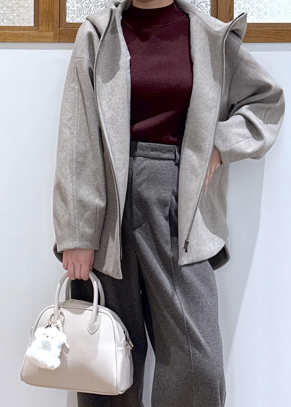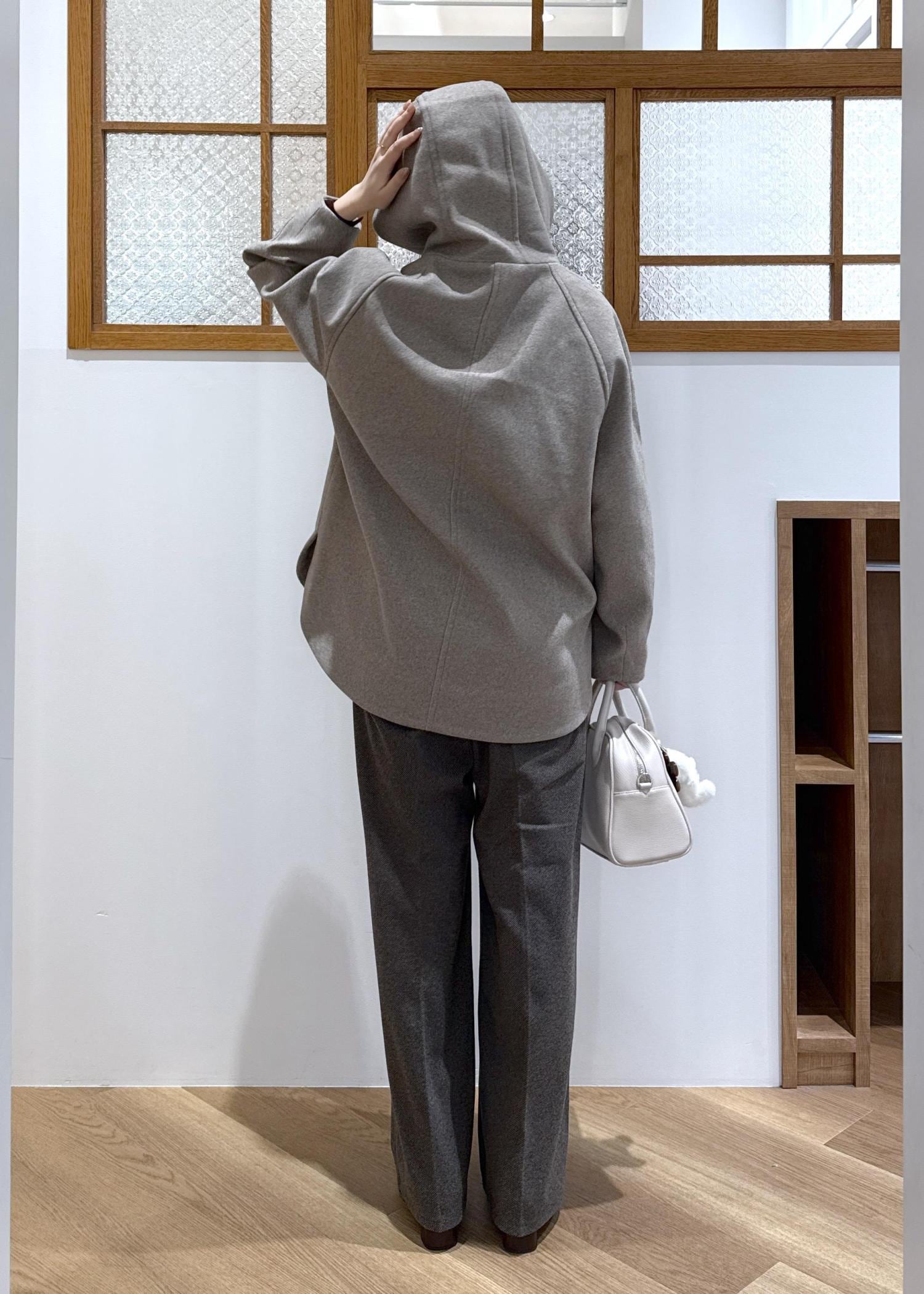 大きめのフードが付いているためこなれた印象になり、小顔効果にもなります。