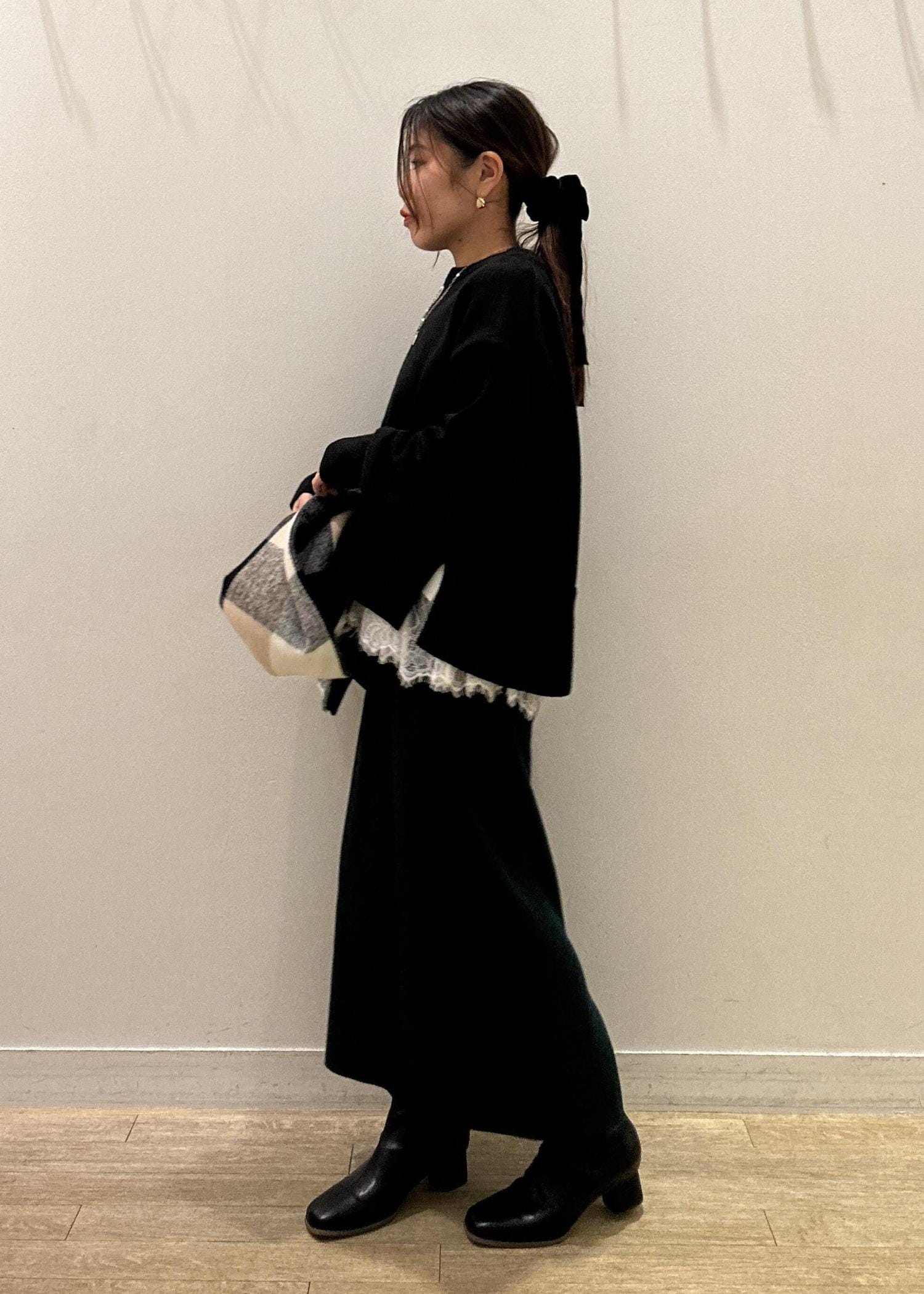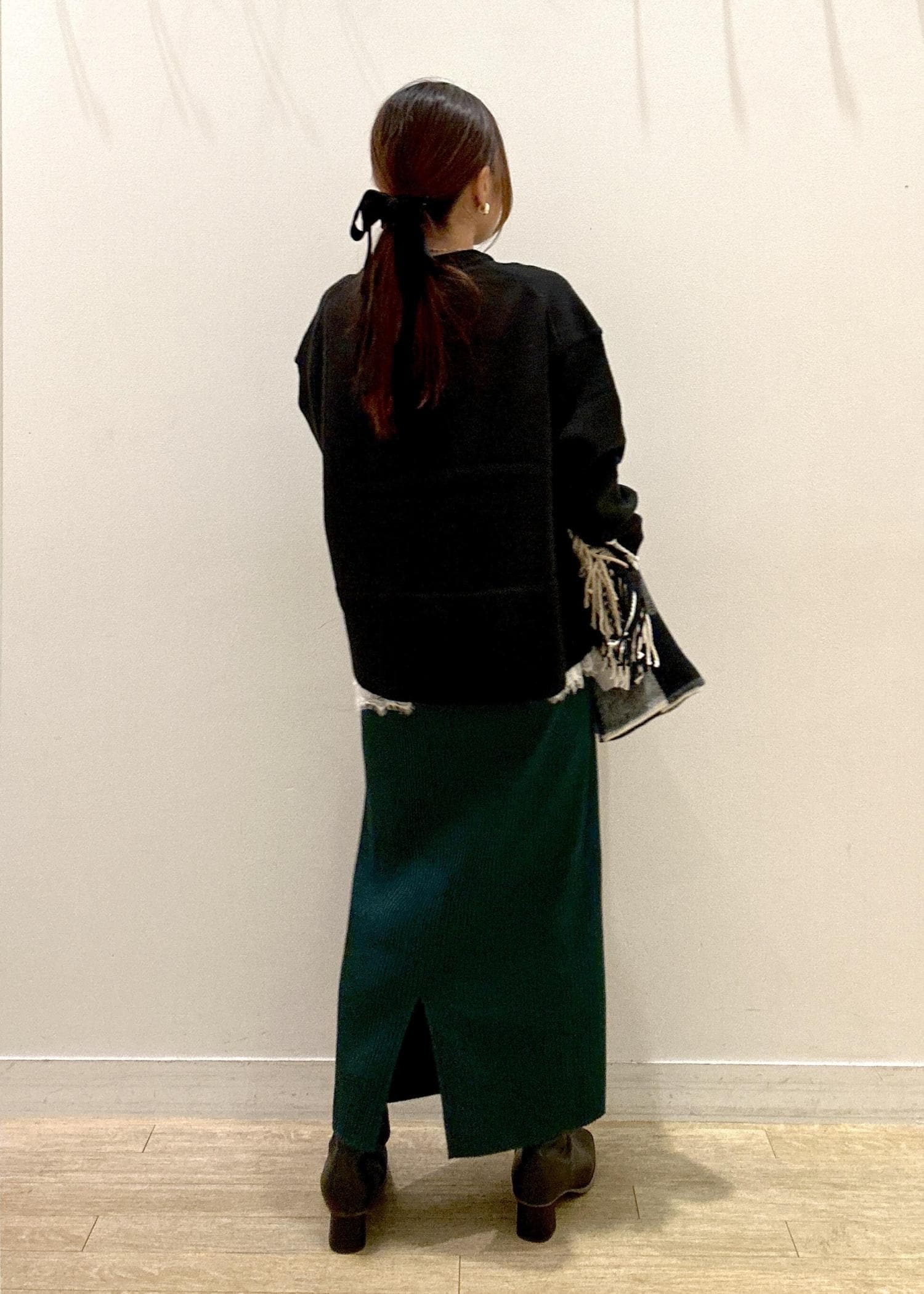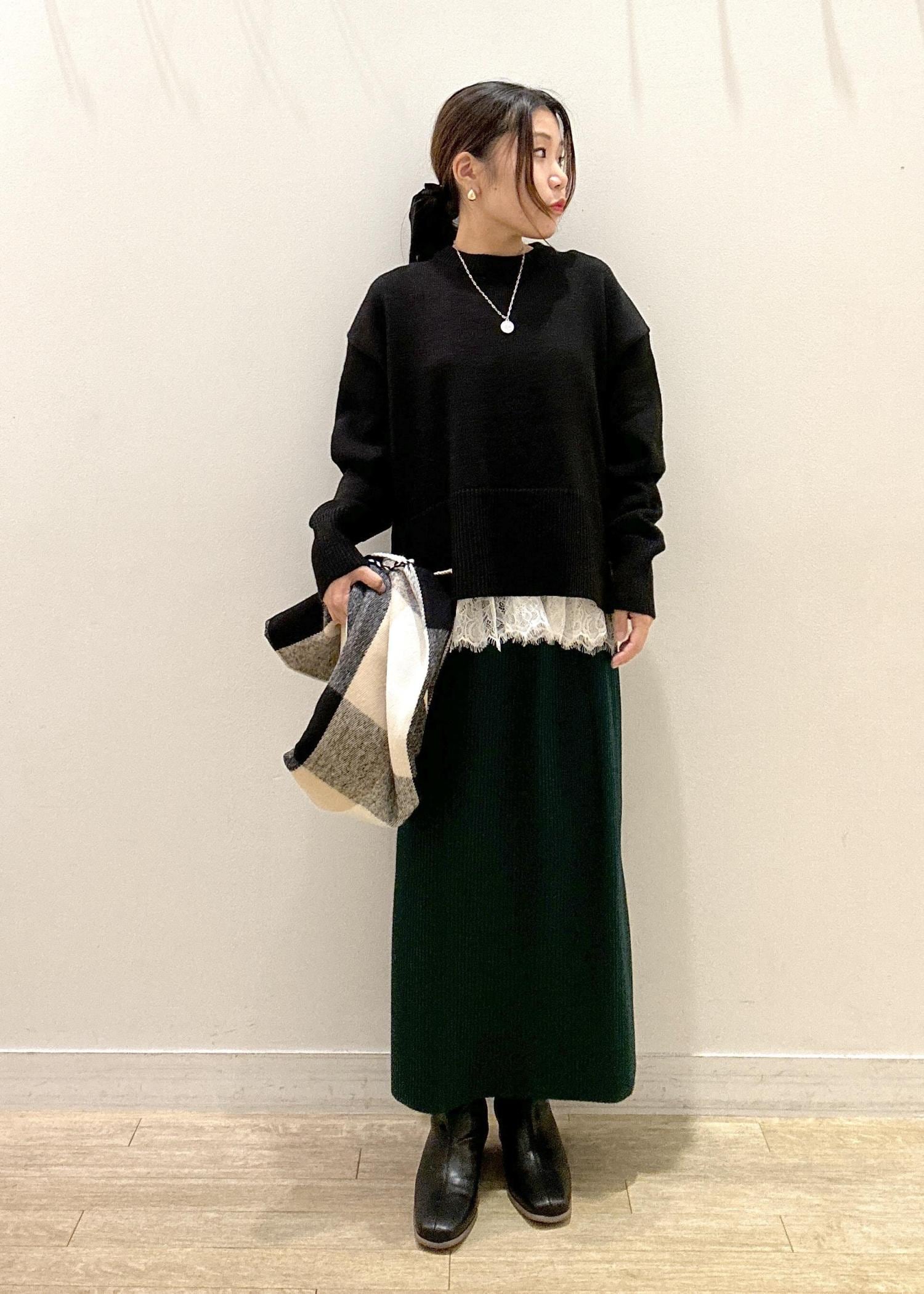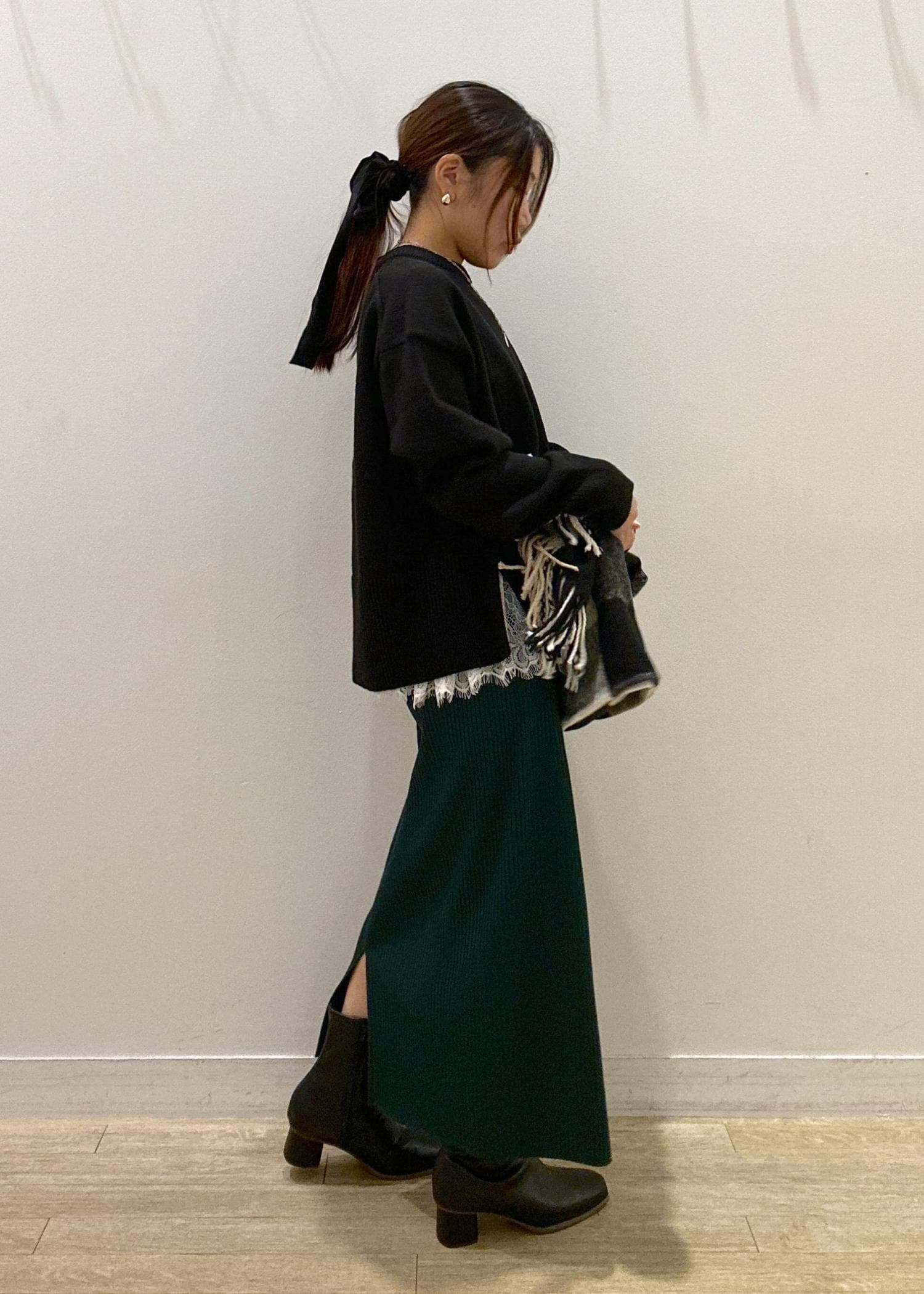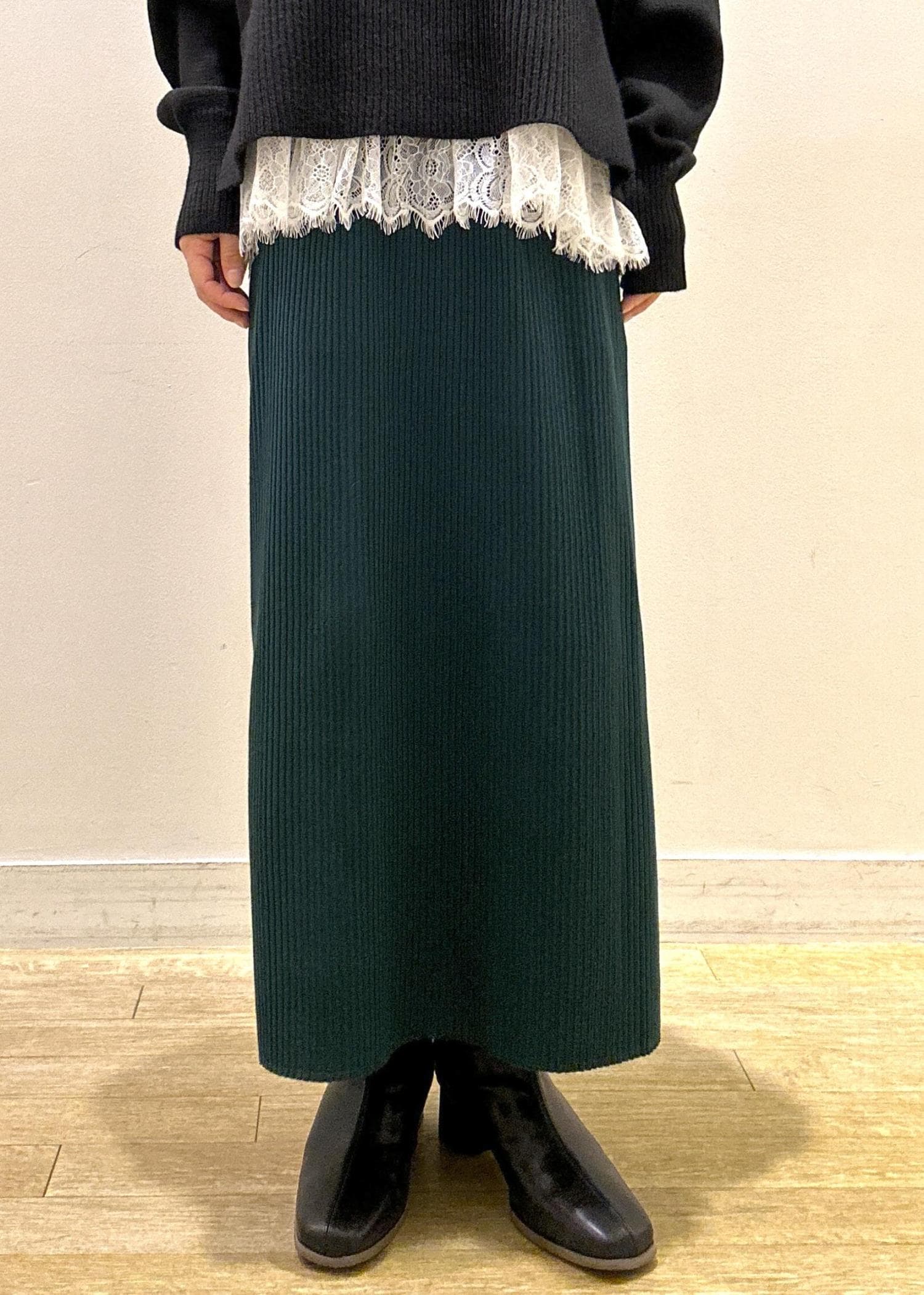 ROPÉ PICNICトタンテレコ Iラインリブニットスカートダークグリーン / 36¥4,499レビュー147cmでもフラットシューズで引きずることなく履けたので、低身長の方にもおすすめです。