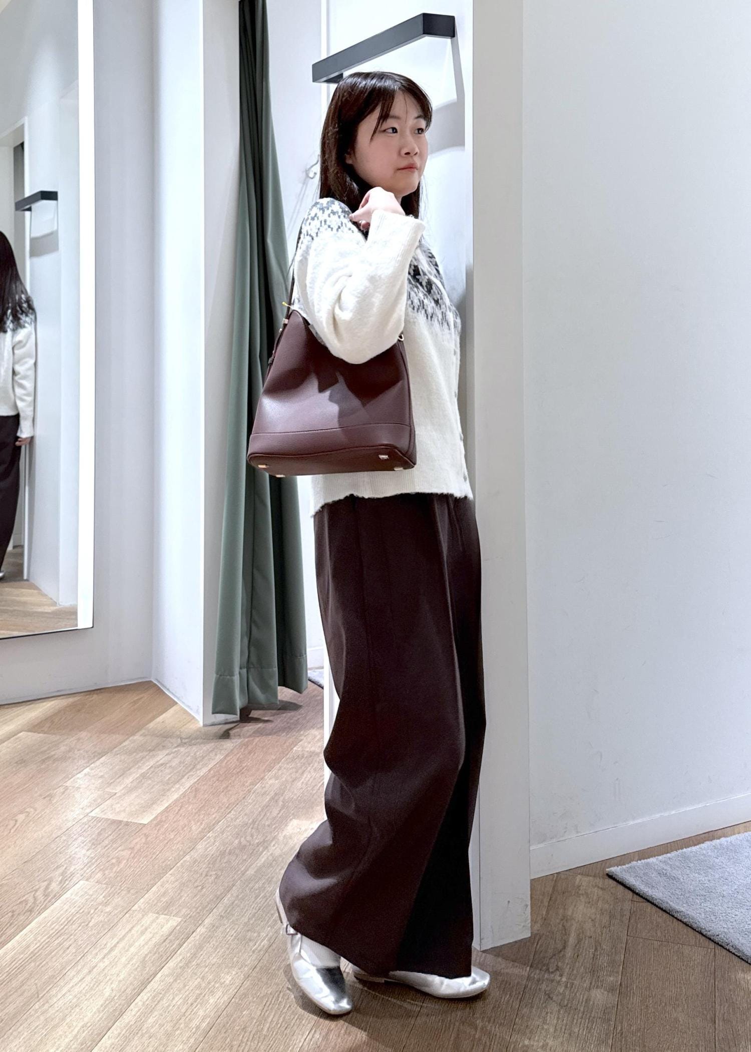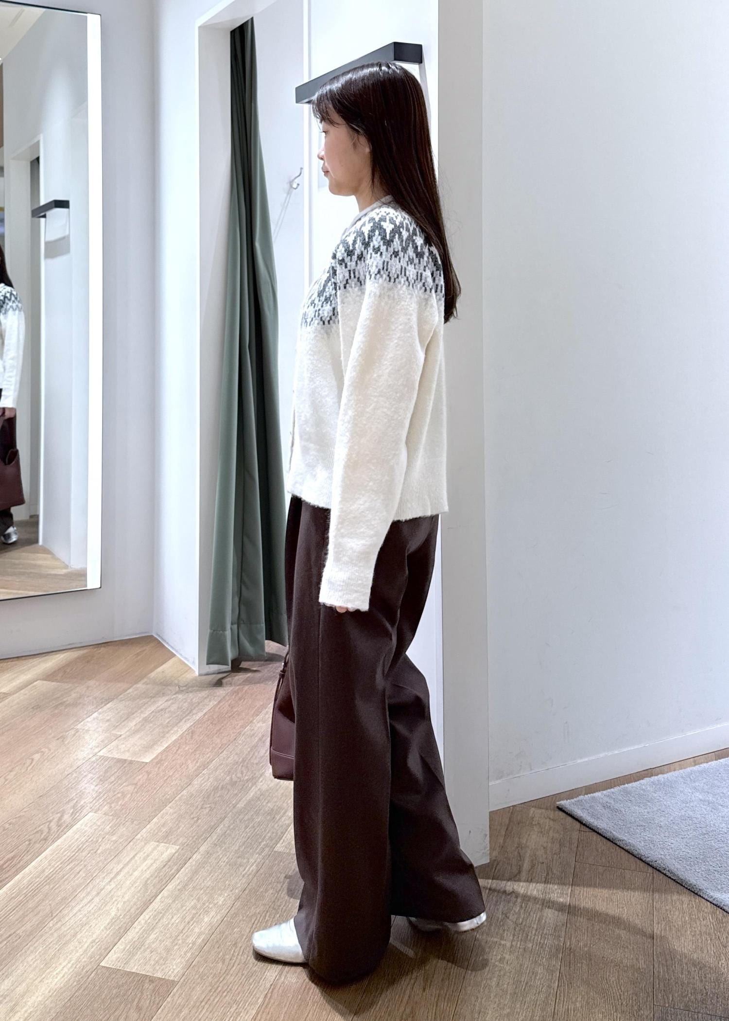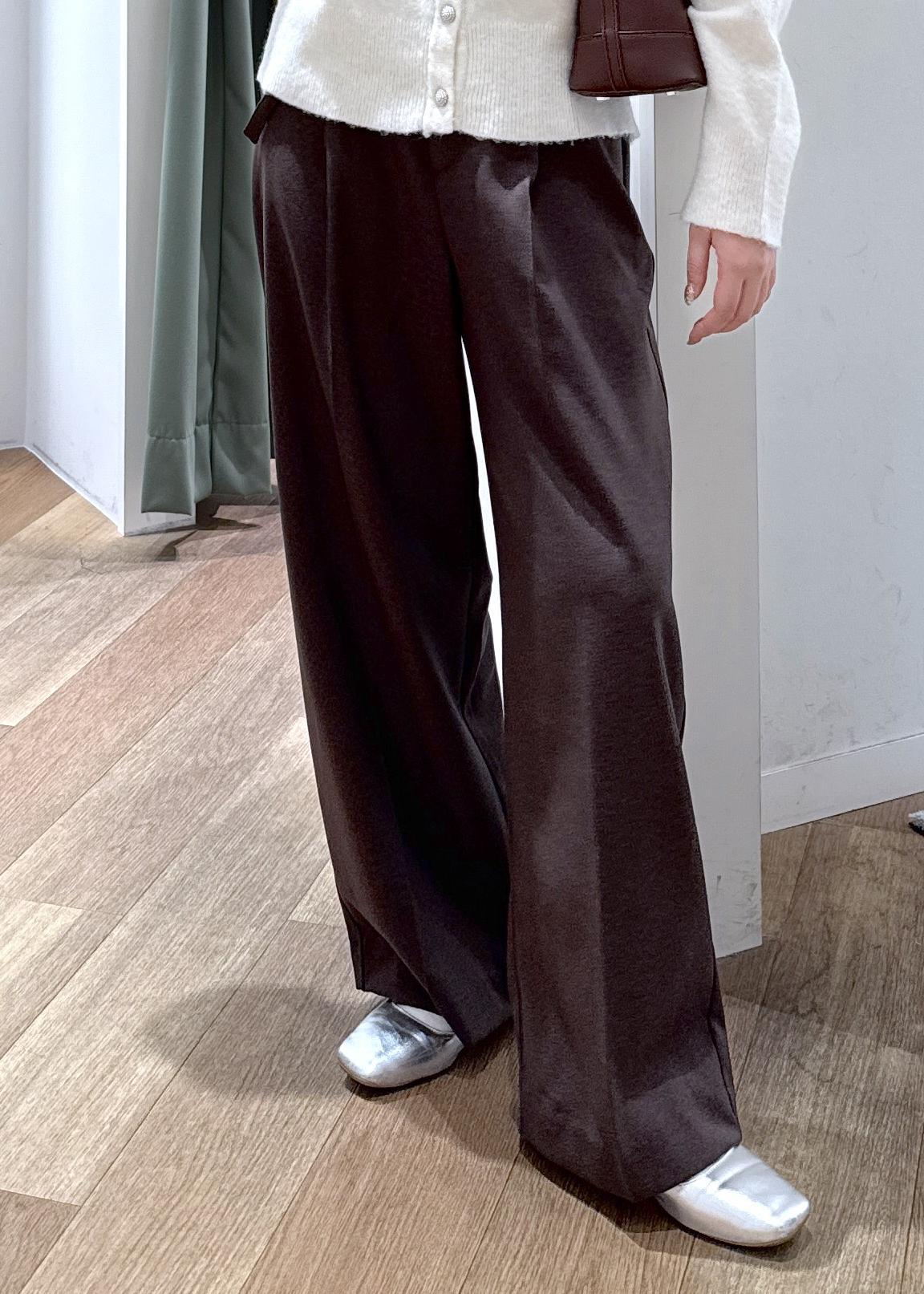 トレンド色のダークブラウンのパンツを合わせ、落ち着いた大人らしい雰囲気に仕上げました。