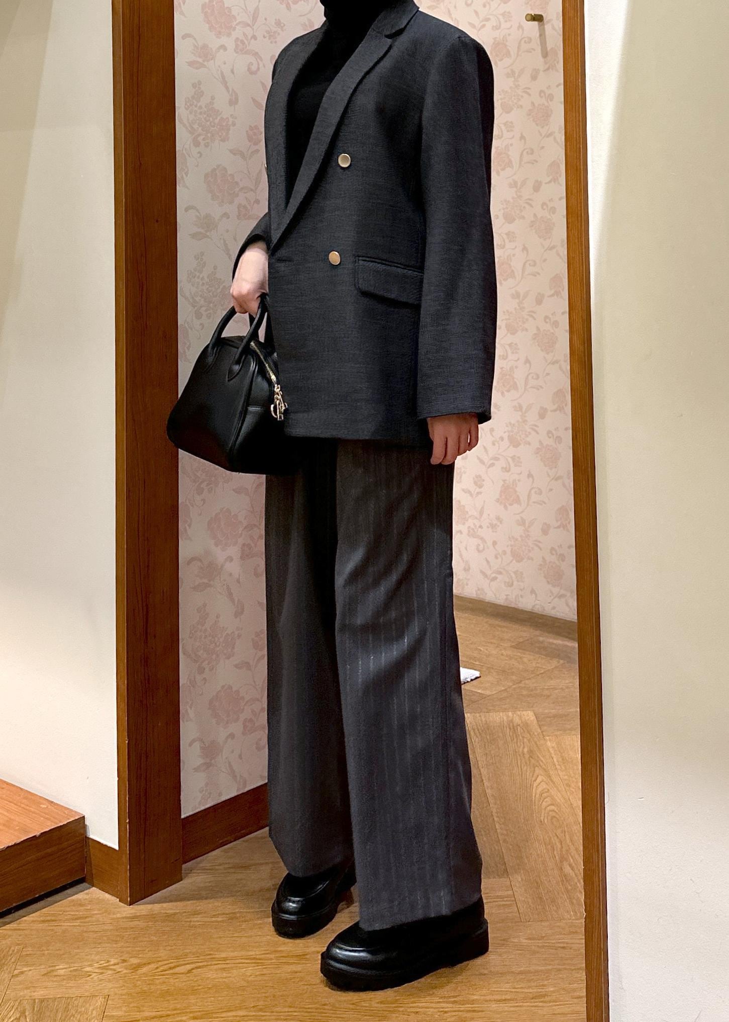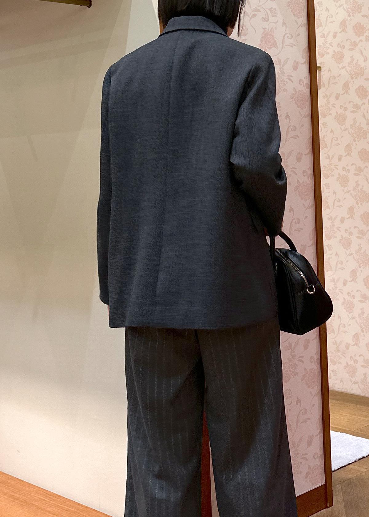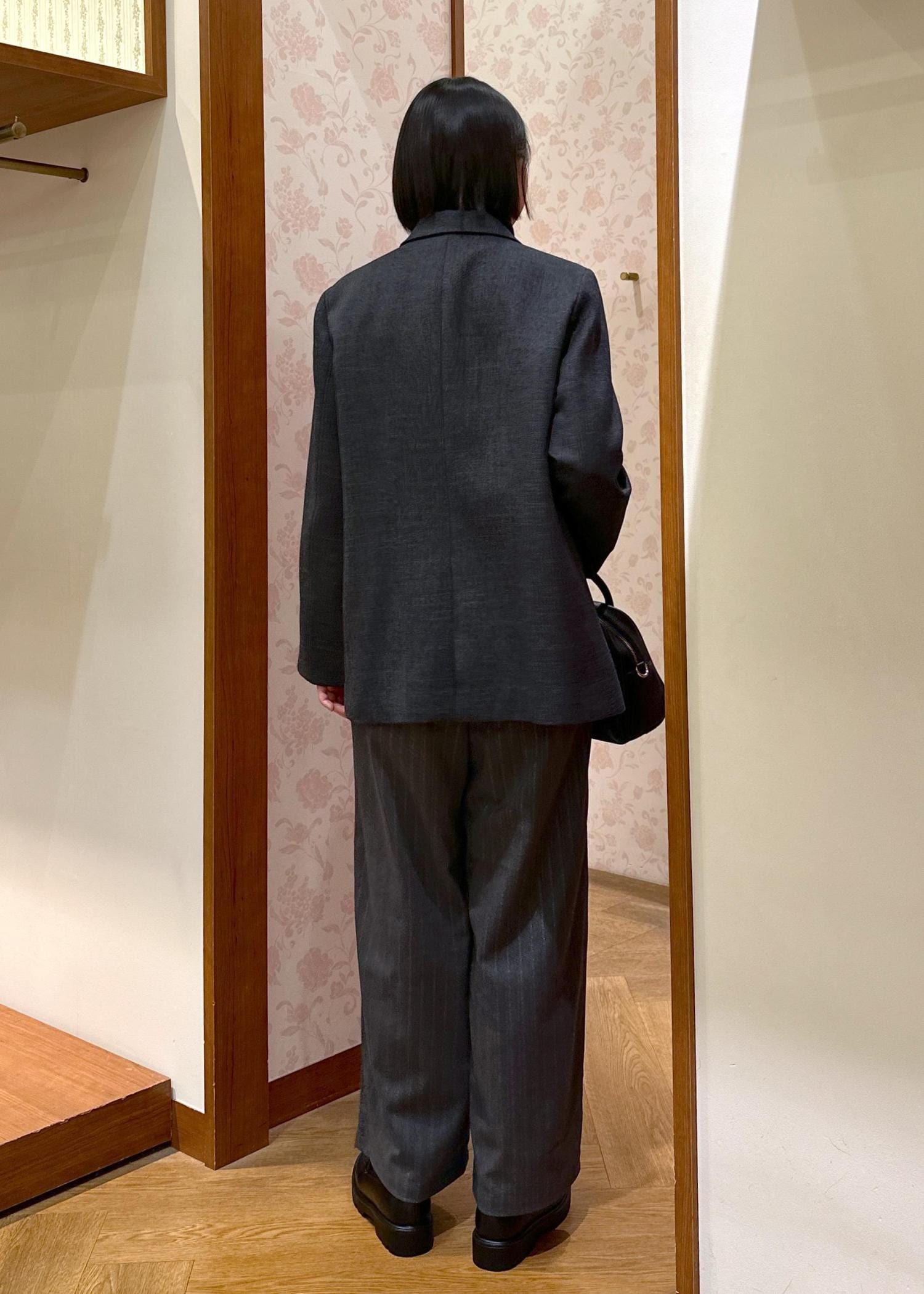 ジャケットとパンツはセットアップではございませんが、色を合わせて着用してみました。ジャケットは厚めな生地感でオーバーなサイズ感なのでコート代わりにも◎