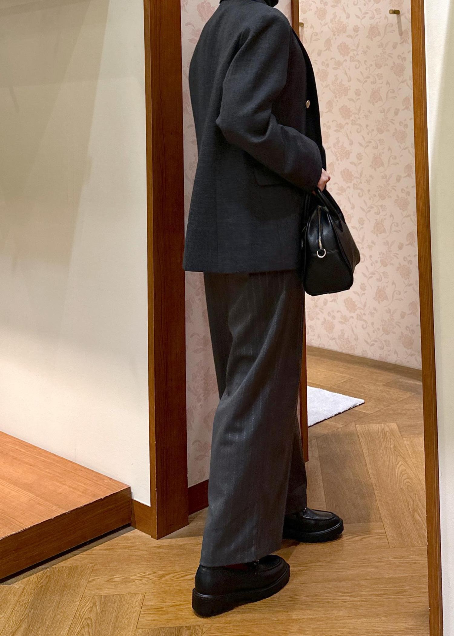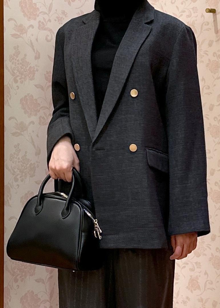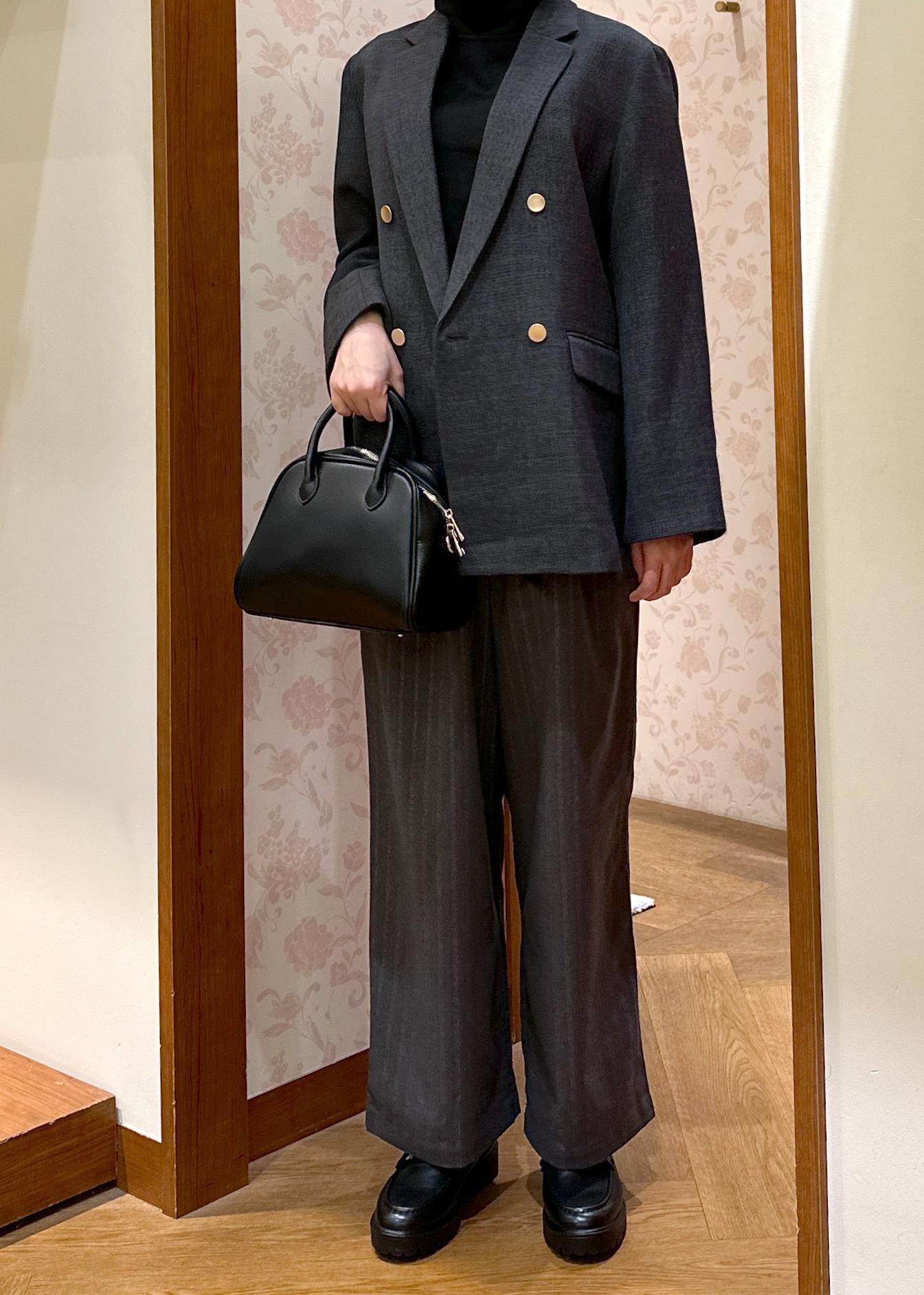 ジャケットとパンツはセットアップではございませんが、色を合わせて着用してみました。ジャケットは厚めな生地感でオーバーなサイズ感なのでコート代わりにも◎