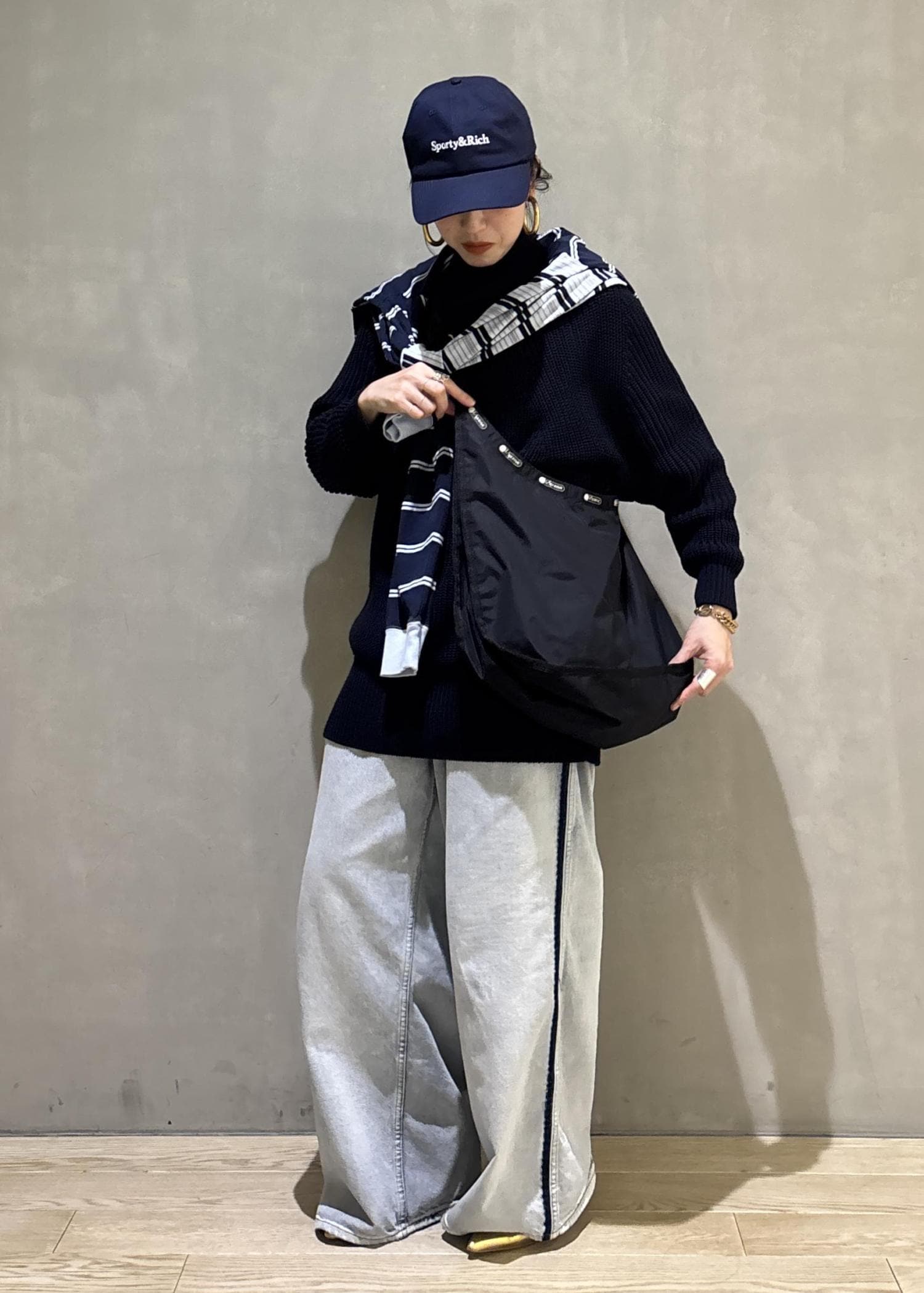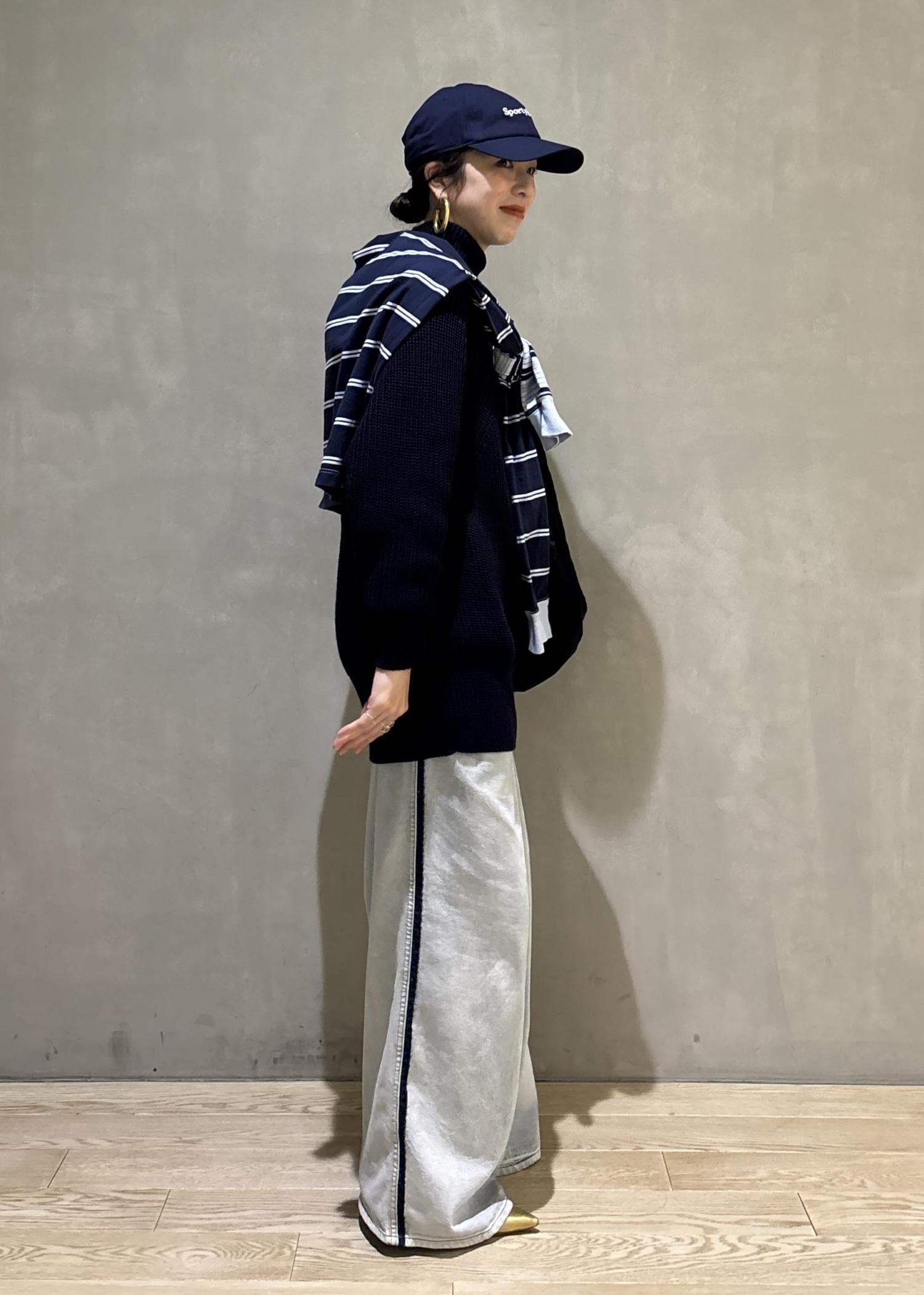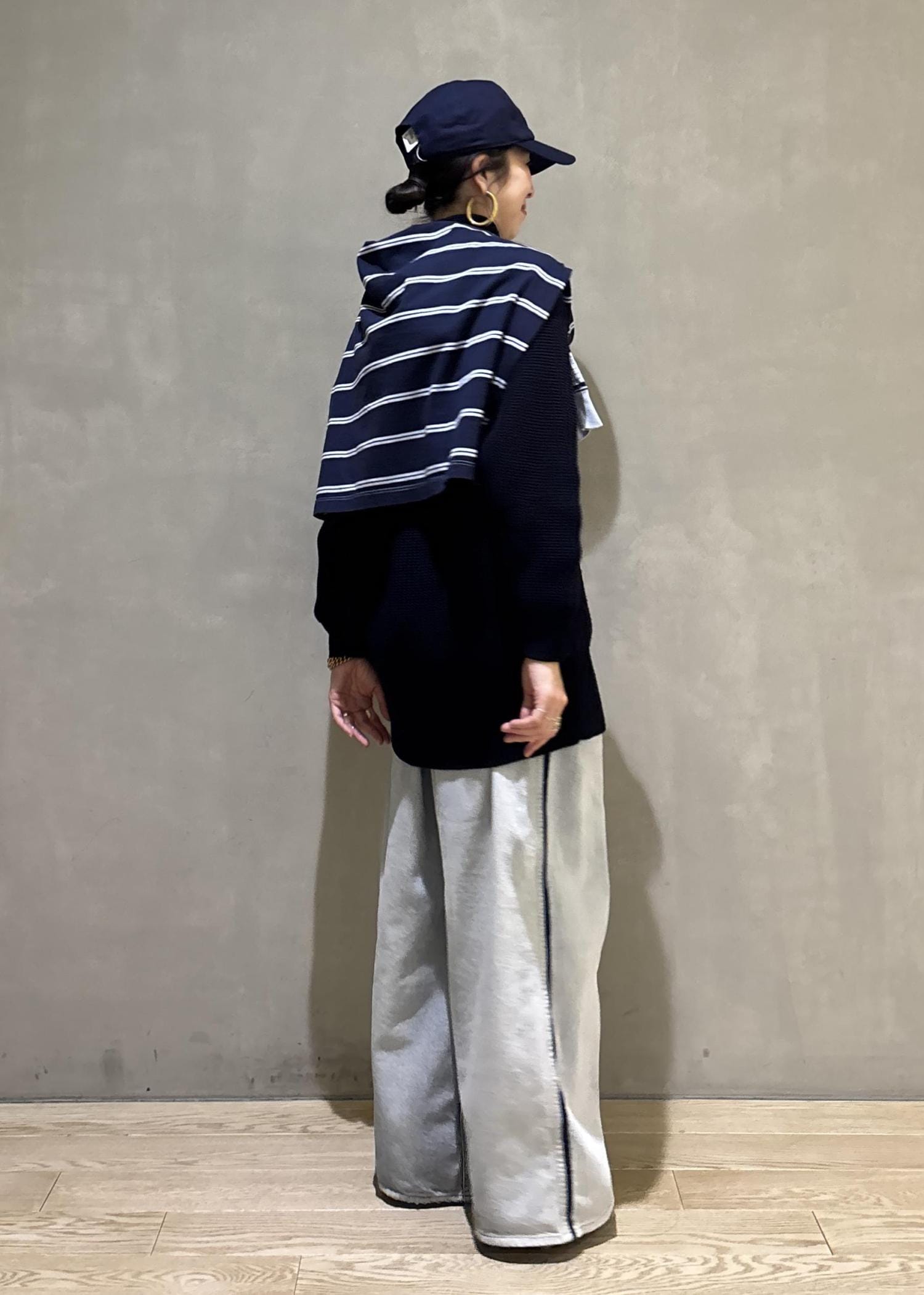 スポーティなスタイルなのであえてネイビーとブルーを使ってまとめましたが、足元はパンプスで少し綺麗めさをプラス。カラー使いもポイントです。