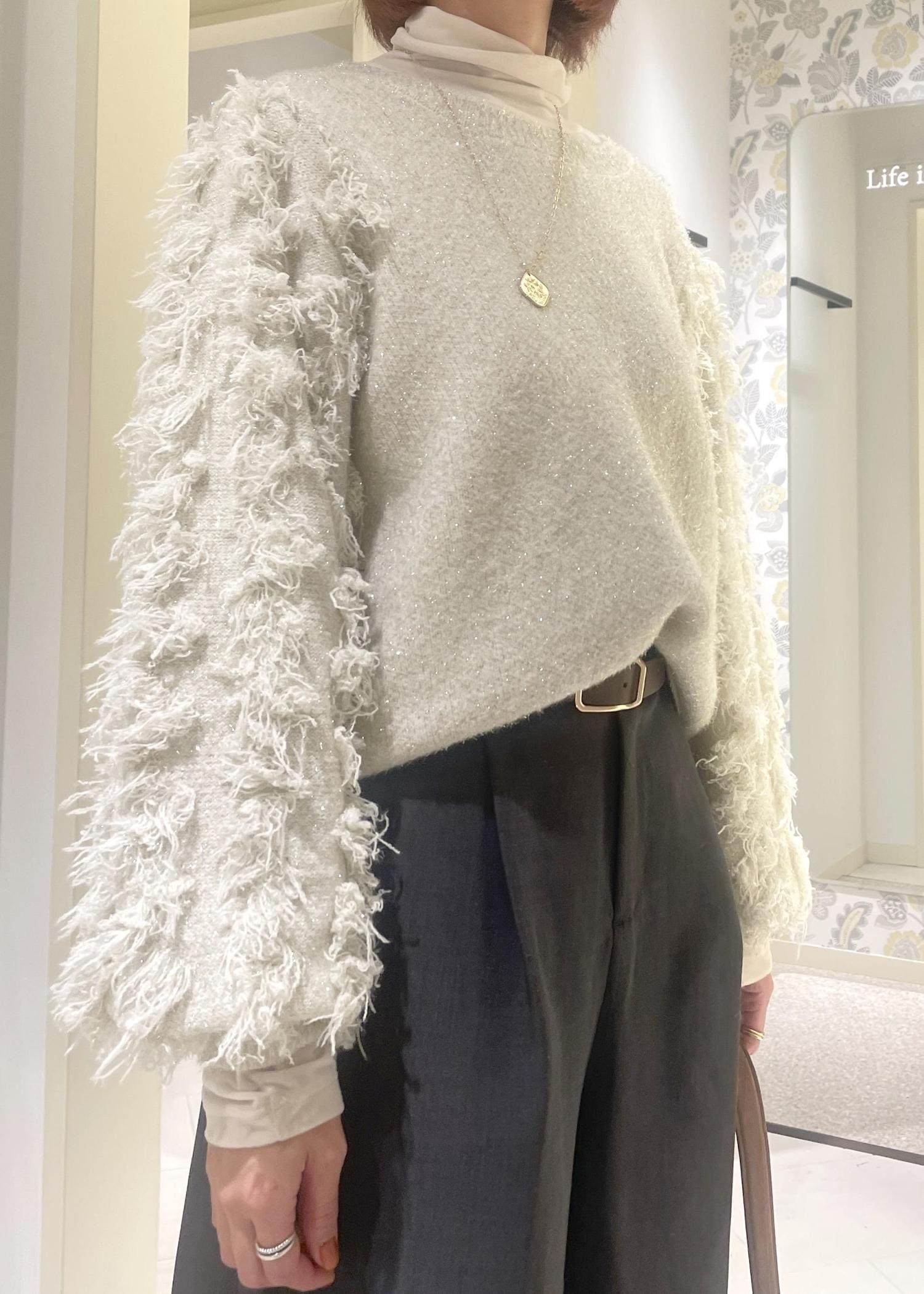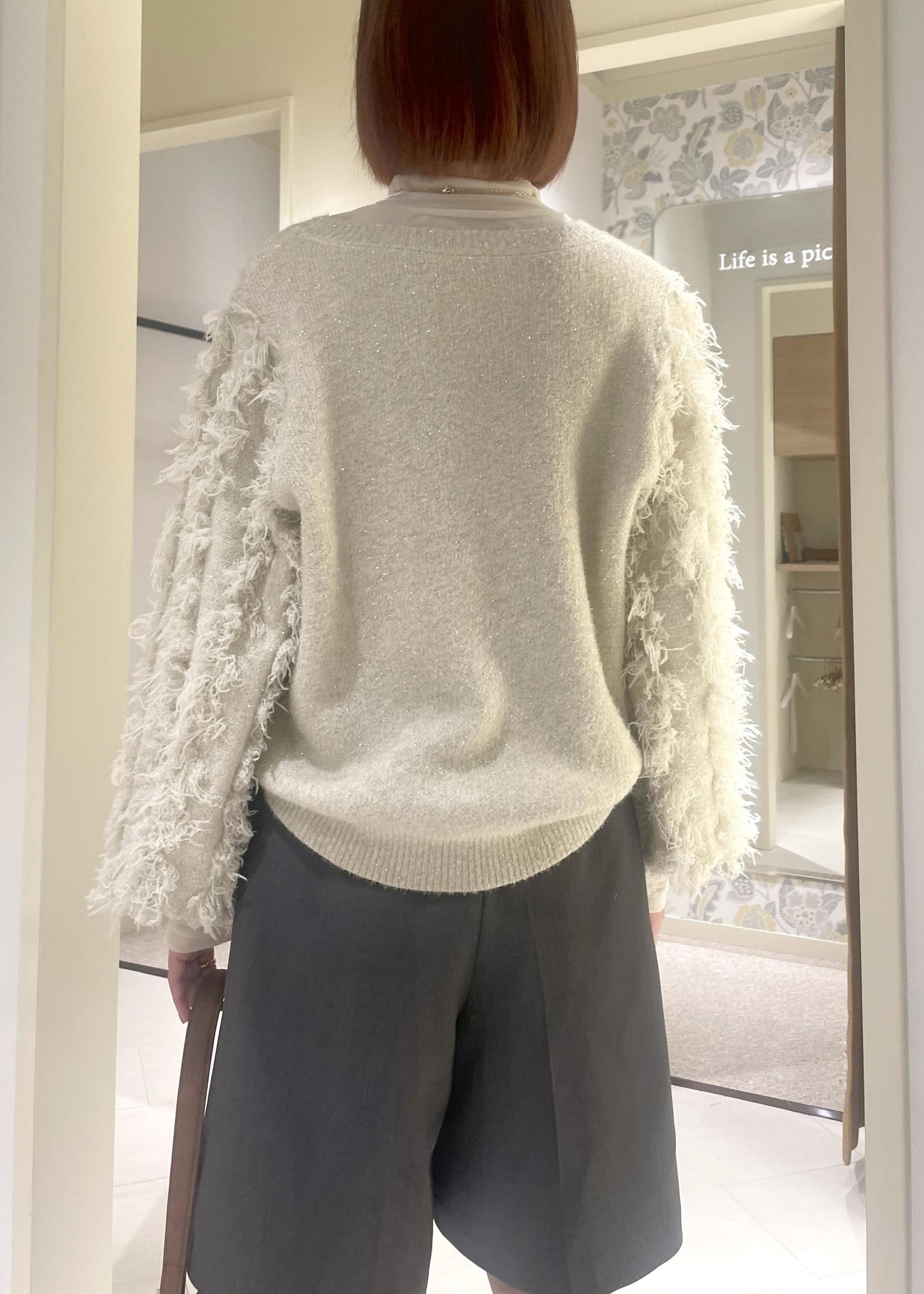 キラッと上品さのあるラメ感と、袖のフリンジでアウターを脱いでもオシャレにキマる一着です!