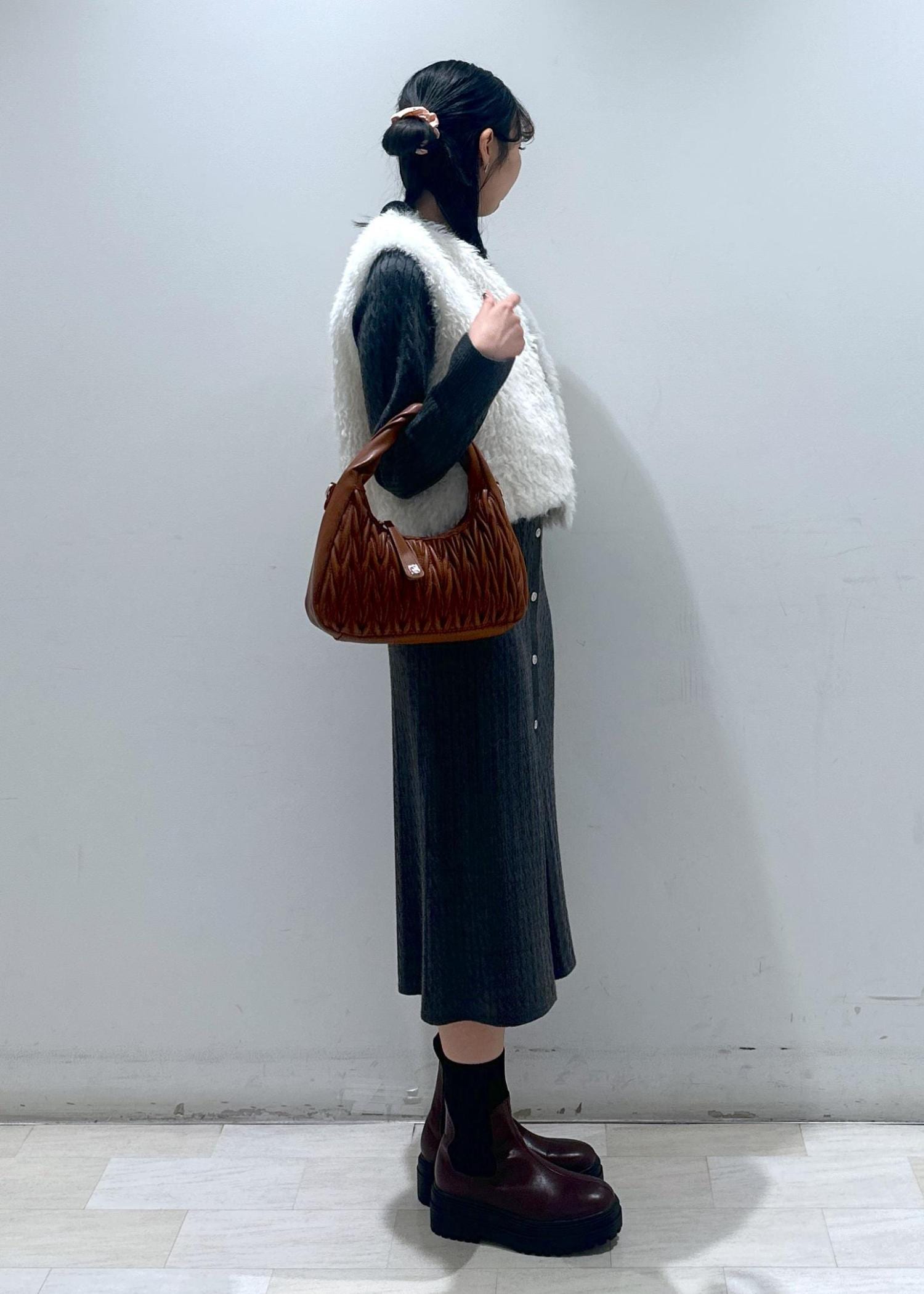 ノーカラーデザインなので、ハイネックのトップスとの組み合わせも◎ -