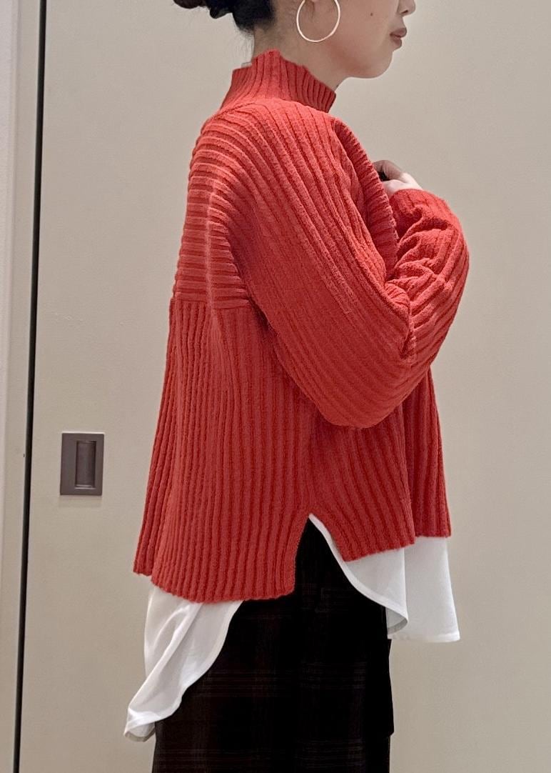 コートの下は赤ニットと布帛のカットソーをレイヤードして、コートを脱いでもお洒落を意識してみました◎