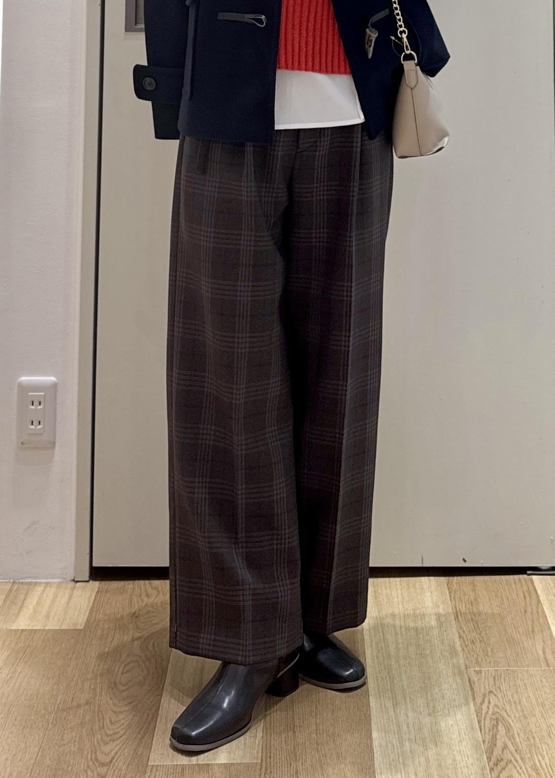コートのフードについているファーの色に合わせてボトムスはブラウンチェックのパンツをチョイス。