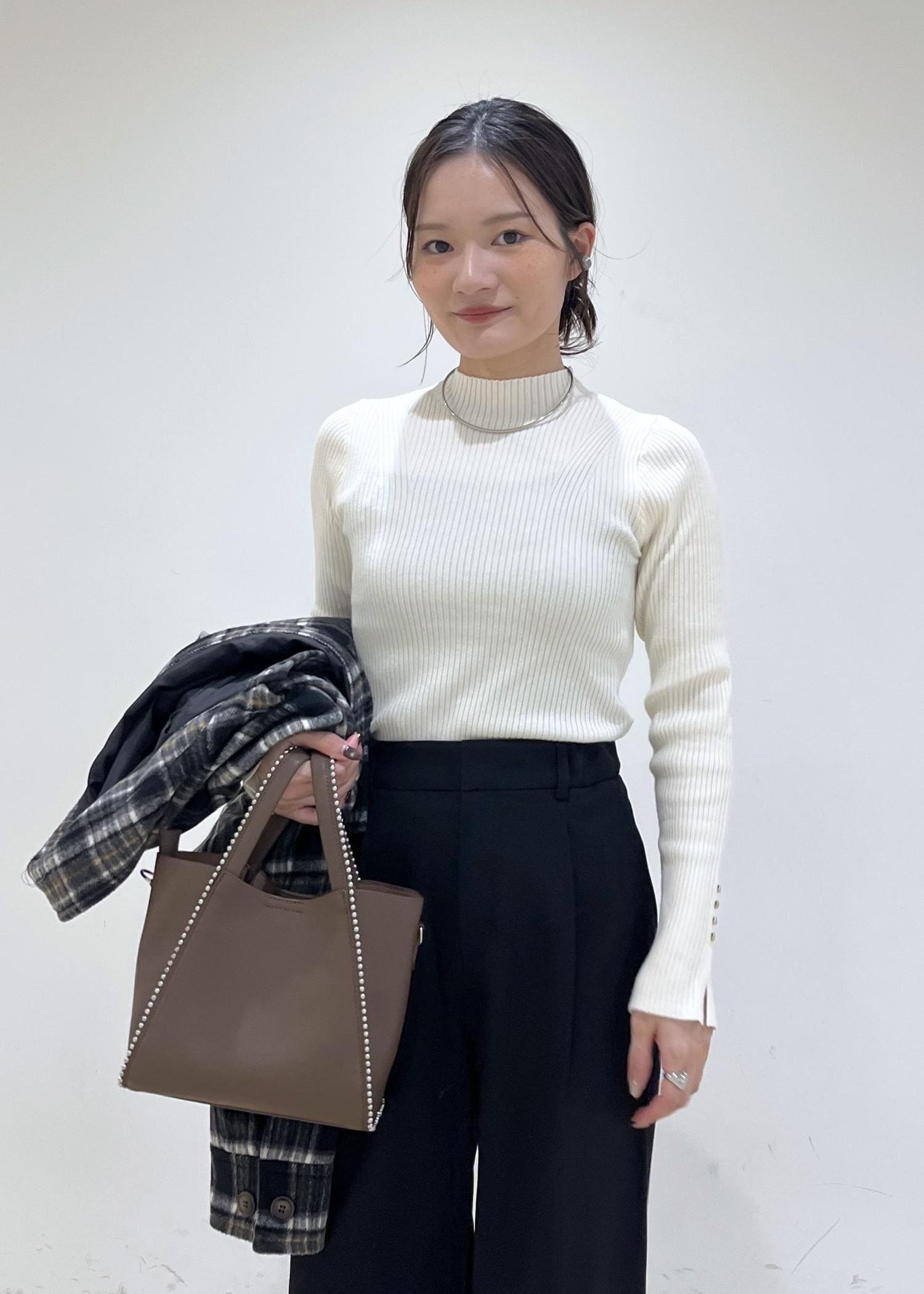 ヘアはお団子ヘア、インナーはフィット感あるニットで