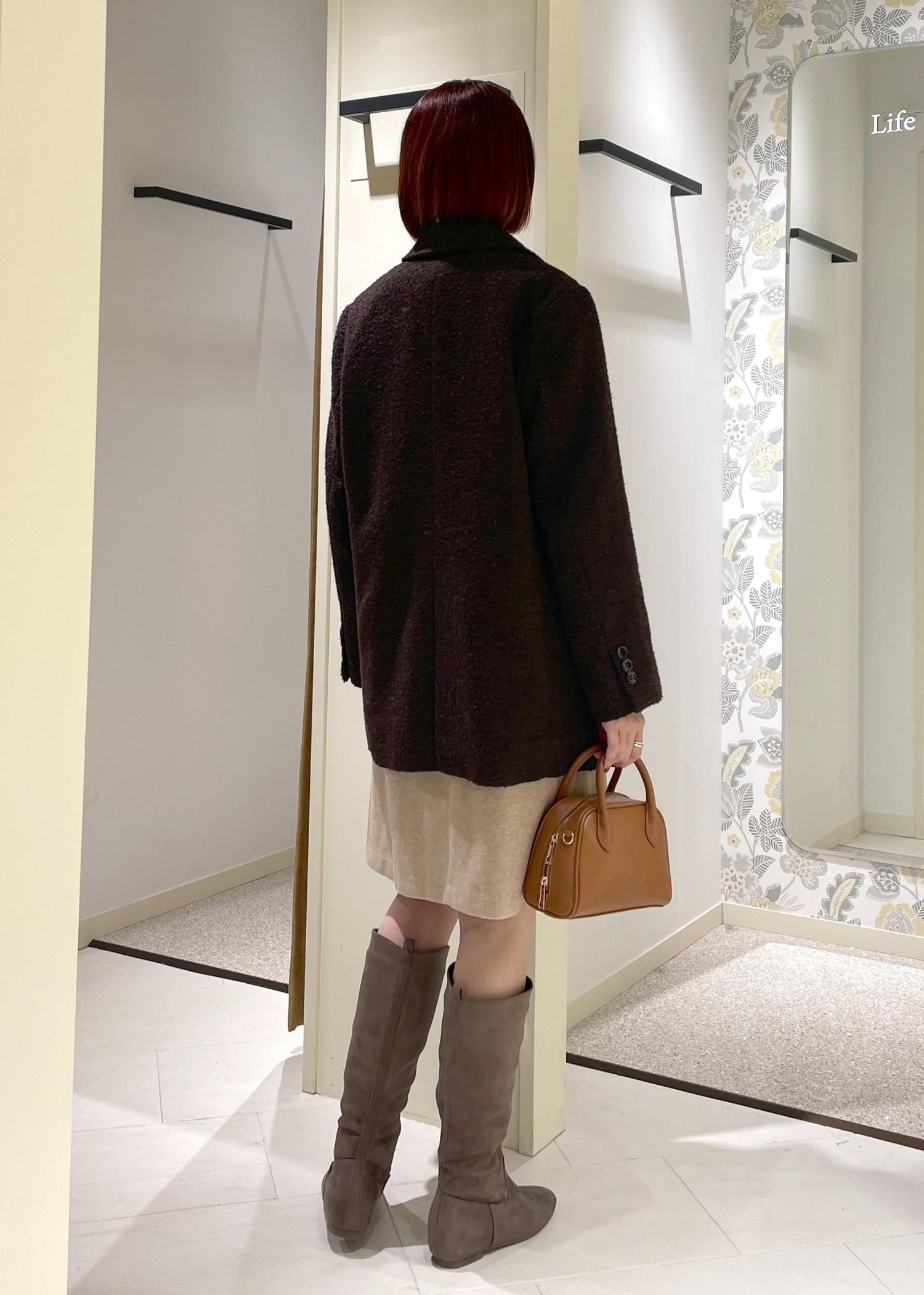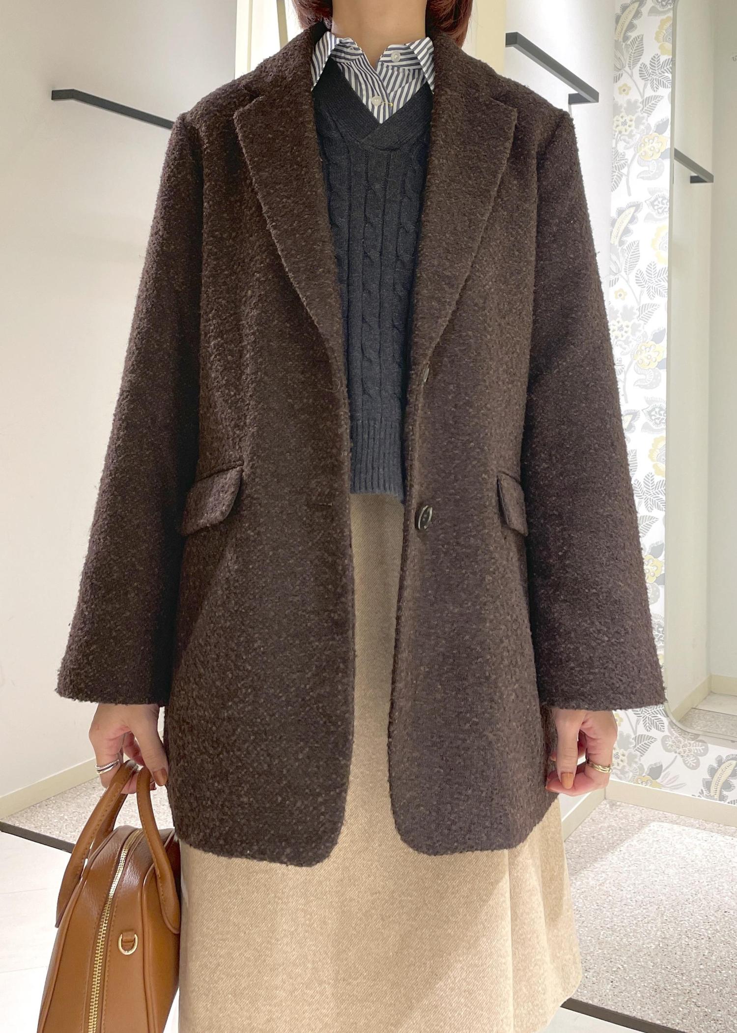 着丈はヒップが隠れるくらいの安心感のある丈感ですが、ボタン位置もやや高めなので、重たい印象にならずすっきりと着て頂けます。