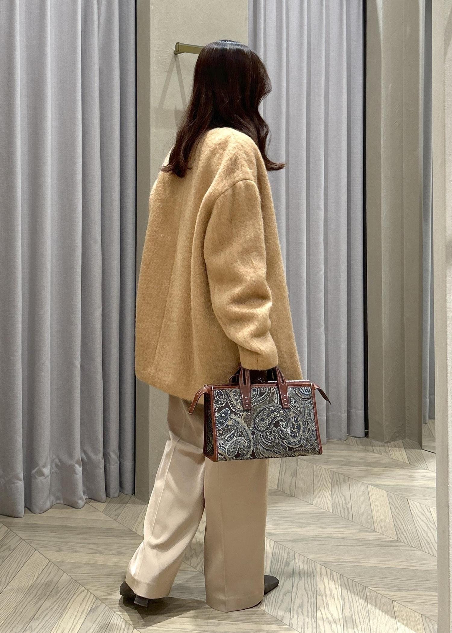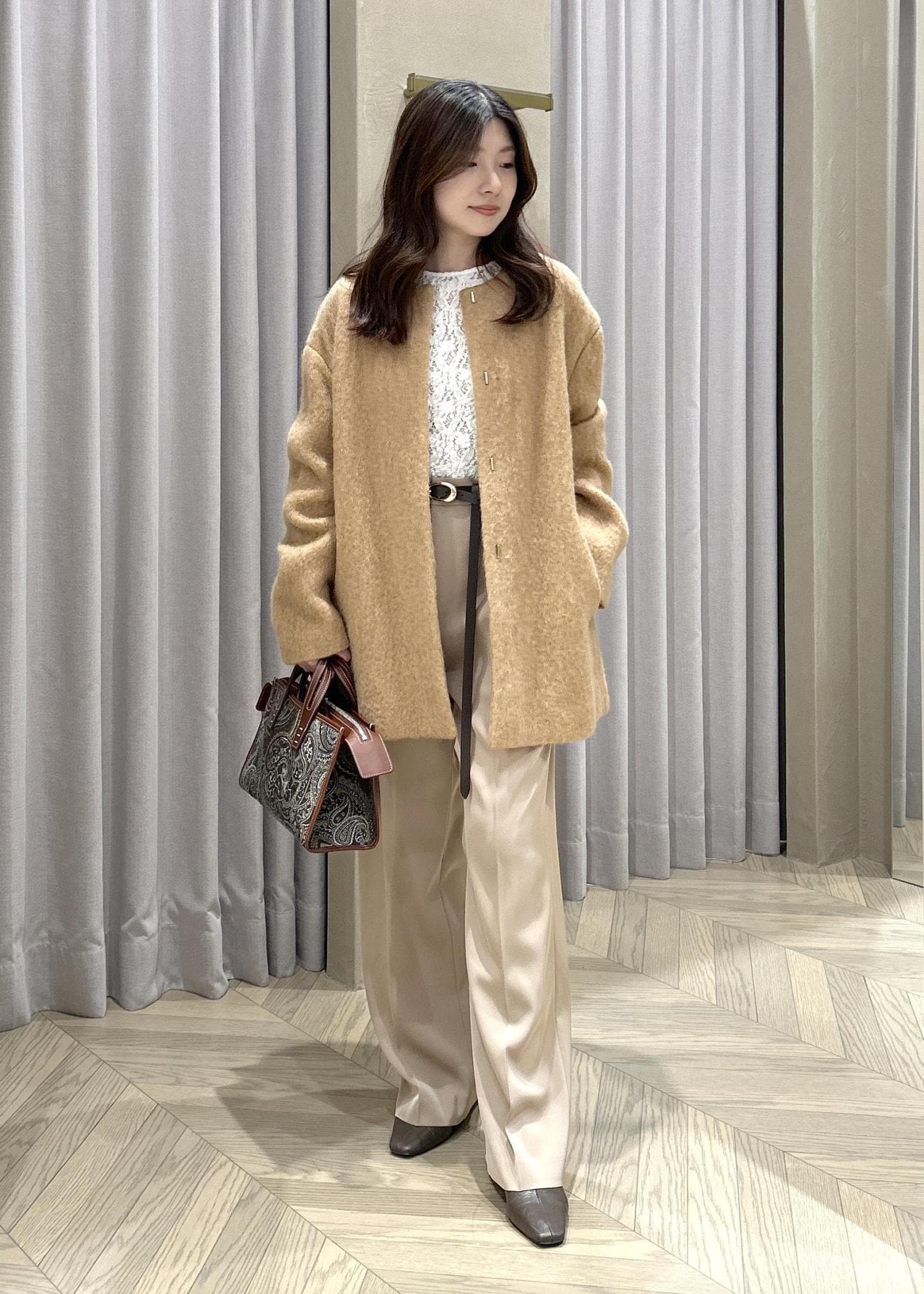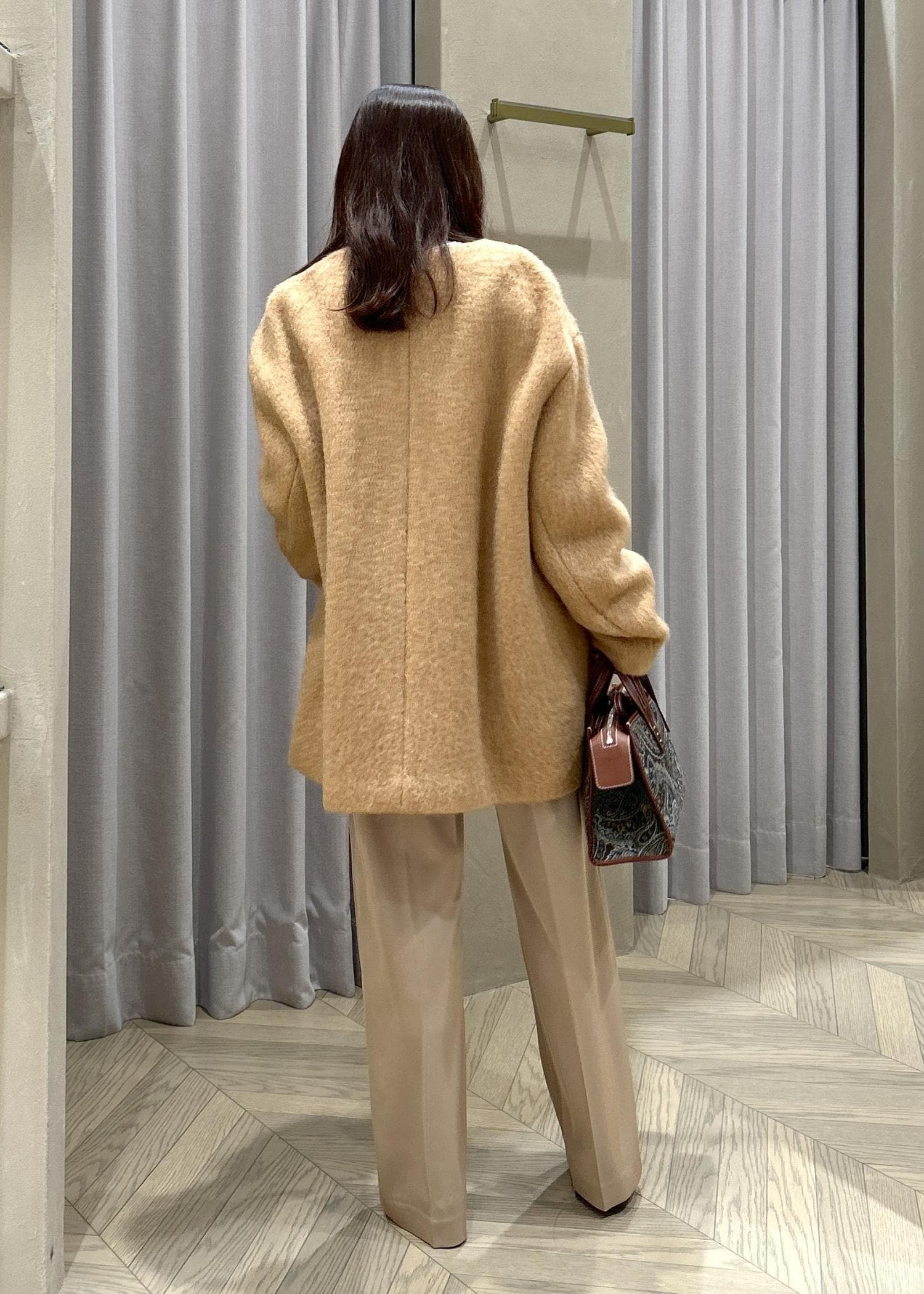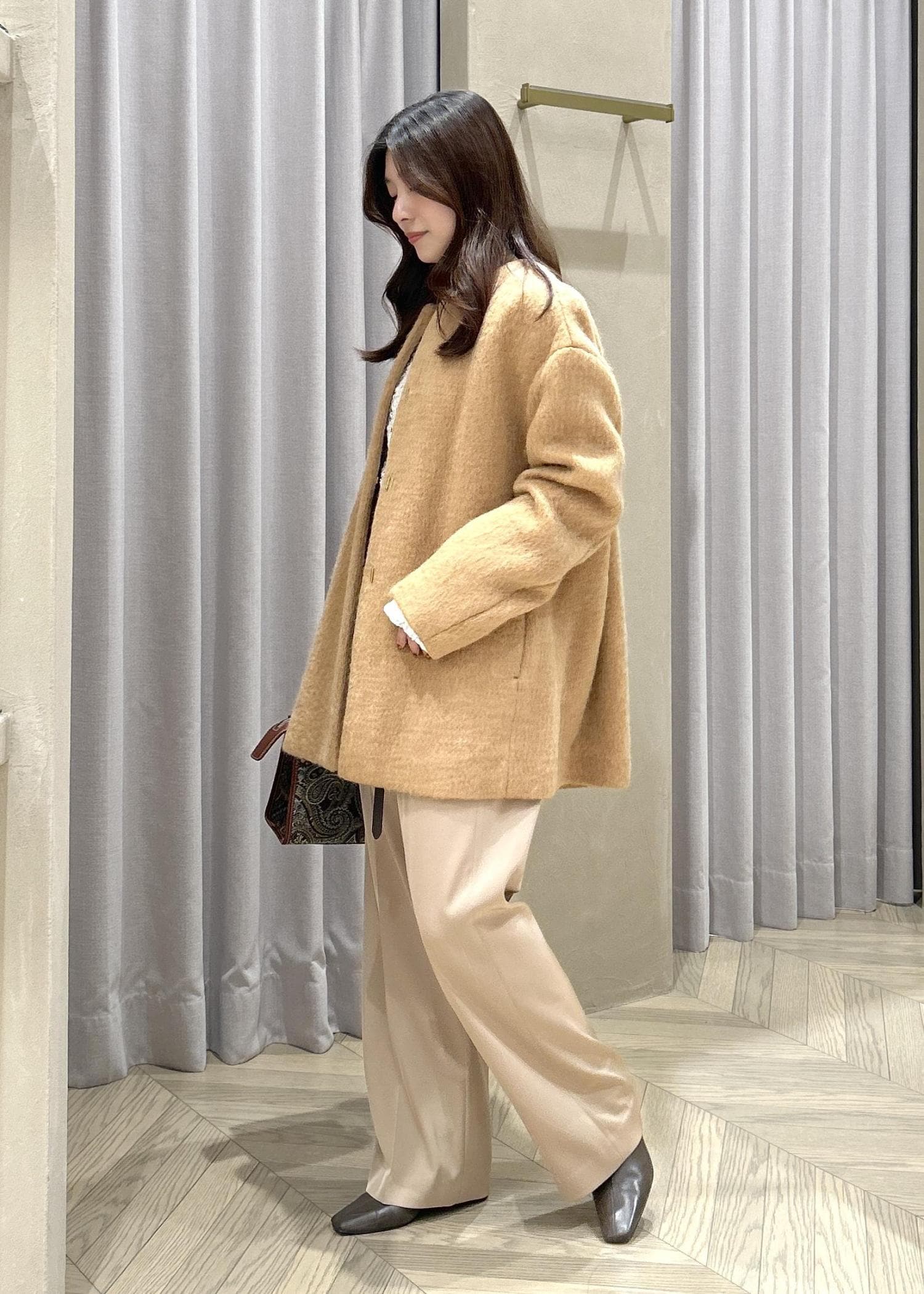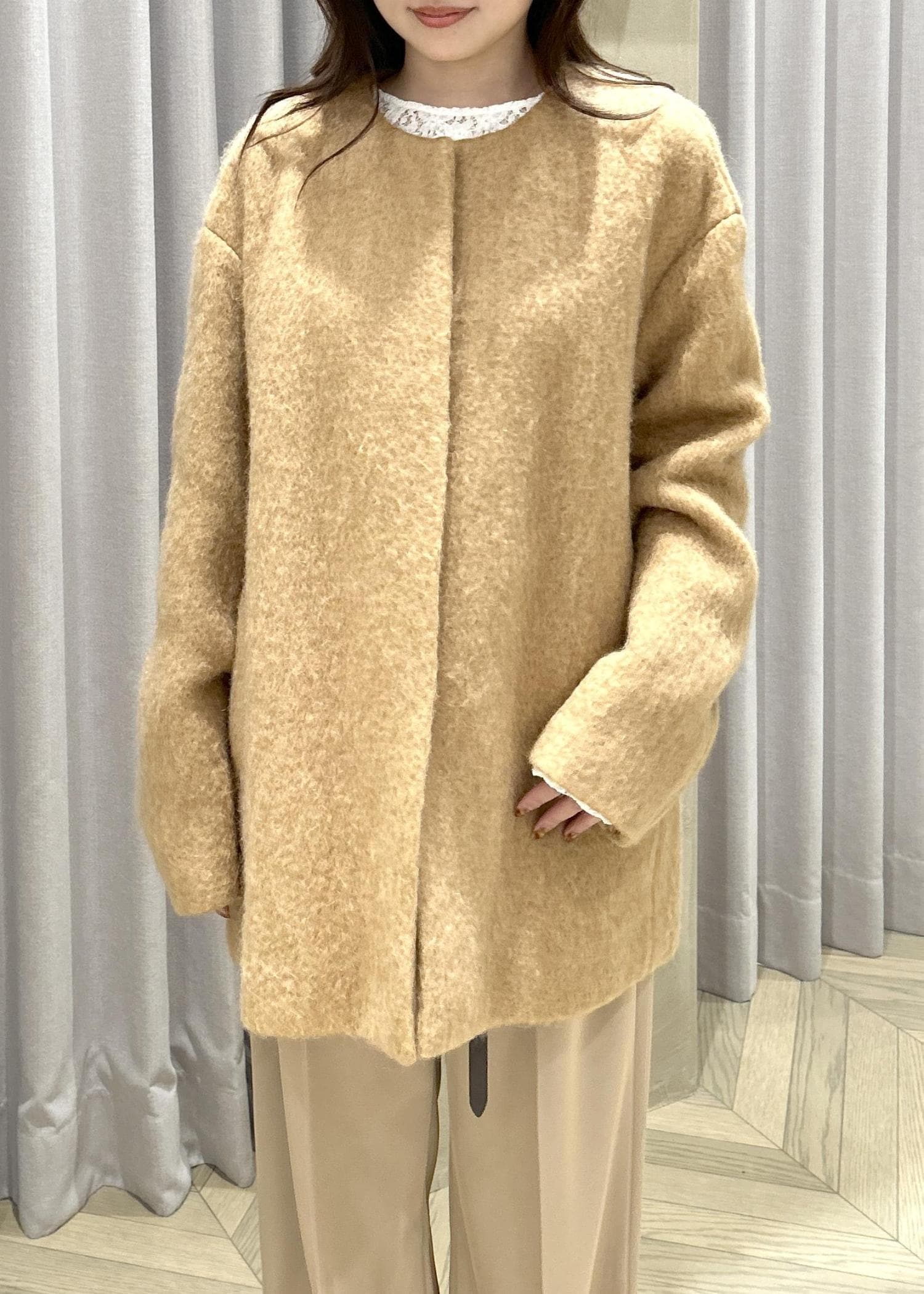 ROPÉウールモヘヤノーカラーミドル丈コートベージュ / F¥68,200レビュー身長151㎝の私が着用して、太ももが隠れる程度の丈感(ひざ上10㎝あたり)です。