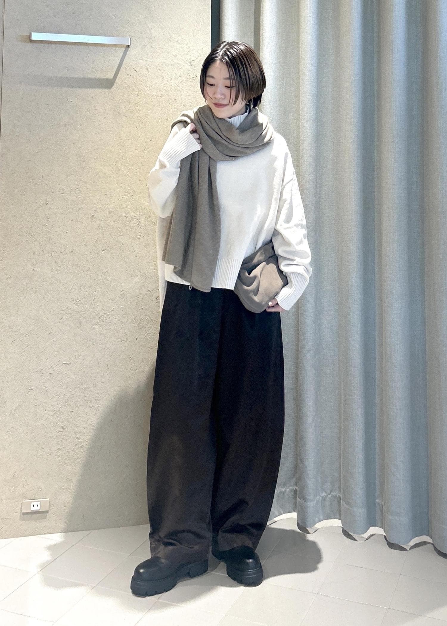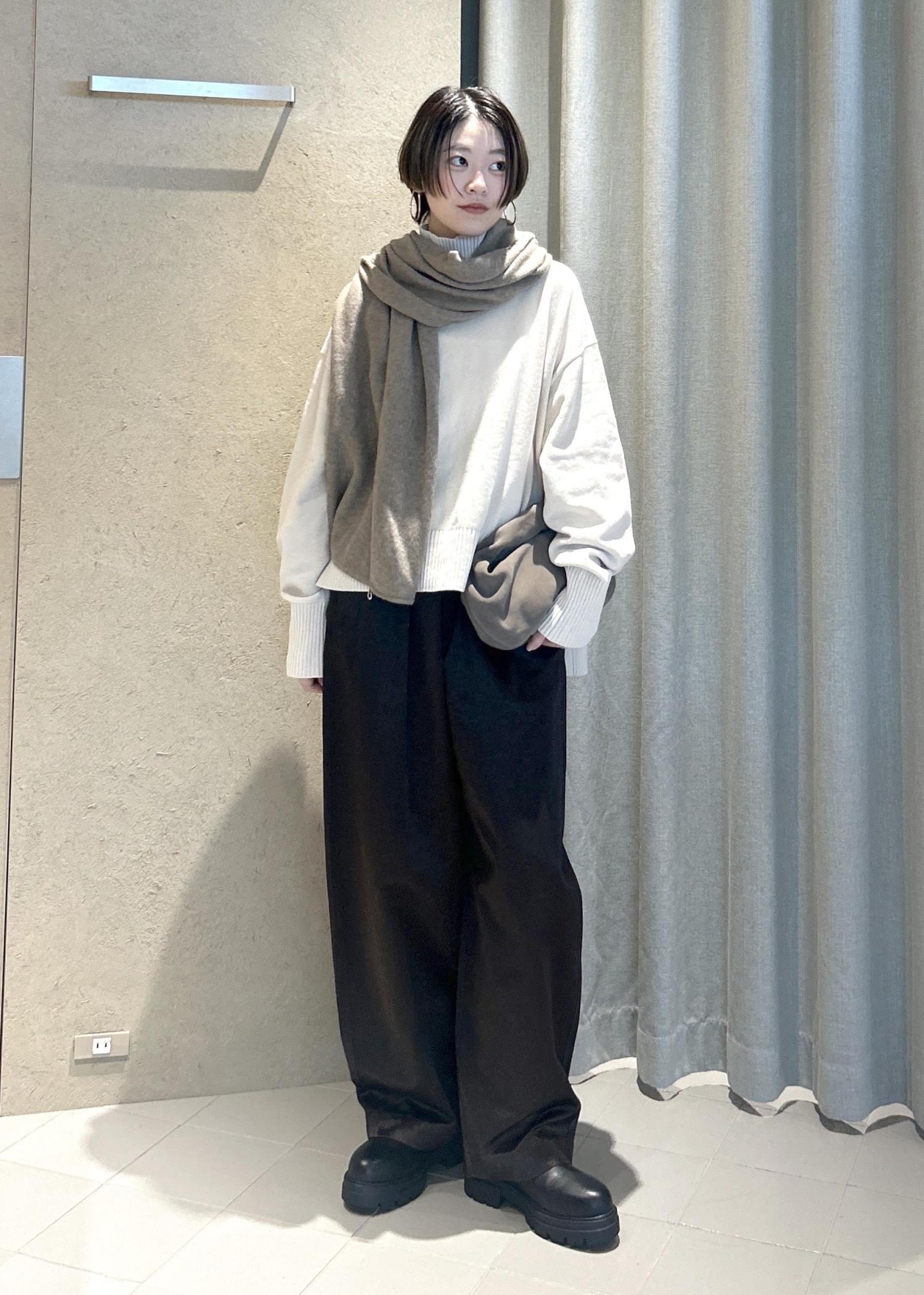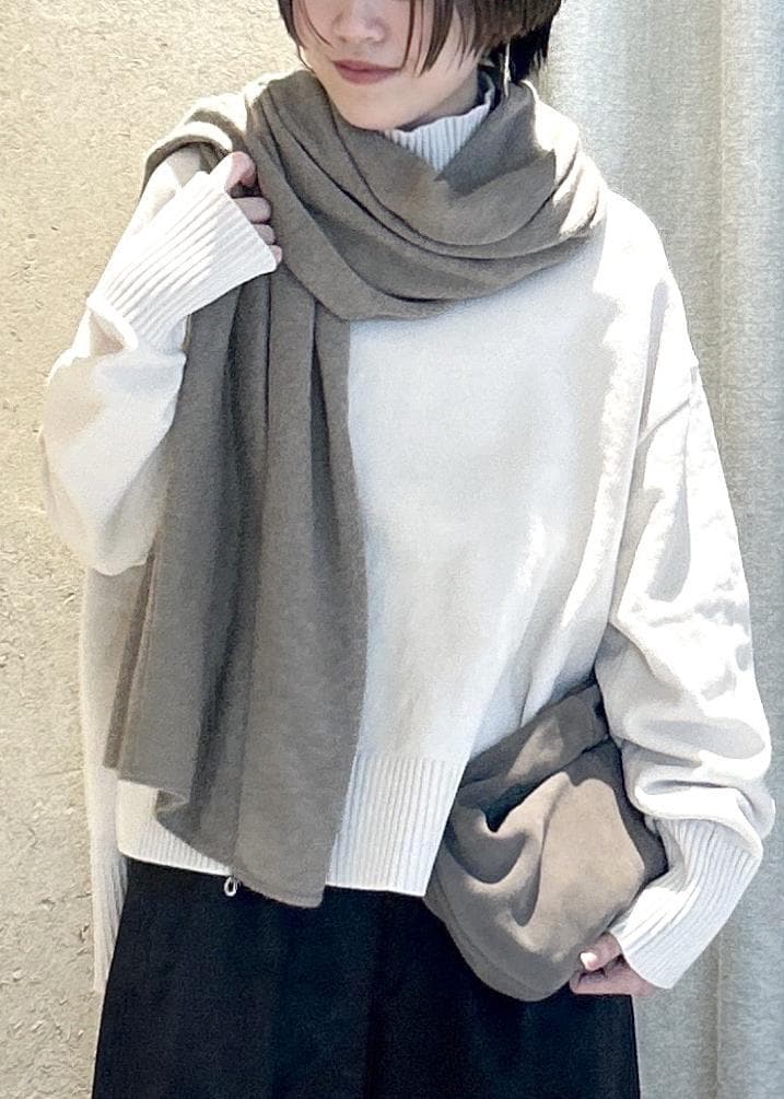 本格的にアウターを着る前の今の時期は、ニット1枚で大判のストールやマフラーを首元に巻くスタイルがおすすめ。