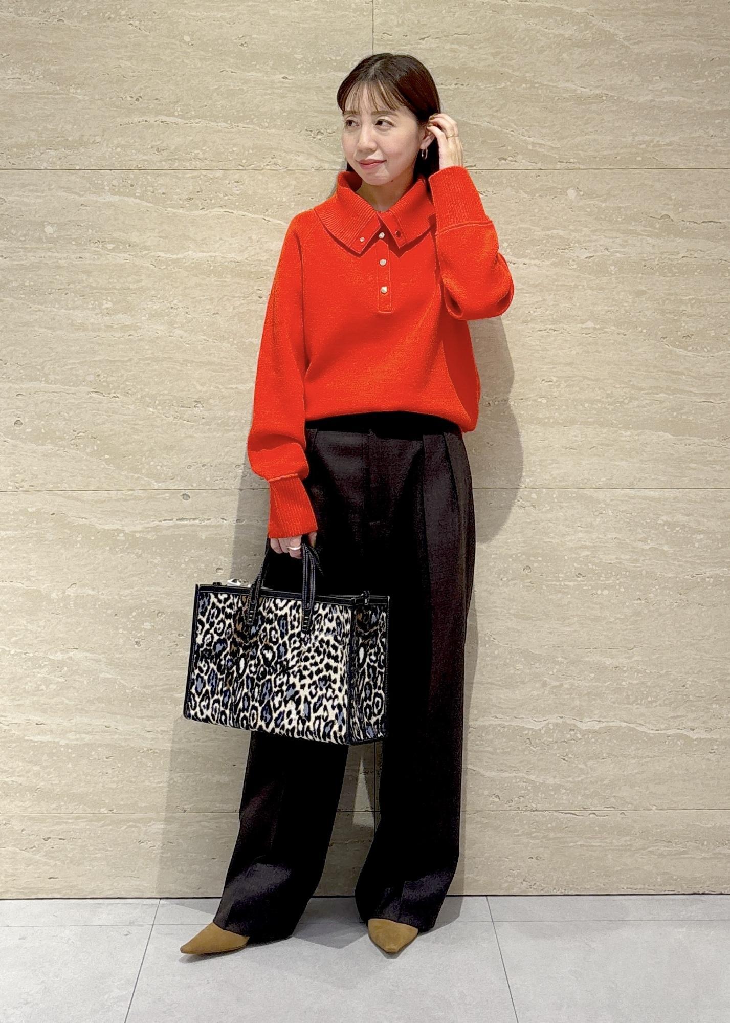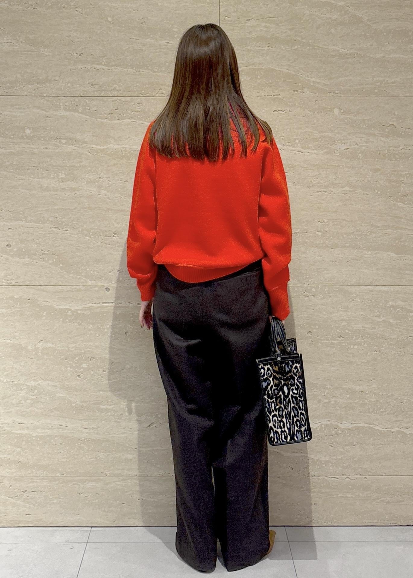鮮やかな赤のニットを主役にしたコーデです。