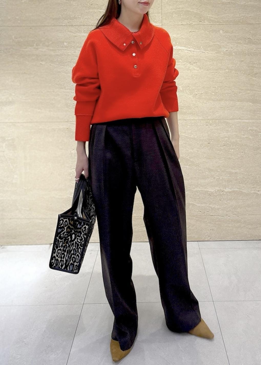 すっきり落ち感のあるブラウンのパンツを合わせることで、色の存在感を引き立つようにしました。