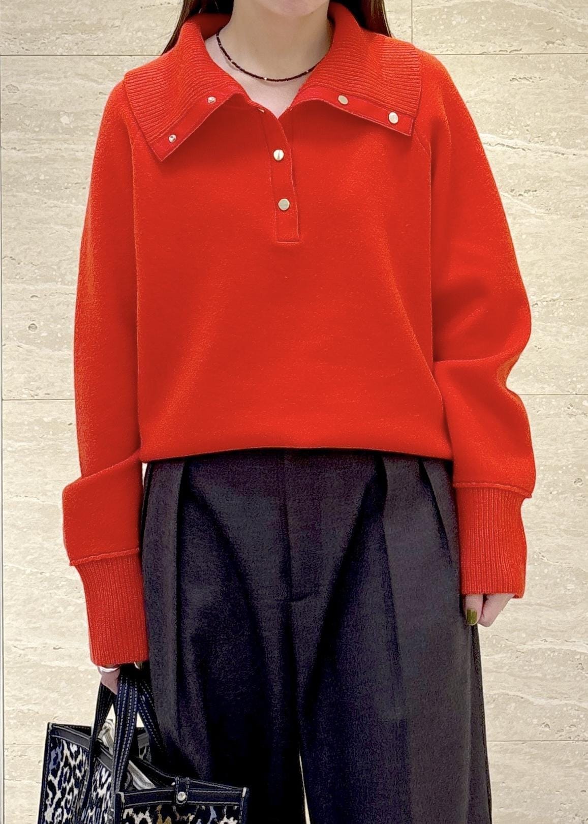 ROPÉ接結ウールドットボタンハイネックニット/イージーケアレッド / F¥28,600レビュー身幅や肩幅はゆとりがありますが、着丈が短めで腰骨の位置くらいでした。