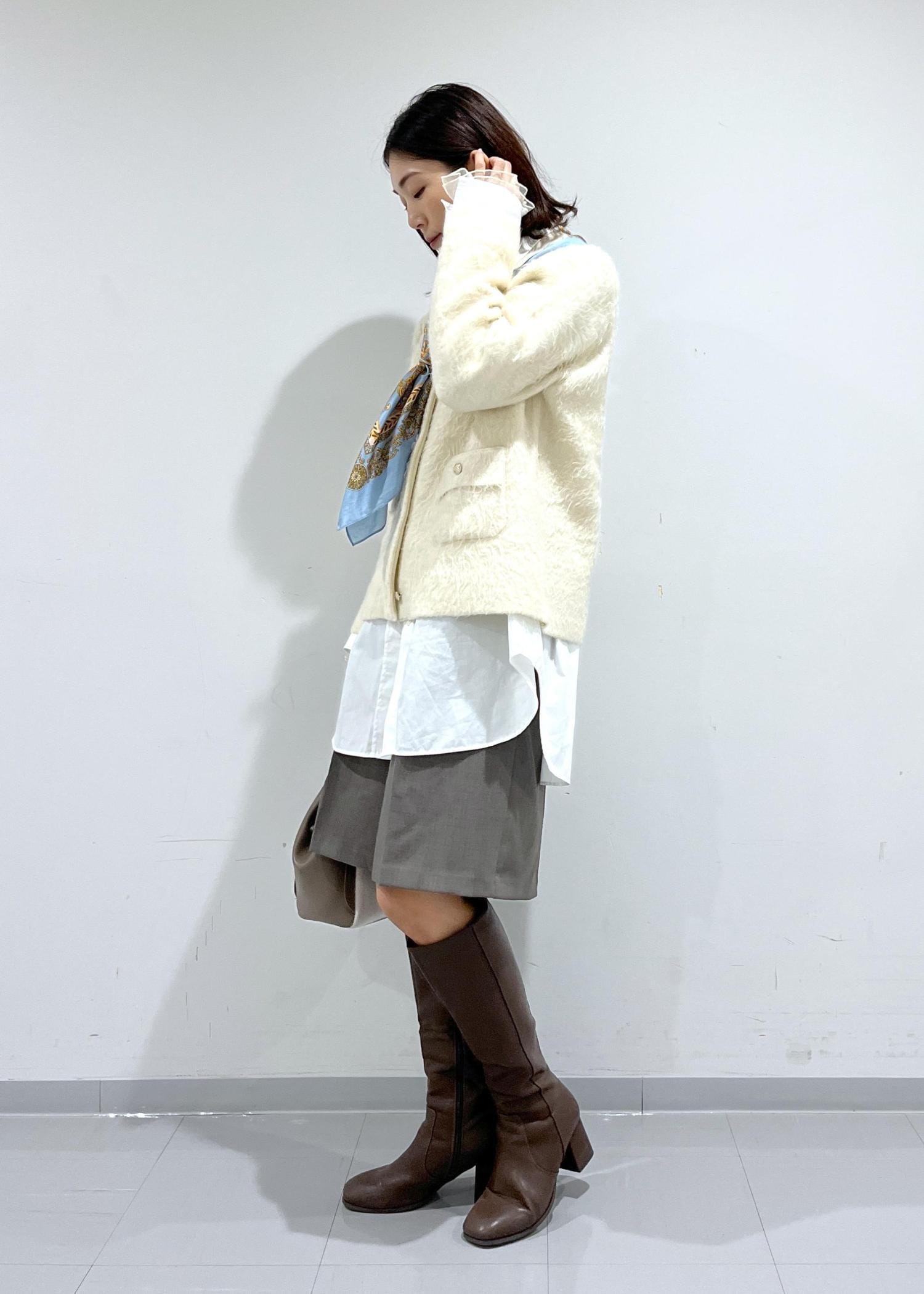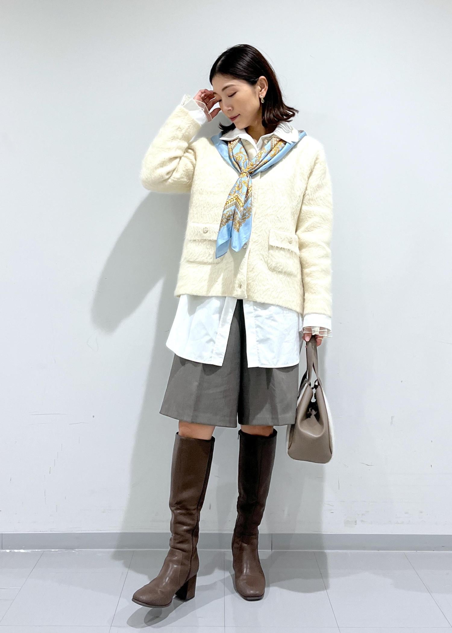 ロングブーツやスカーフ、袖チュールなど小物で大人レディな印象に。