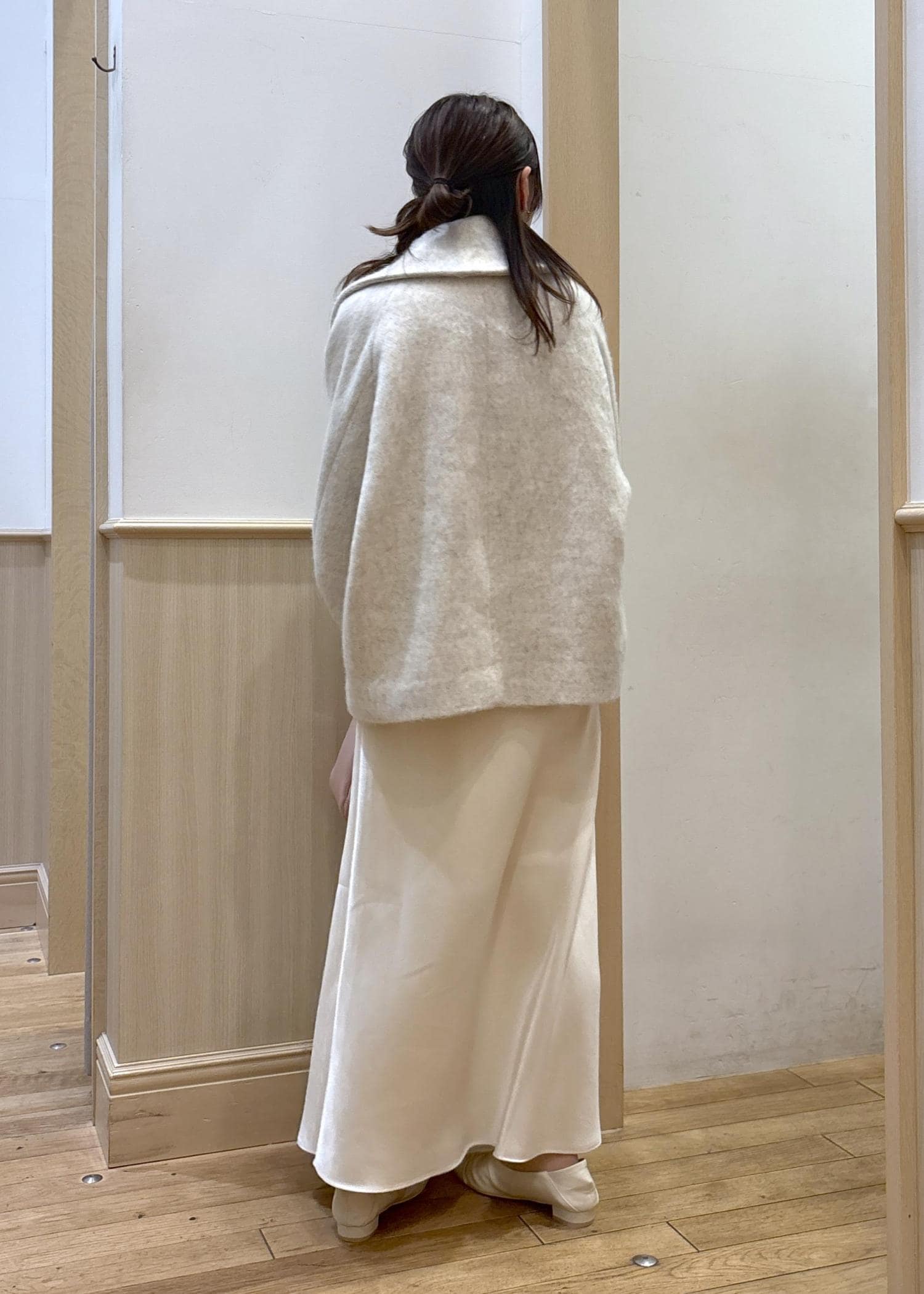 Mサイズだと、しっかり大きめなサイズ感ですが、ニットなど厚手のインナーアイテムの形を一切拾わず、見たままのアウターの綺麗な形で着用できます。 -