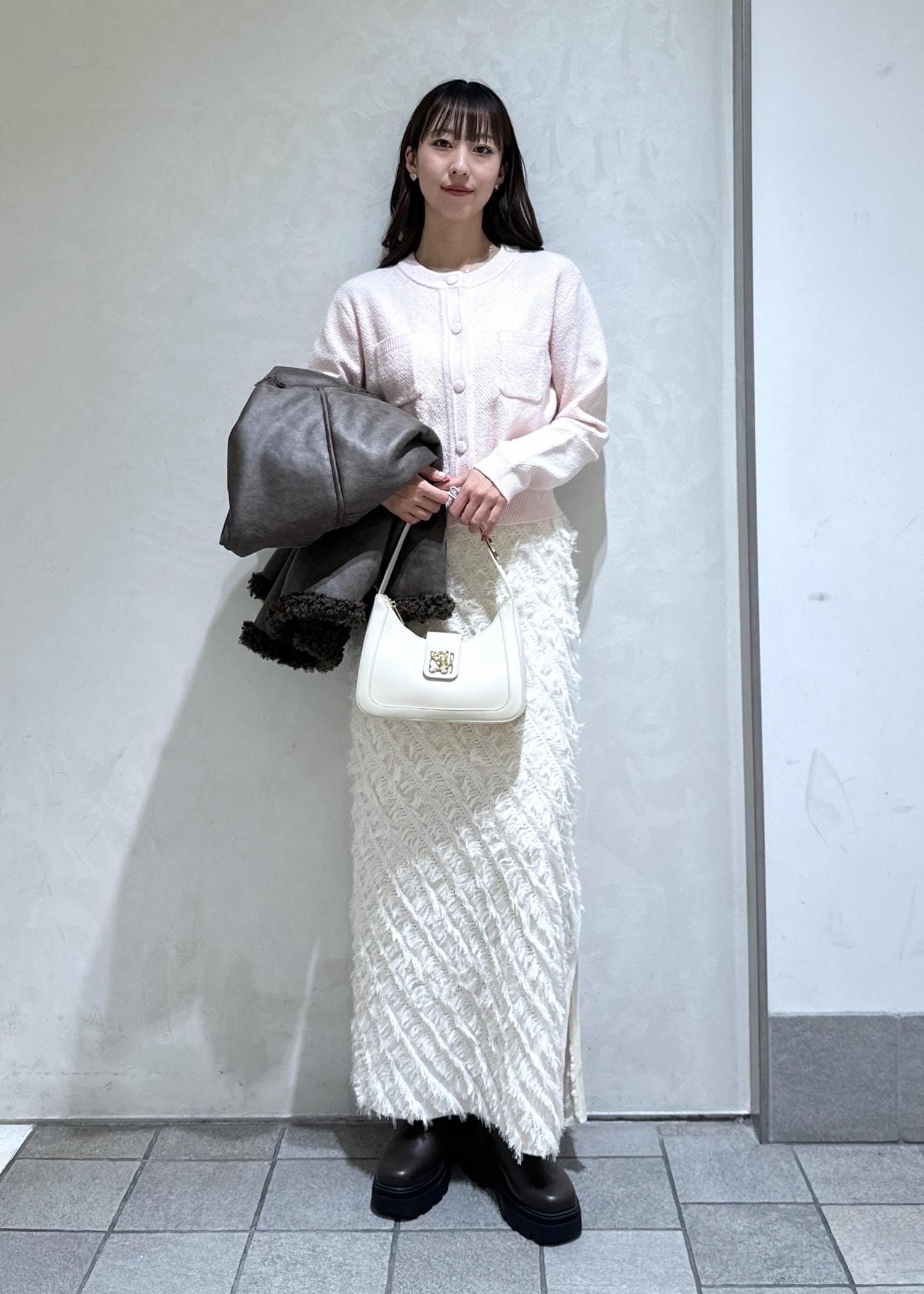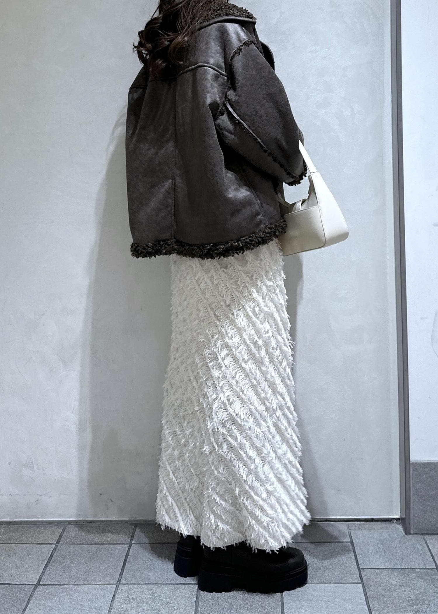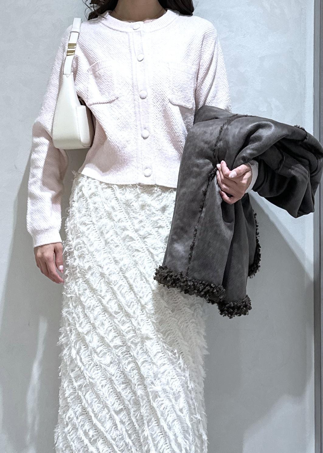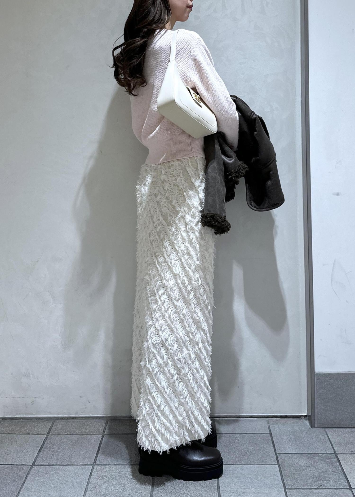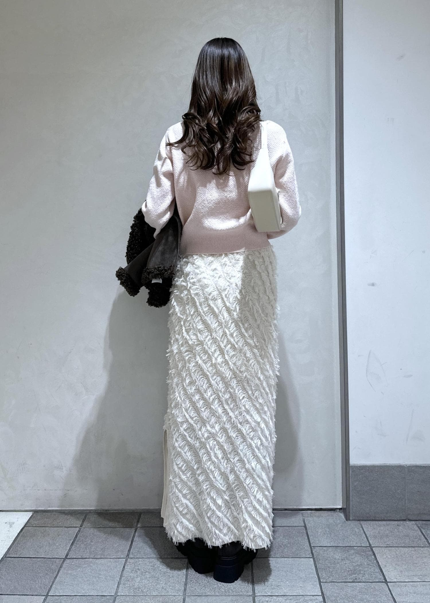 VISフリンジニットナロースカートキナリ / F¥6,589レビューサイドにスリット入っていて歩きやすいです!丈間はくるぶしが見える長さになりました!裏地もしっかり付いているので透け感も心配ありません。