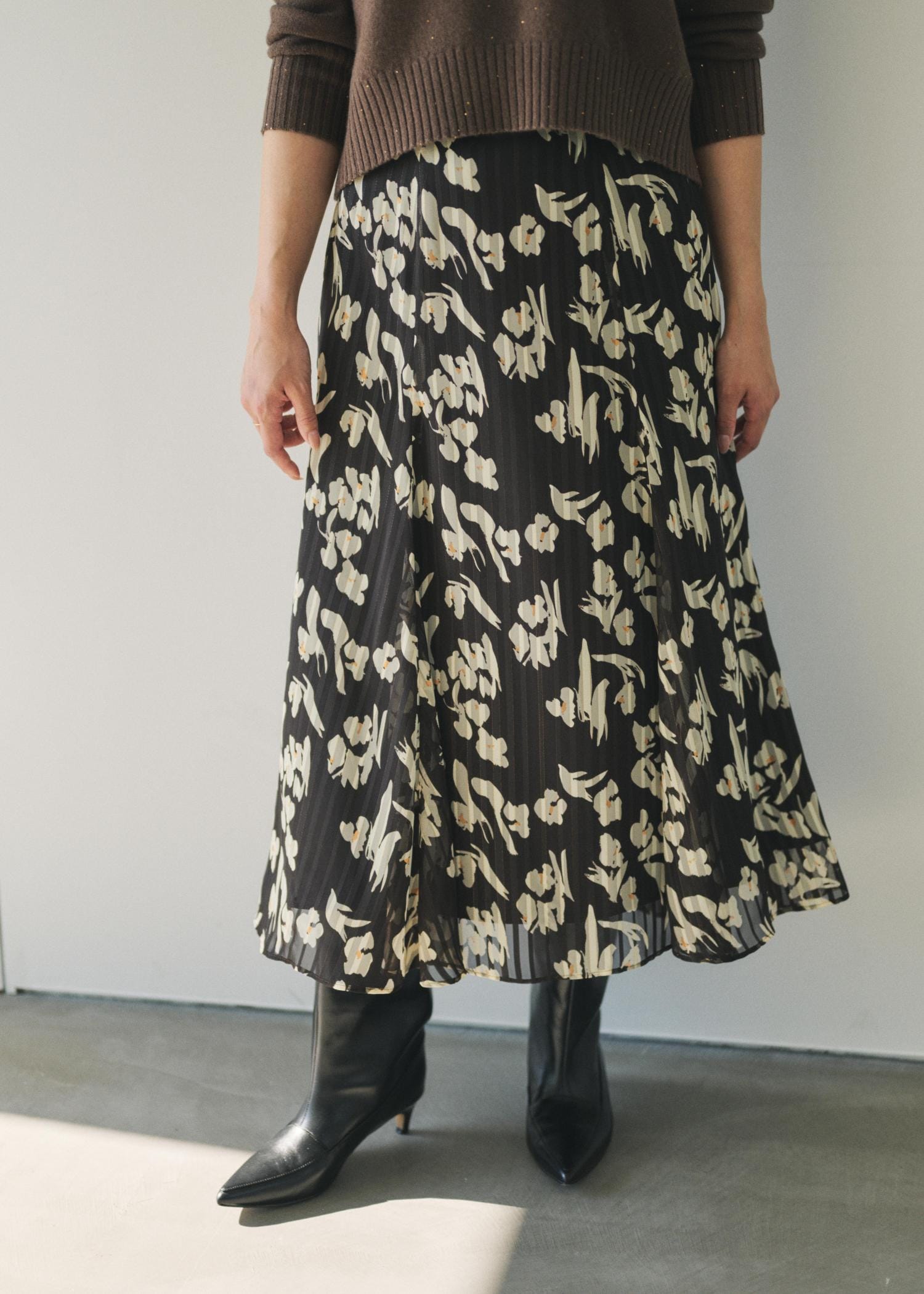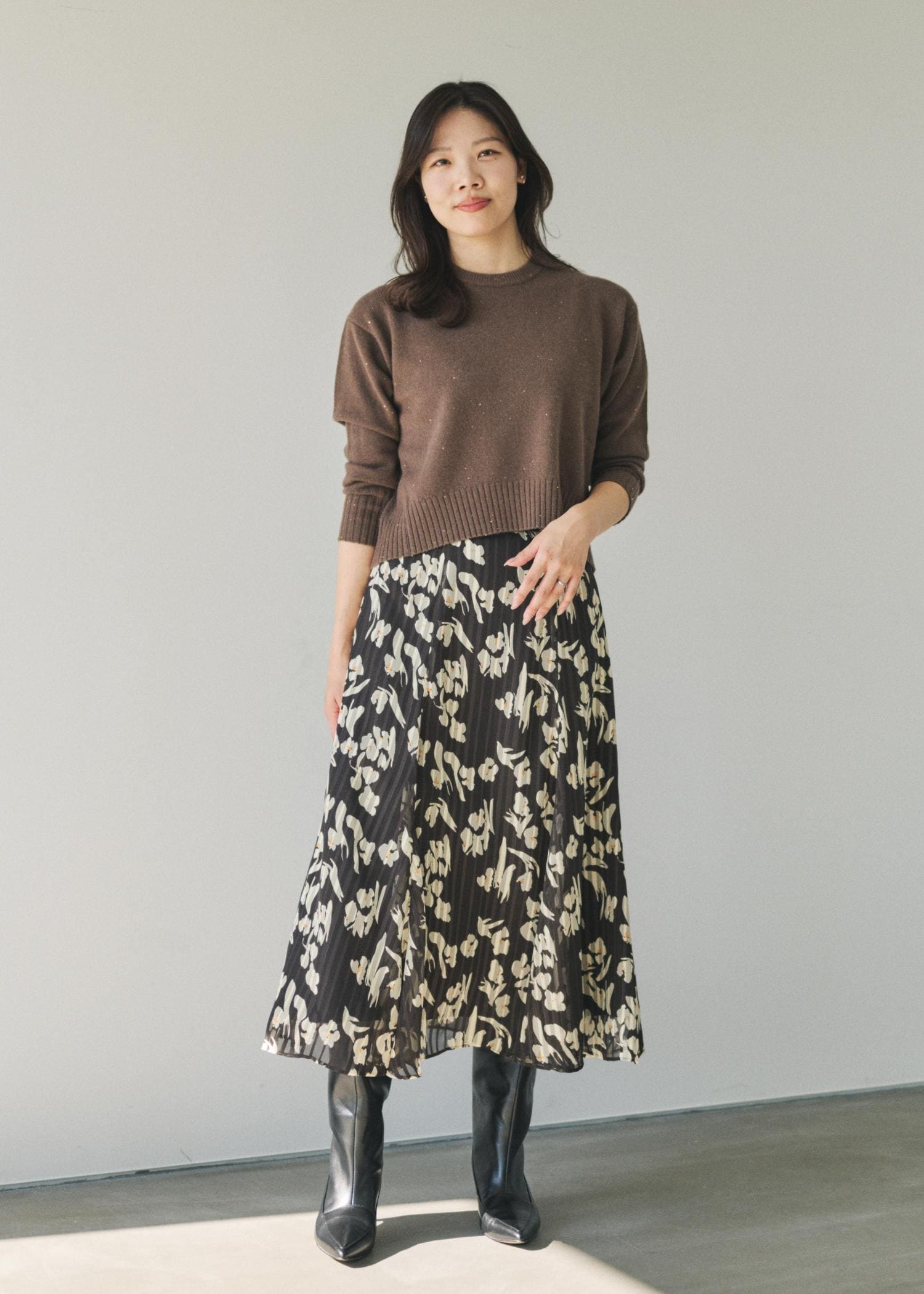 ボトムは大胆な花柄が目を引くプリーツスカート。