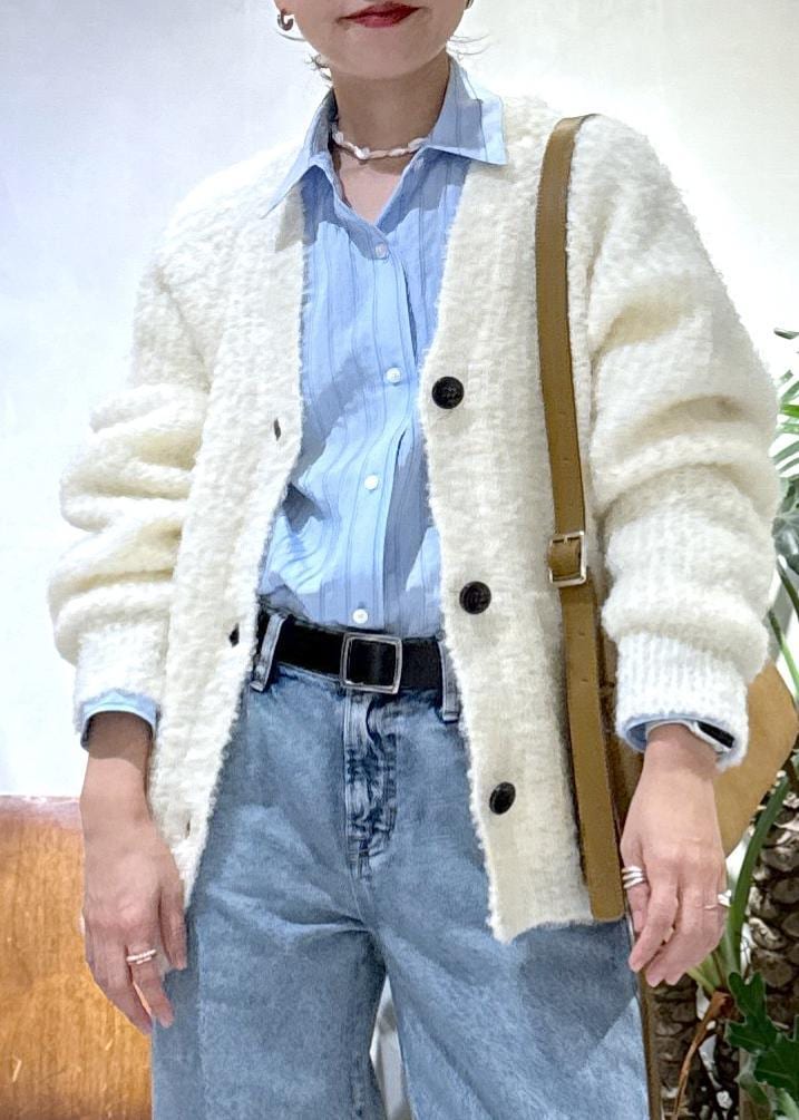 ブルーのワントーンコーデにふわふわのホワイトのカーディガンブルゾンで、スタイリングしました!