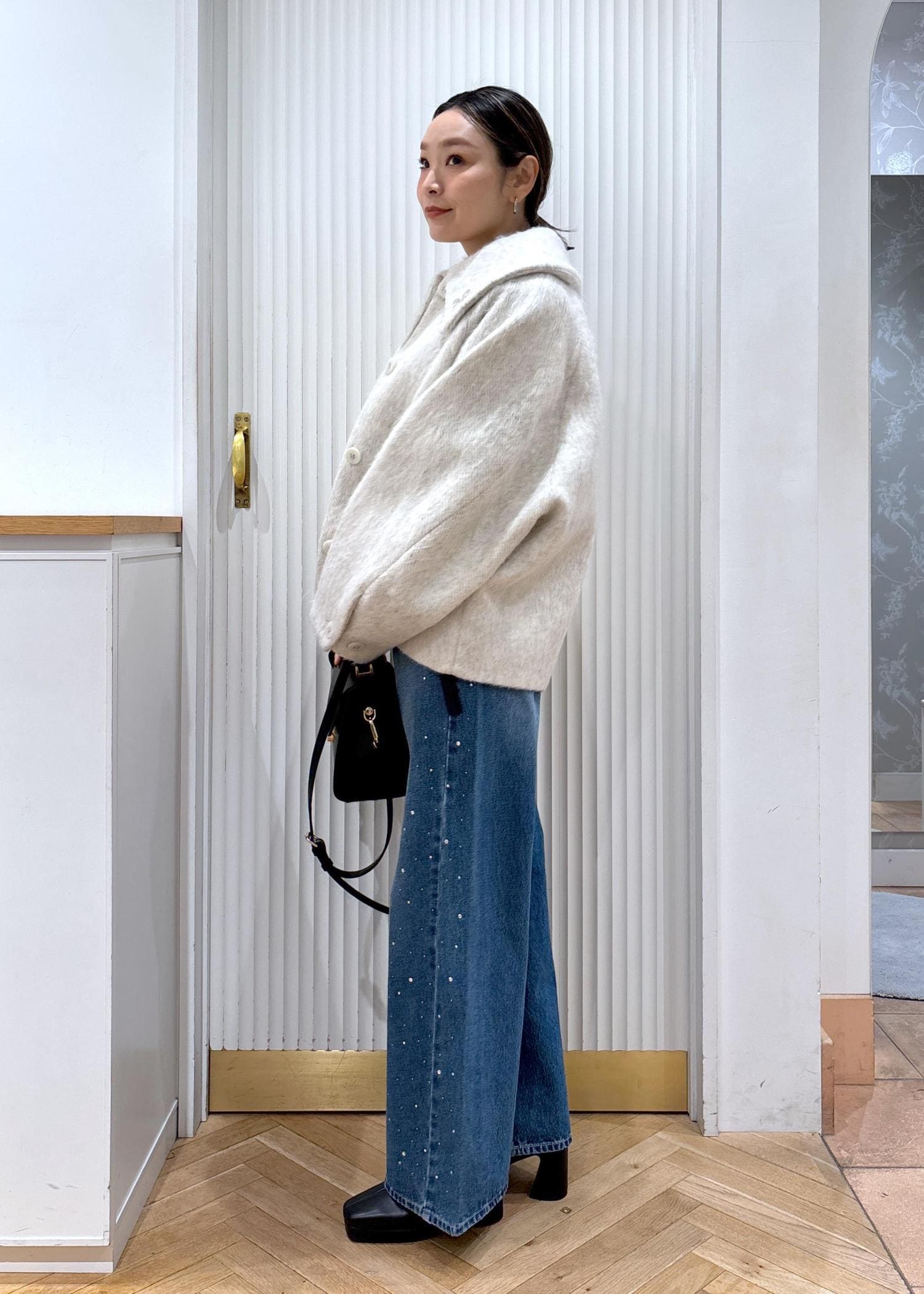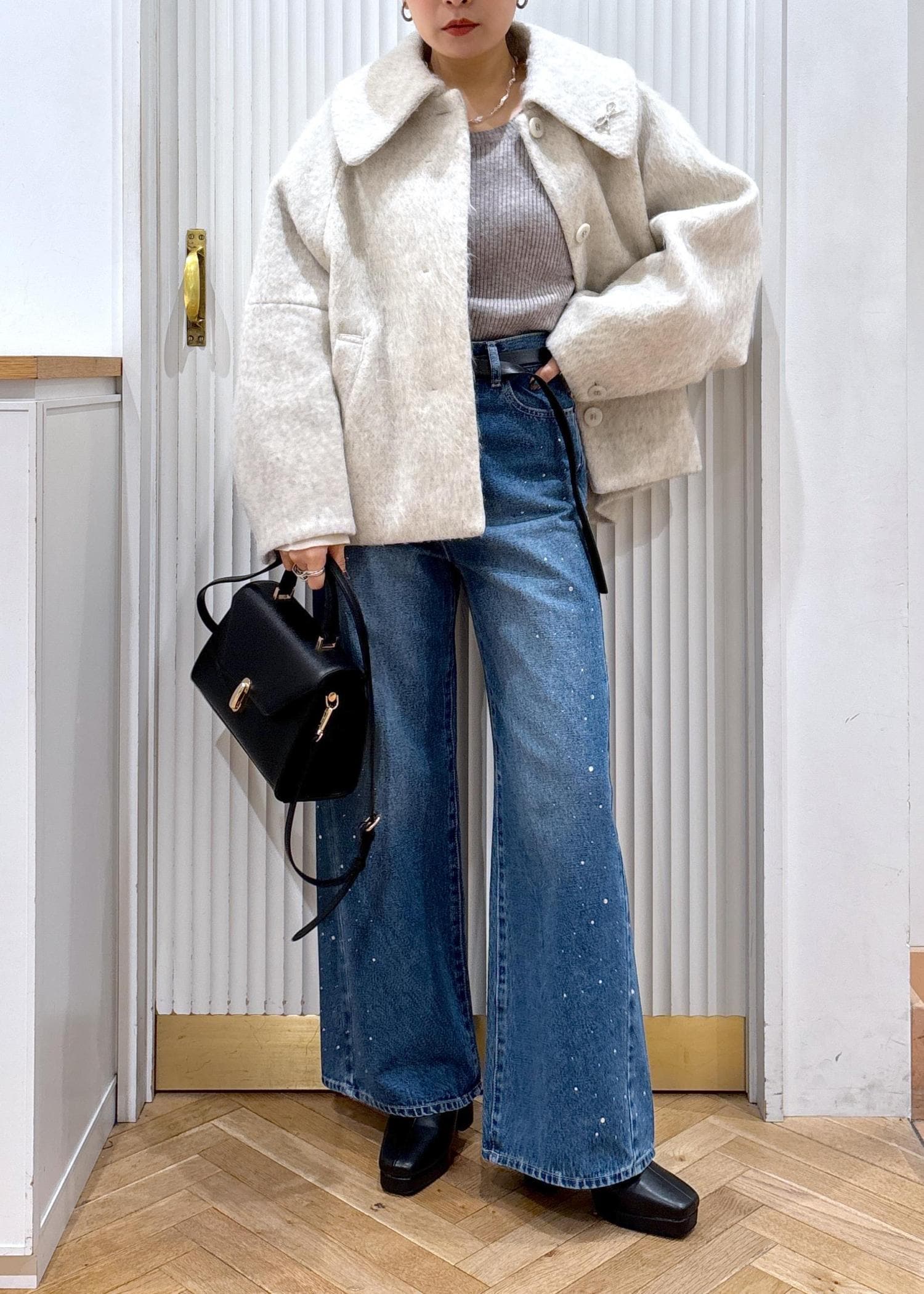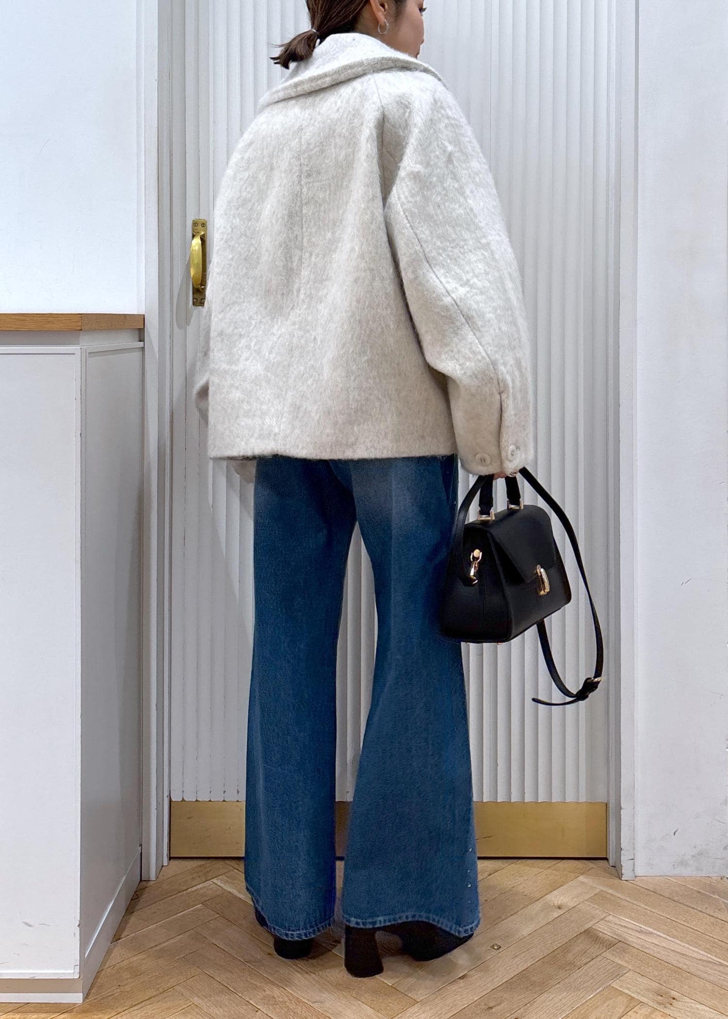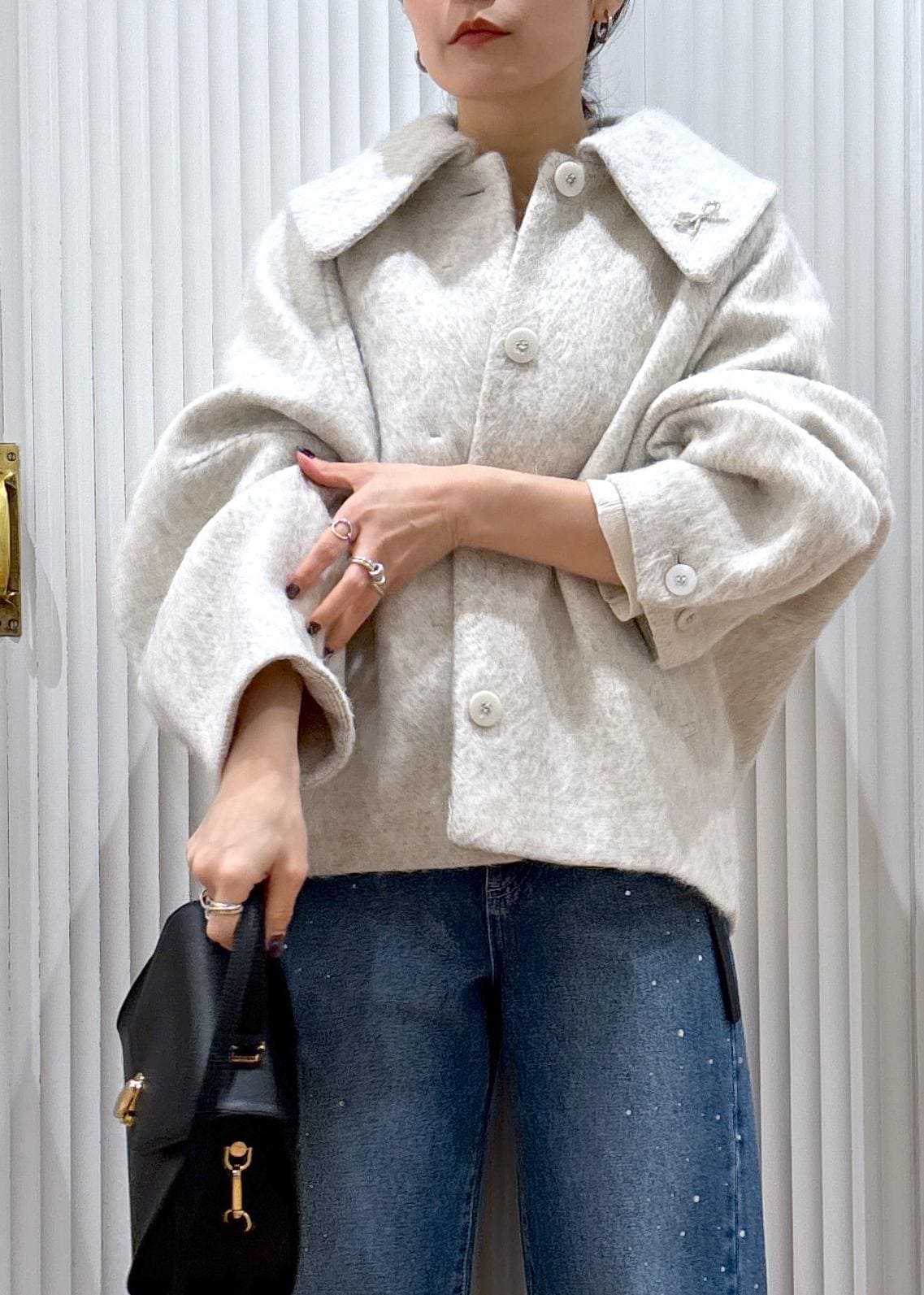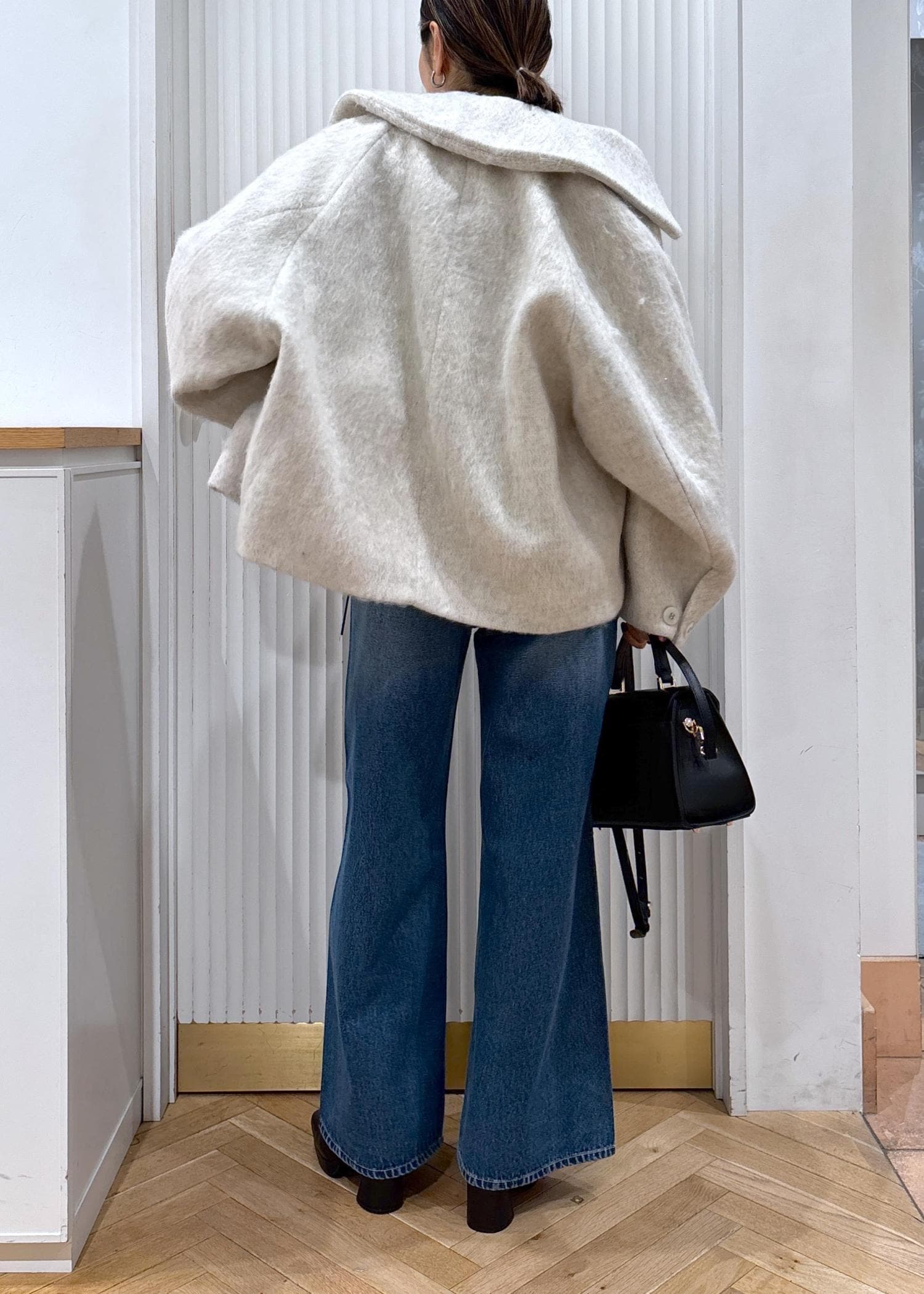 今回は在庫僅かになってしまったモモンガコートのオフホワイトをカジュアルにデニムと合わせたコーデ♡