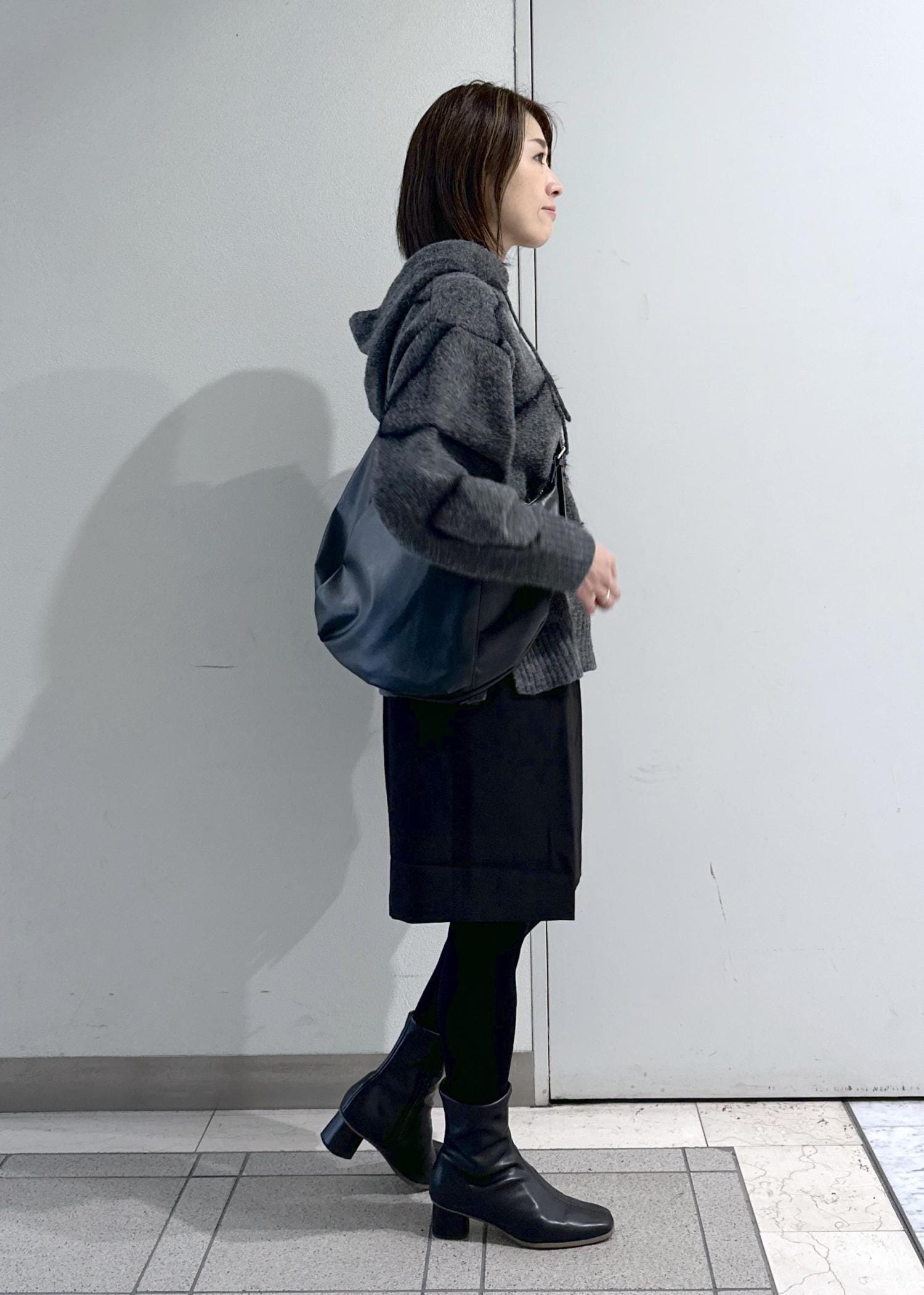 ゆとりのあるサイズ感で体のラインを拾いません。着丈は腰まわりにかかる位の長さでパンツでもスカートでも合わせやすいです。 -