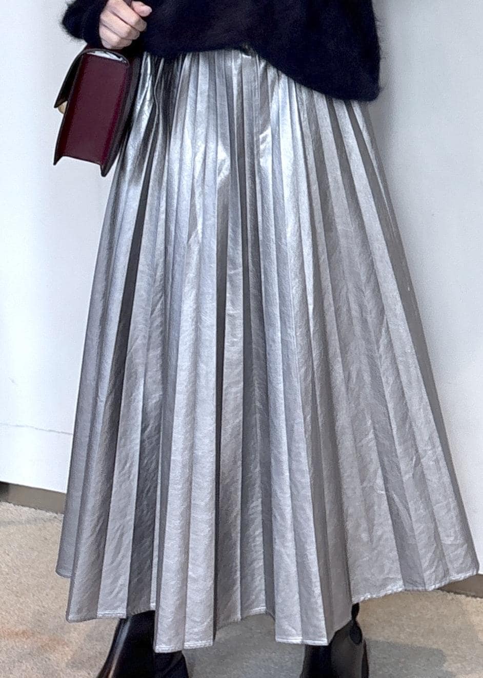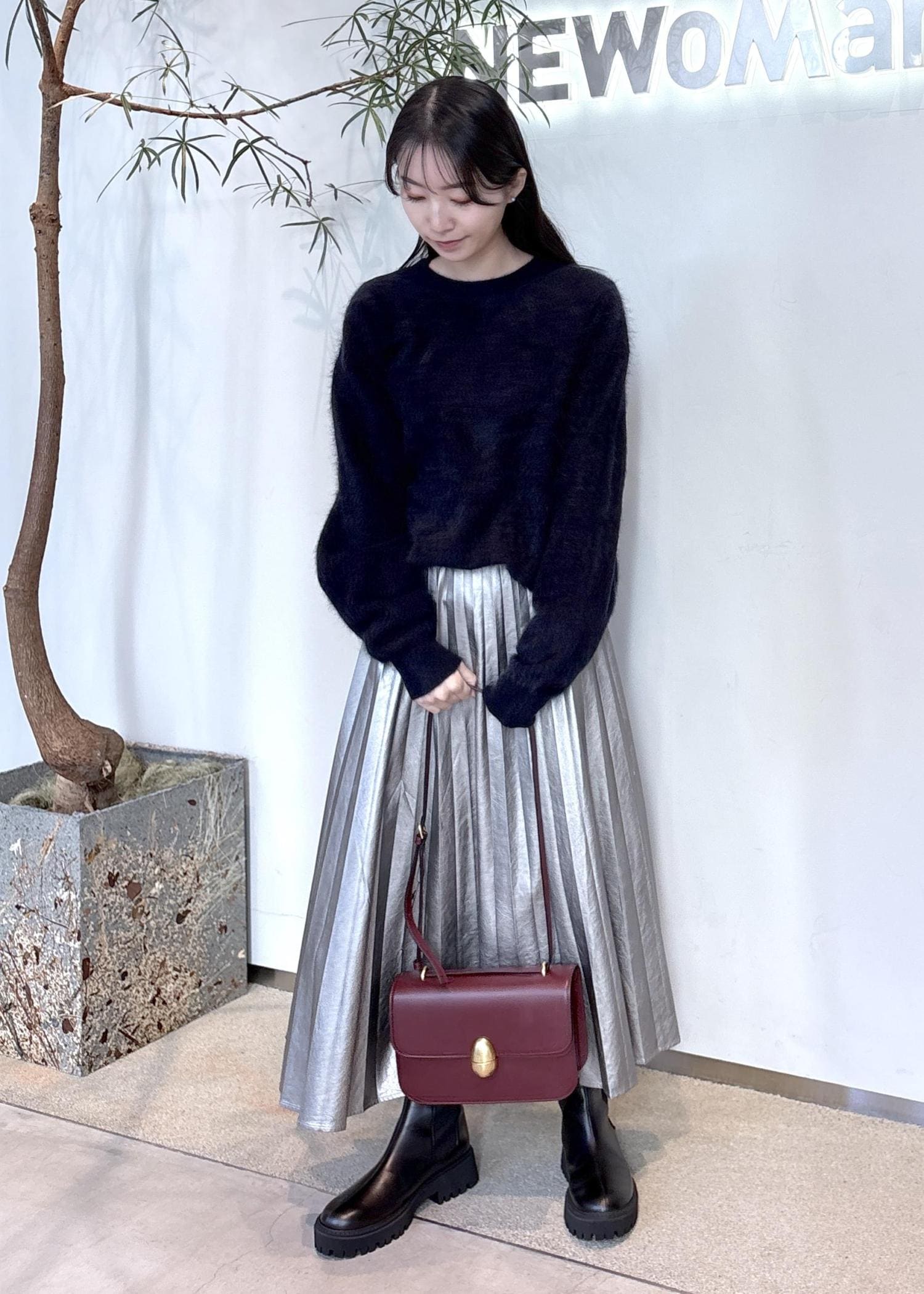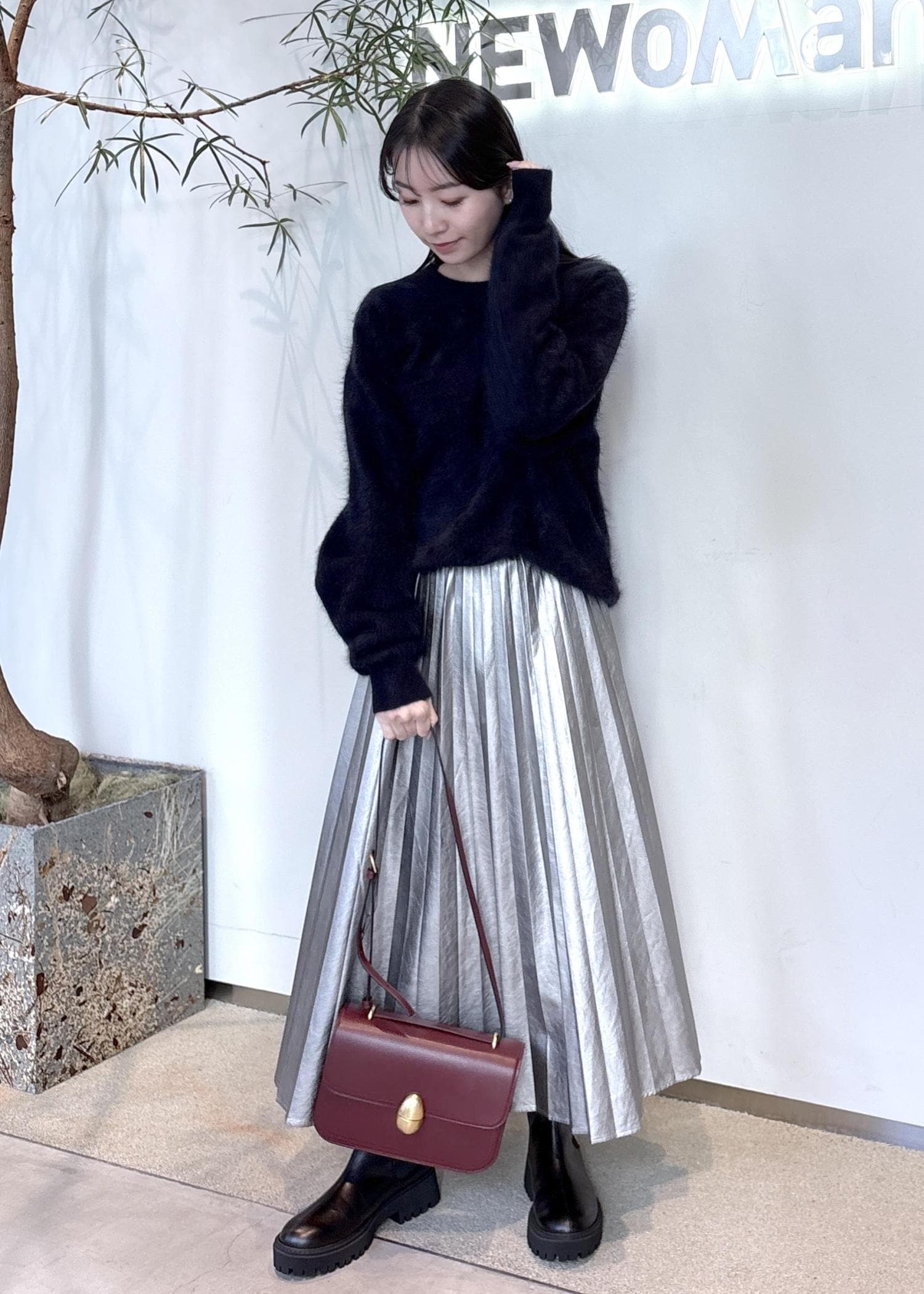 メタリックのスカートが華やかさを出してくれるので、ニットを合わせるだけで一気にこなれた雰囲気にしてくれます。