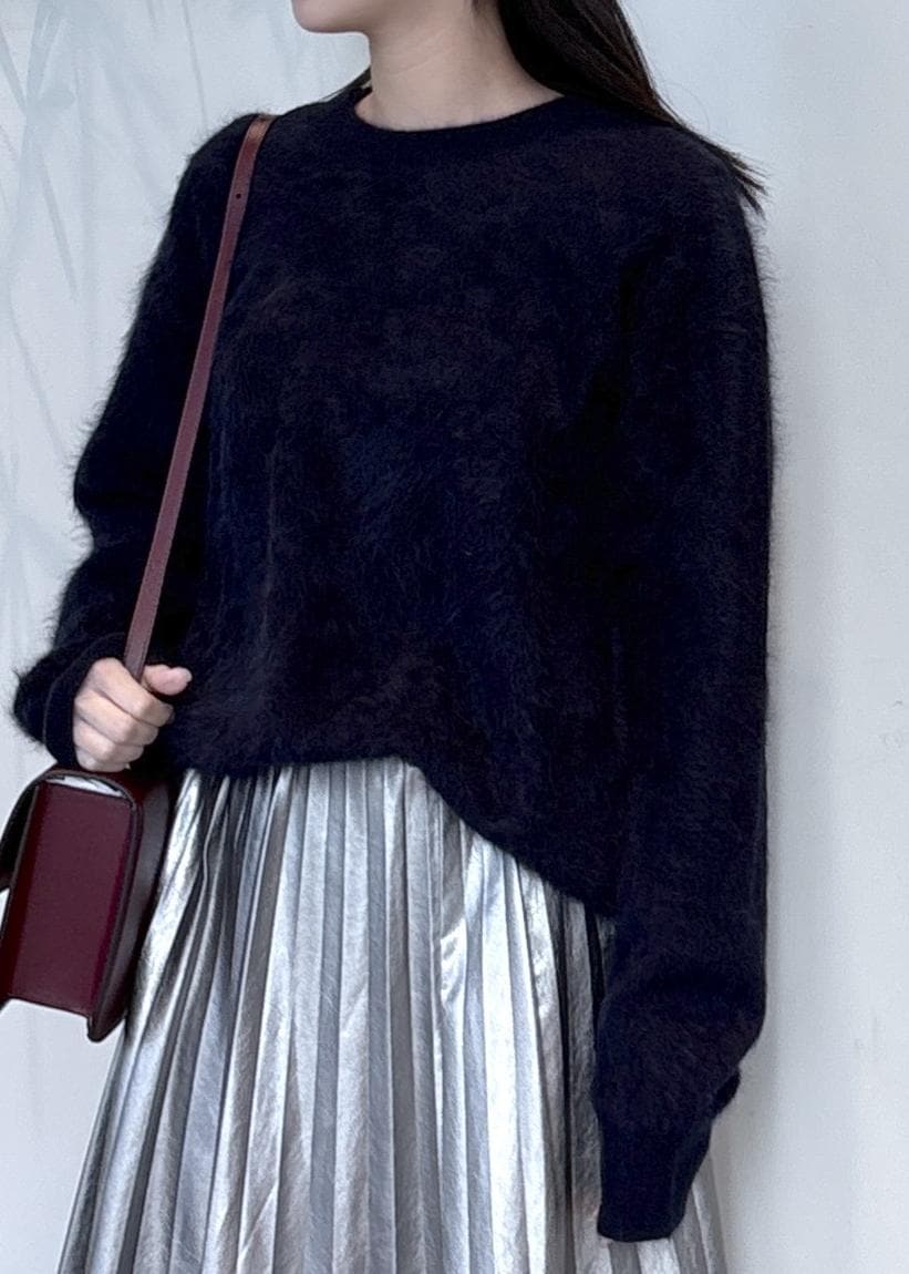 黒ニットにシルバープリーツを合わせた大人のシンプルコーデに仕上げました。